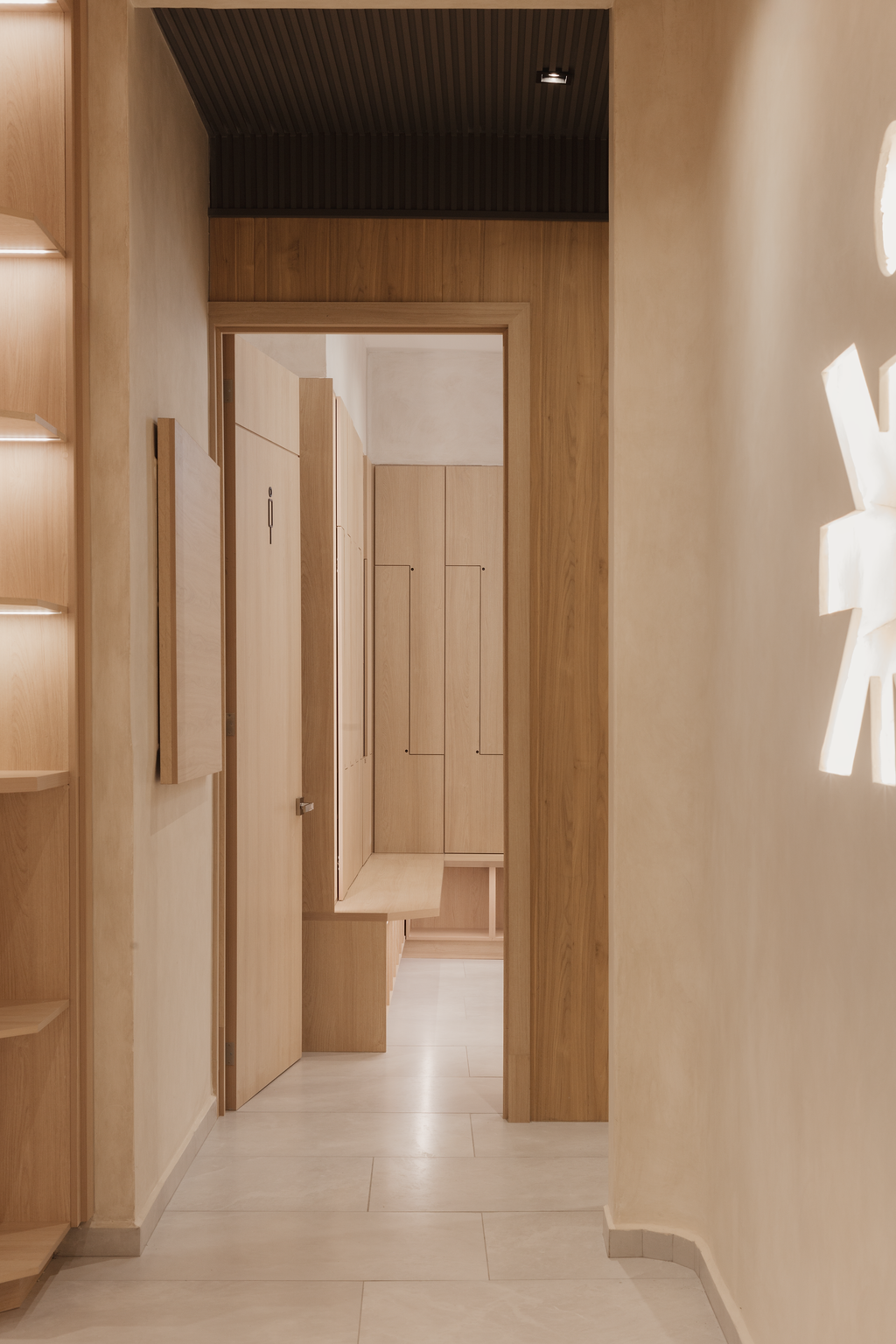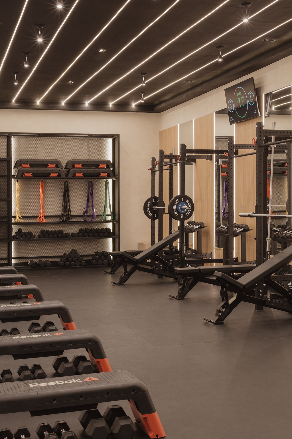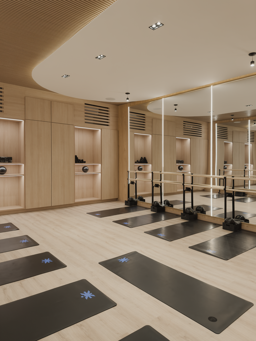 On the upper level, the barre studio employs light accents on the wall and ceiling offering a warm uplifting sensation, mirrors reflecting the interior serves both for the technique and the overall aesthecic, creating a softer ambiance that enhances concentration and focus. The richness of wood underfoot provides stability and support, vital for the strength training sessions that follow.