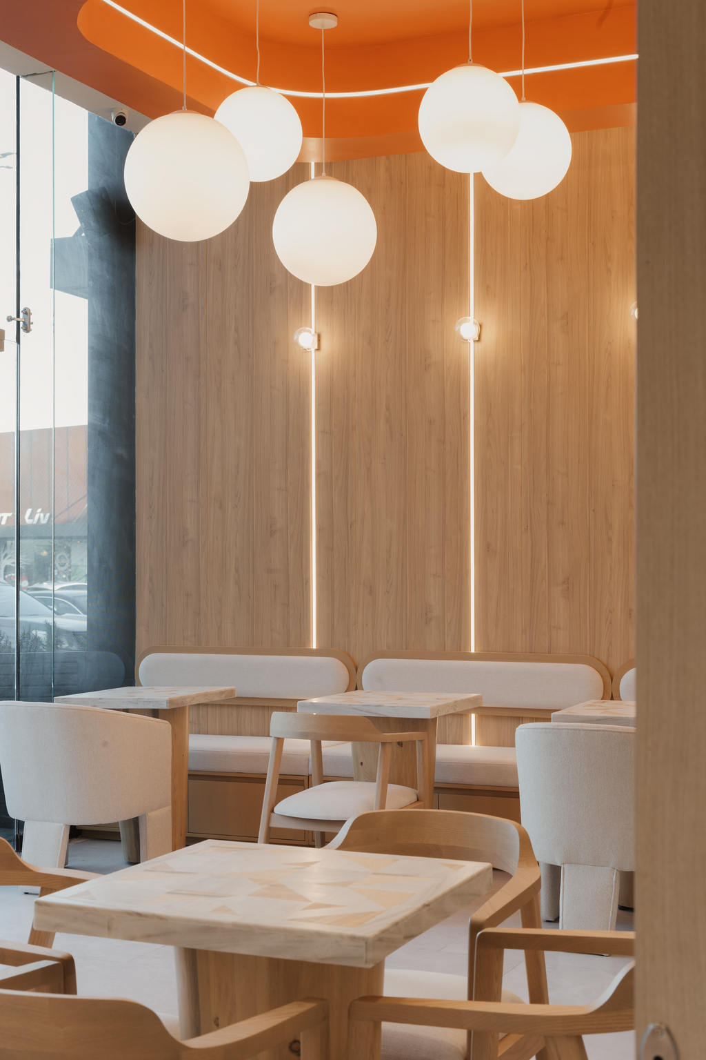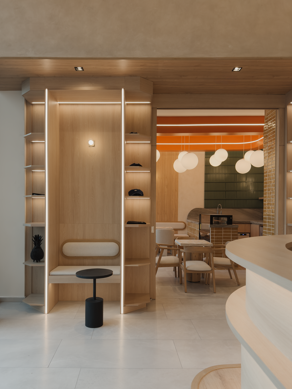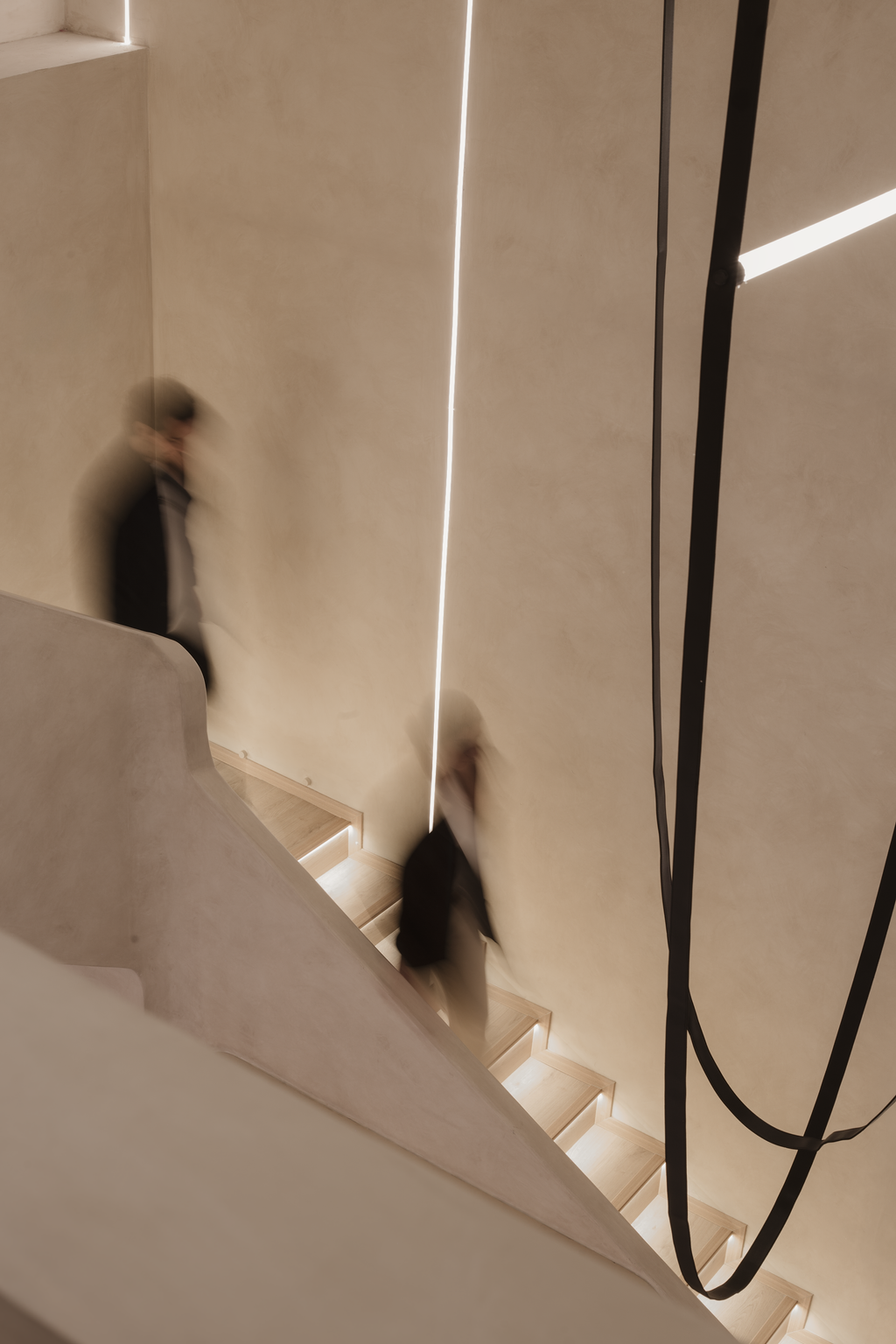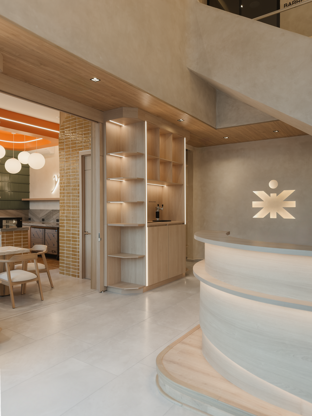 On the upper level, the barre studio employs light accents on the wall and ceiling offering a warm uplifting sensation, mirrors reflecting the interior serves both for the technique and the overall aesthecic, creating a softer ambiance that enhances concentration and focus. The richness of wood underfoot provides stability and support, vital for the strength training sessions that follow.