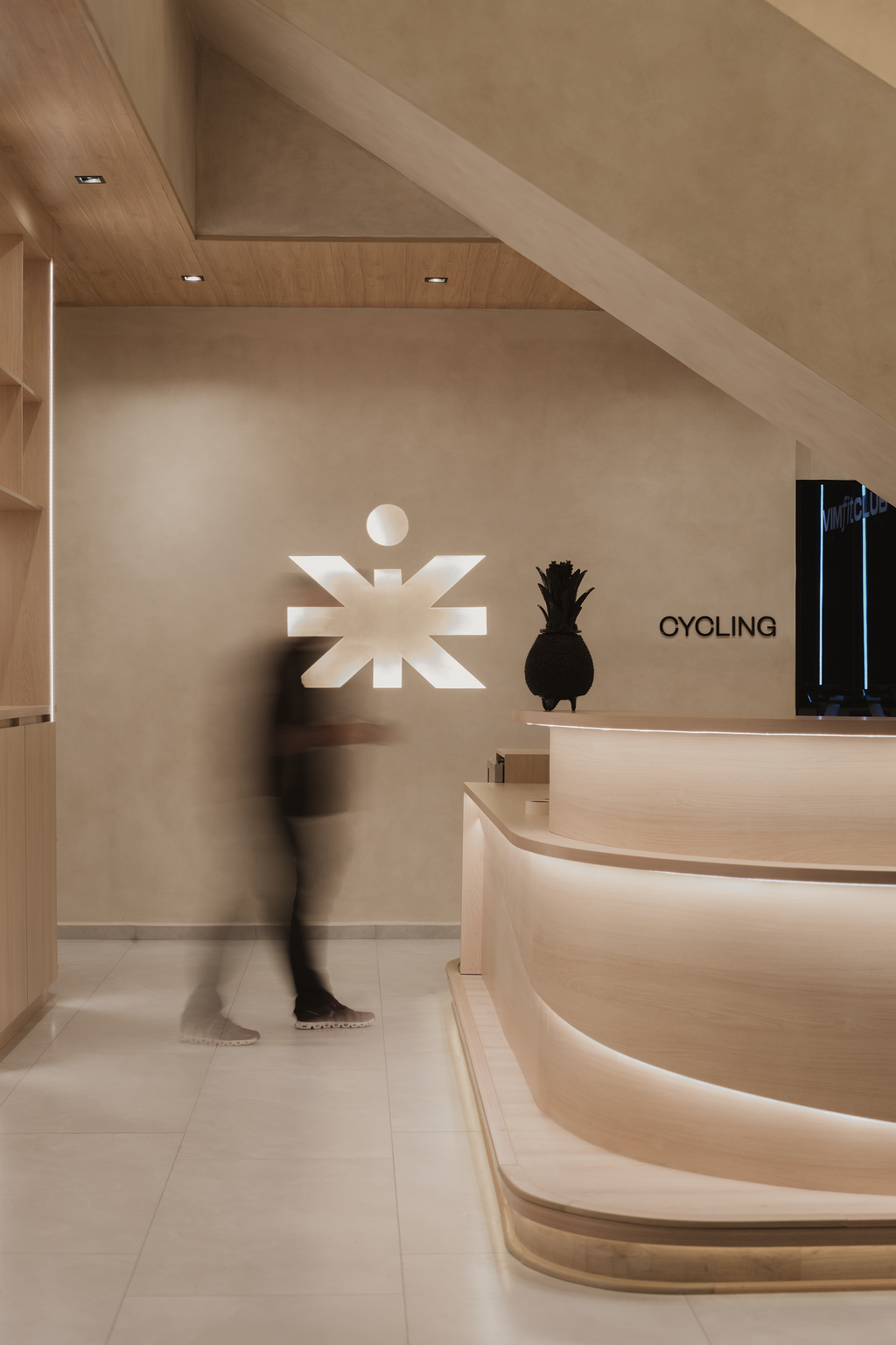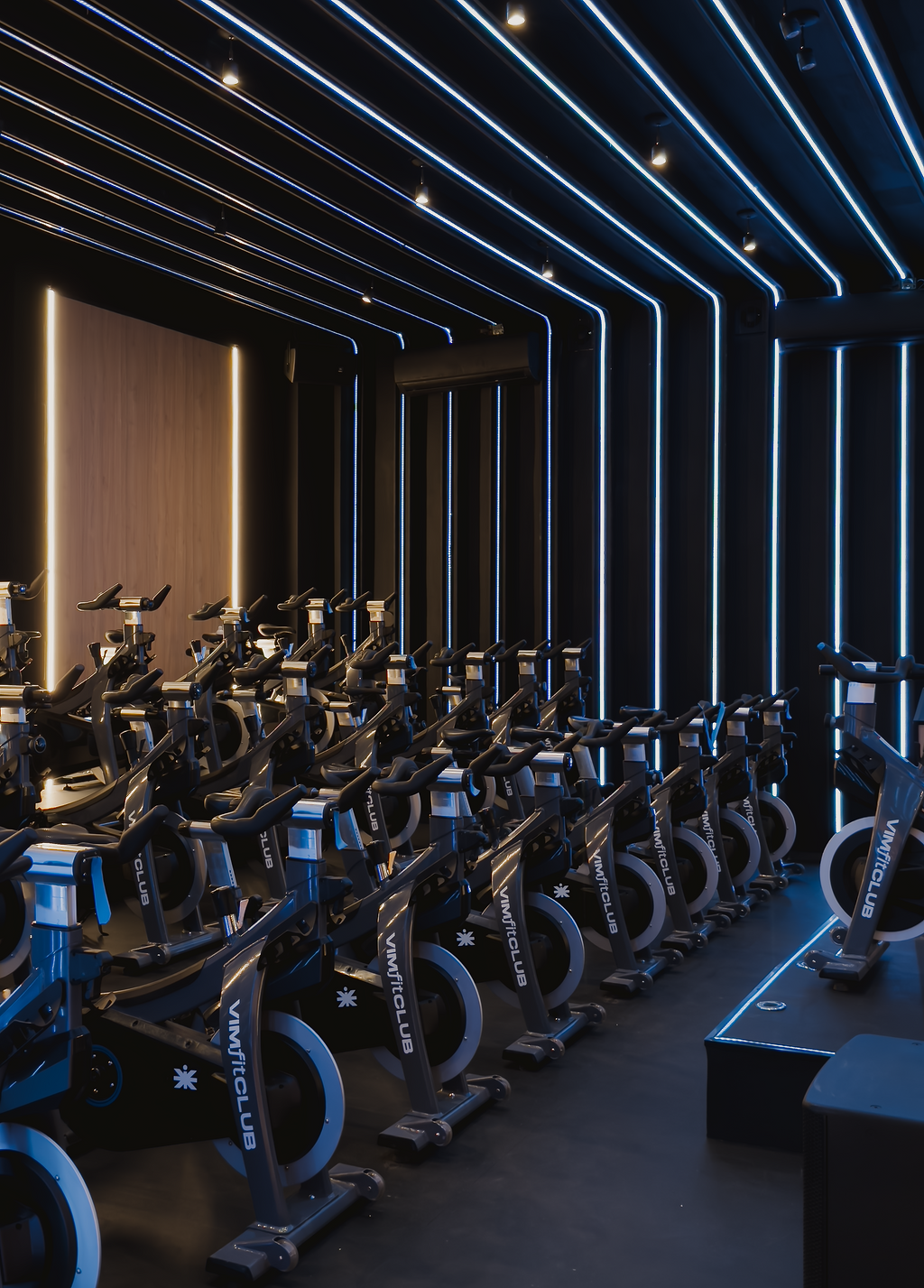 The cycling studio, with its intimate lighting and sound-absorbing wood walls, creates an intense atmosphere that invigorates participants.Here, members are not just cyclists; they become part of an energetic collective, inspired by the same goal: wellness.