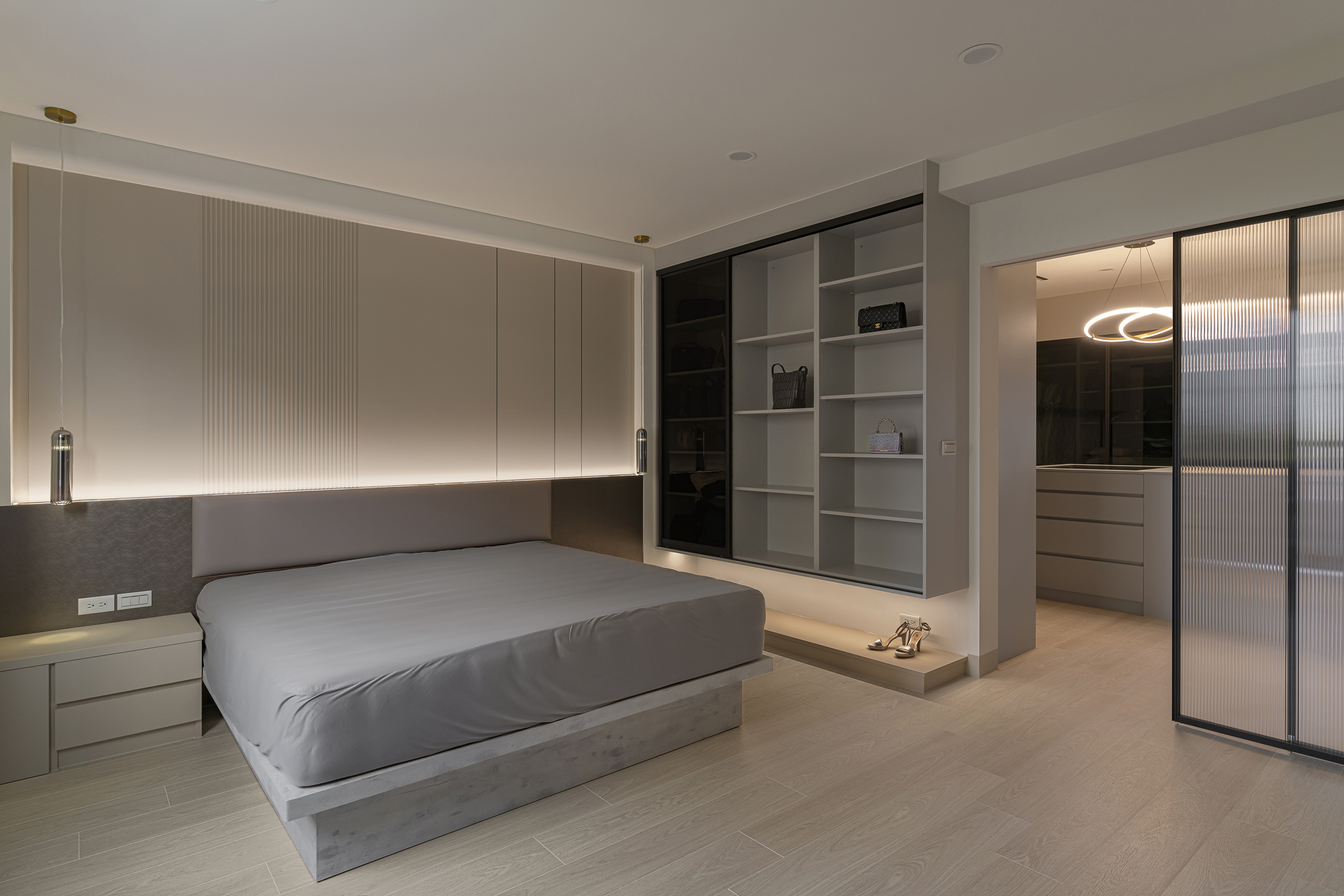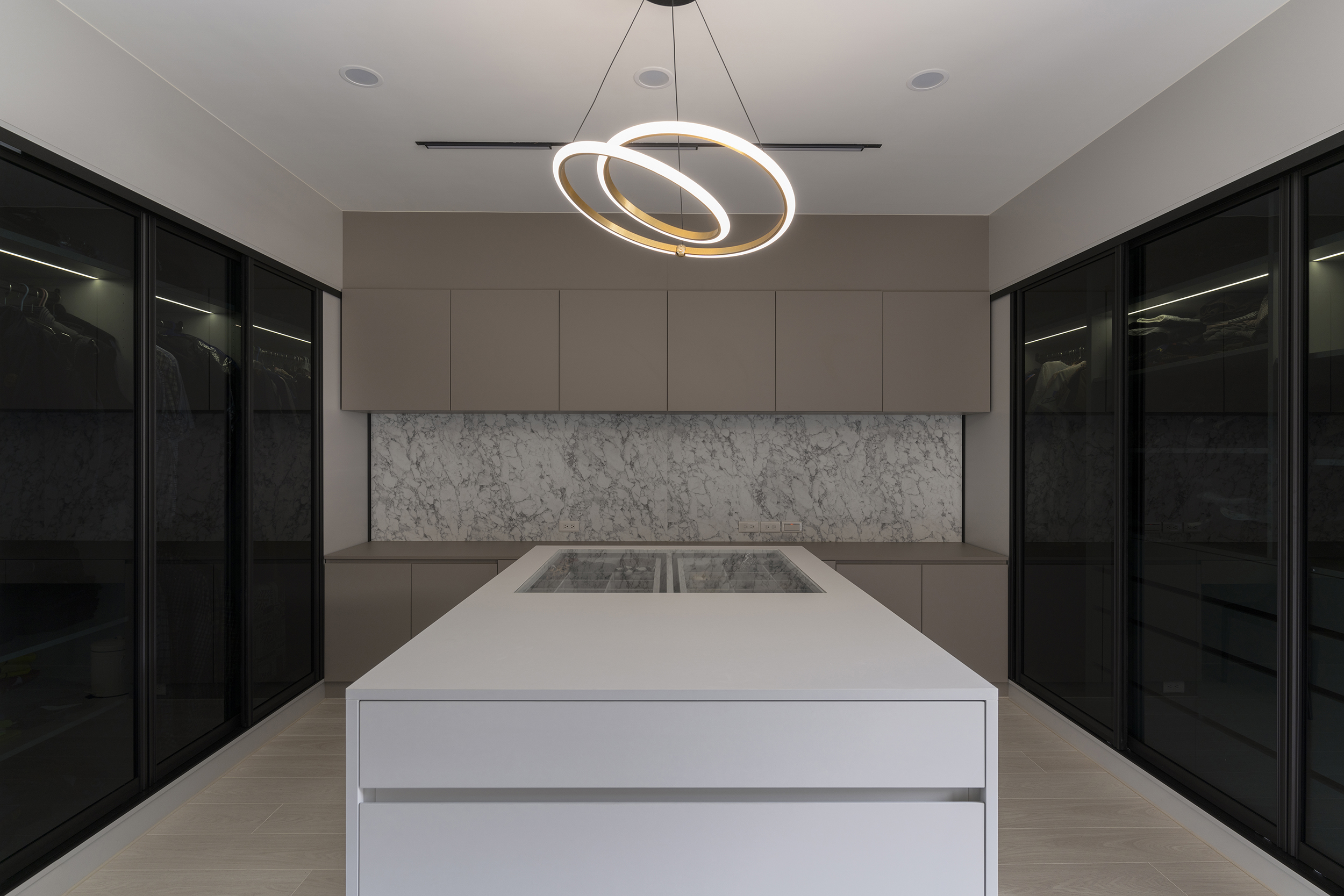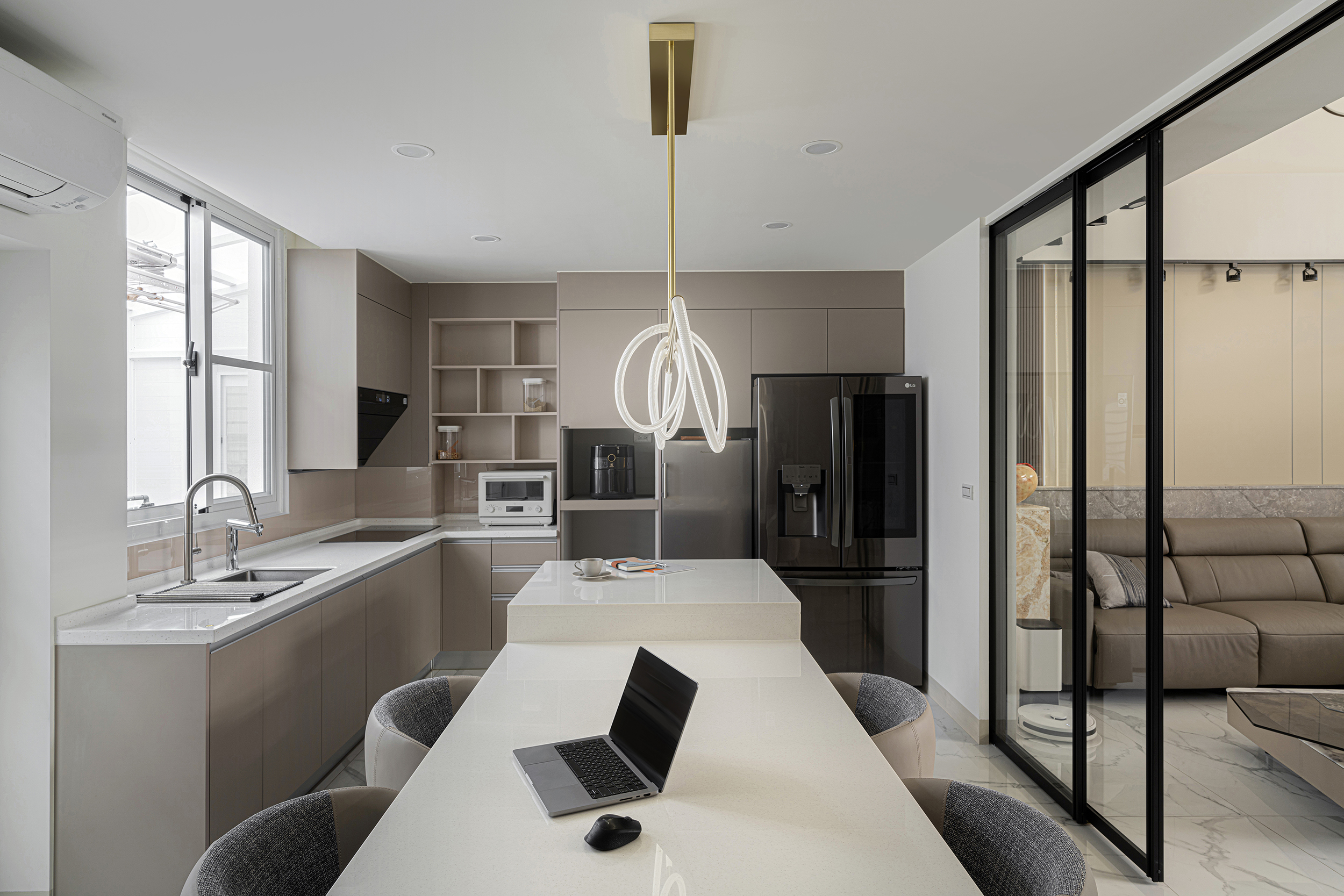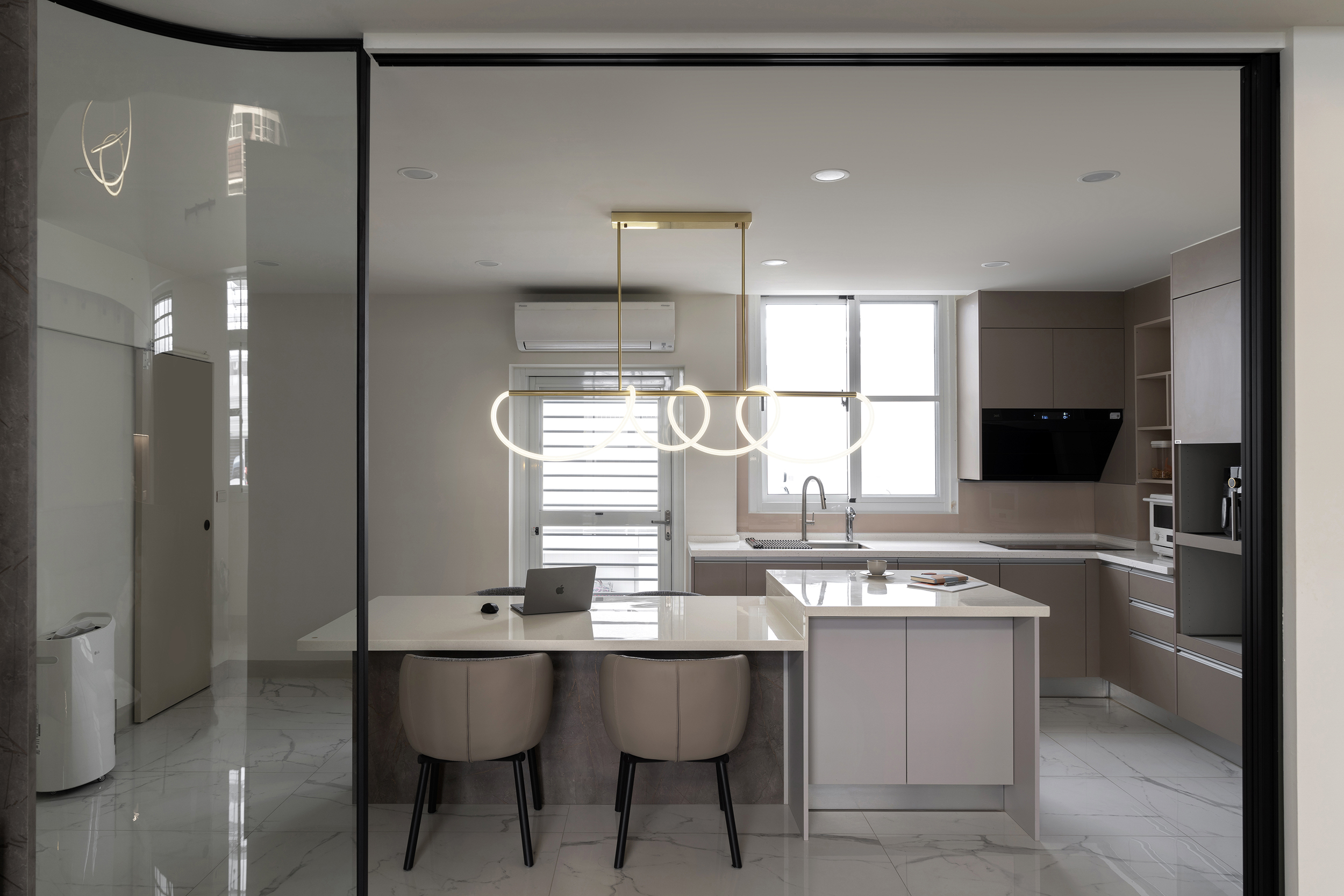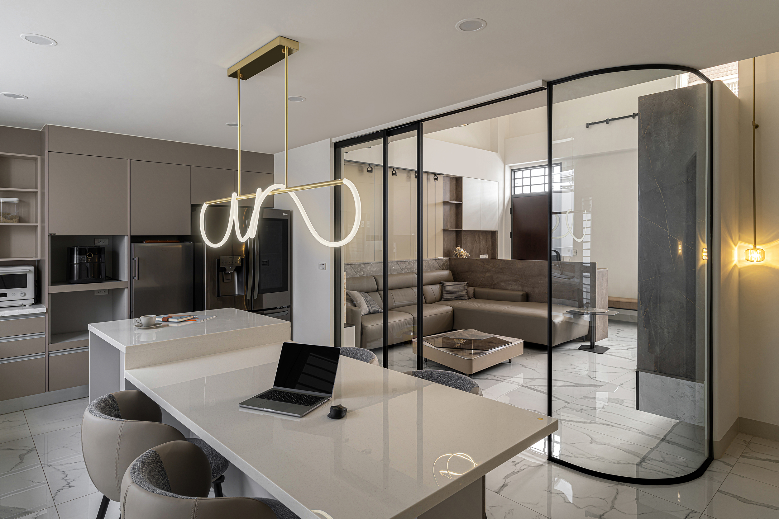 With one of the residents experiencing limited mobility, this multi-generational townhouse was redesigned with a strong emphasis on universal design that ensures all four family members can live safely and comfortably, for now and in the years to come. The ground floor now features an open layout encouraging effortless movement and seamless wheelchair accessibility. A newly added elevator greatly enhances vertical circulation, offering convenience and safety. In the kitchen area, a full-height glass partition is elegantly placed at the corner to eliminate the danger of accidental bumping while contributing to the brilliance and sleekness. This gentle design gesture enhances safety and aesthetics, visually opening the space.