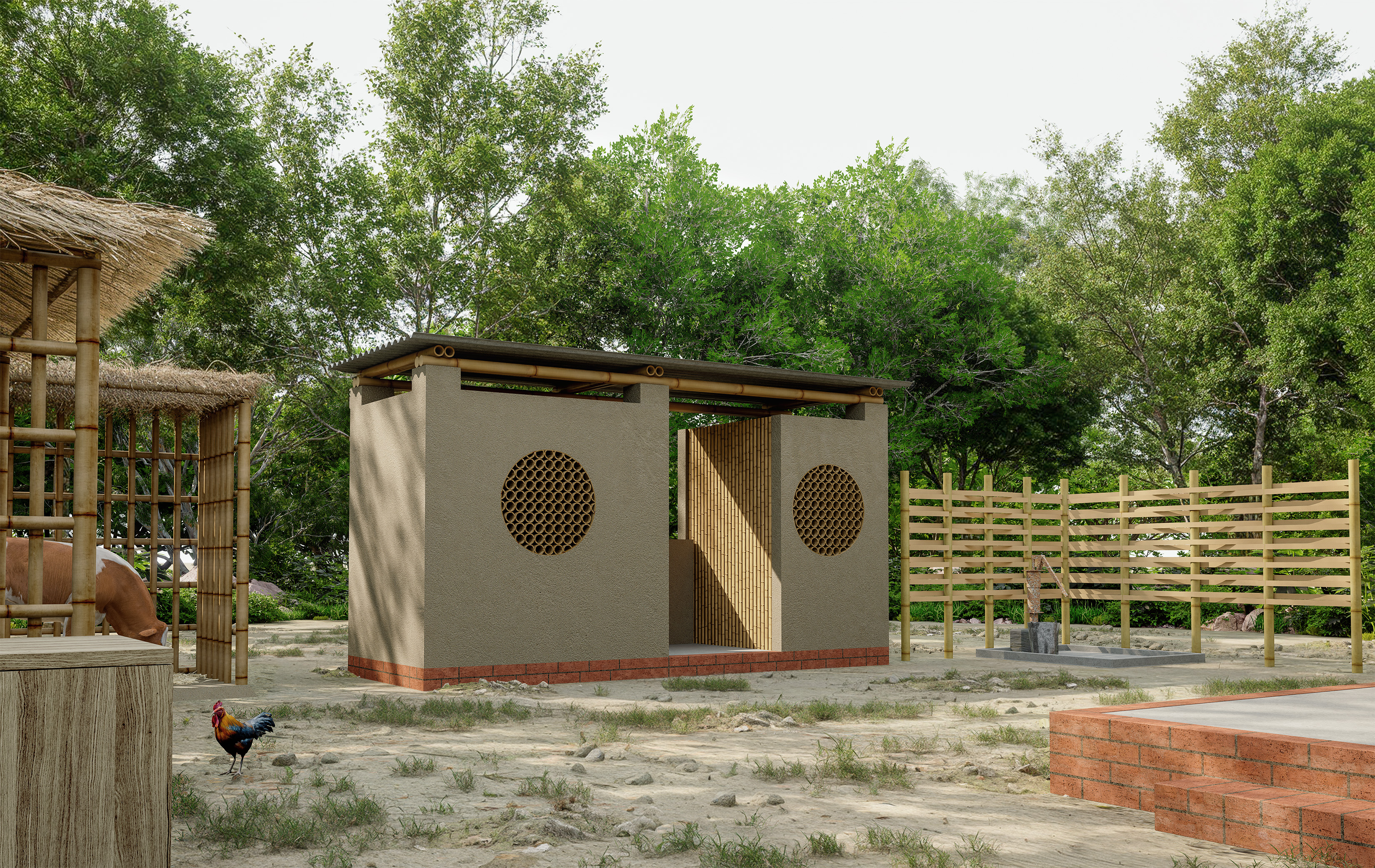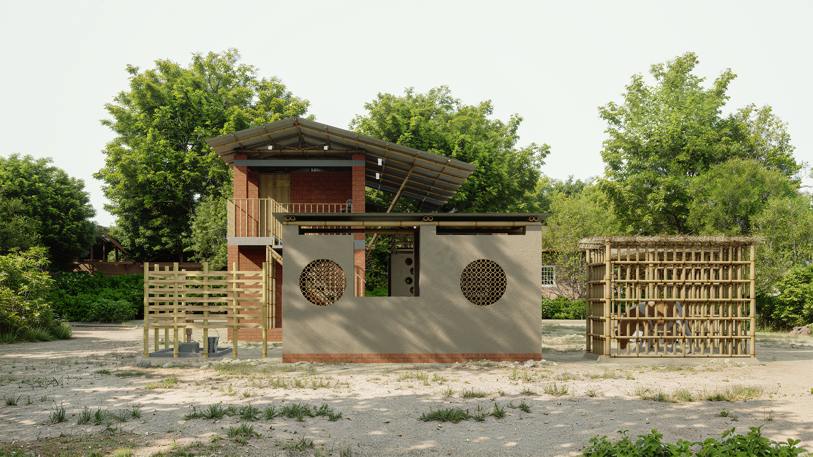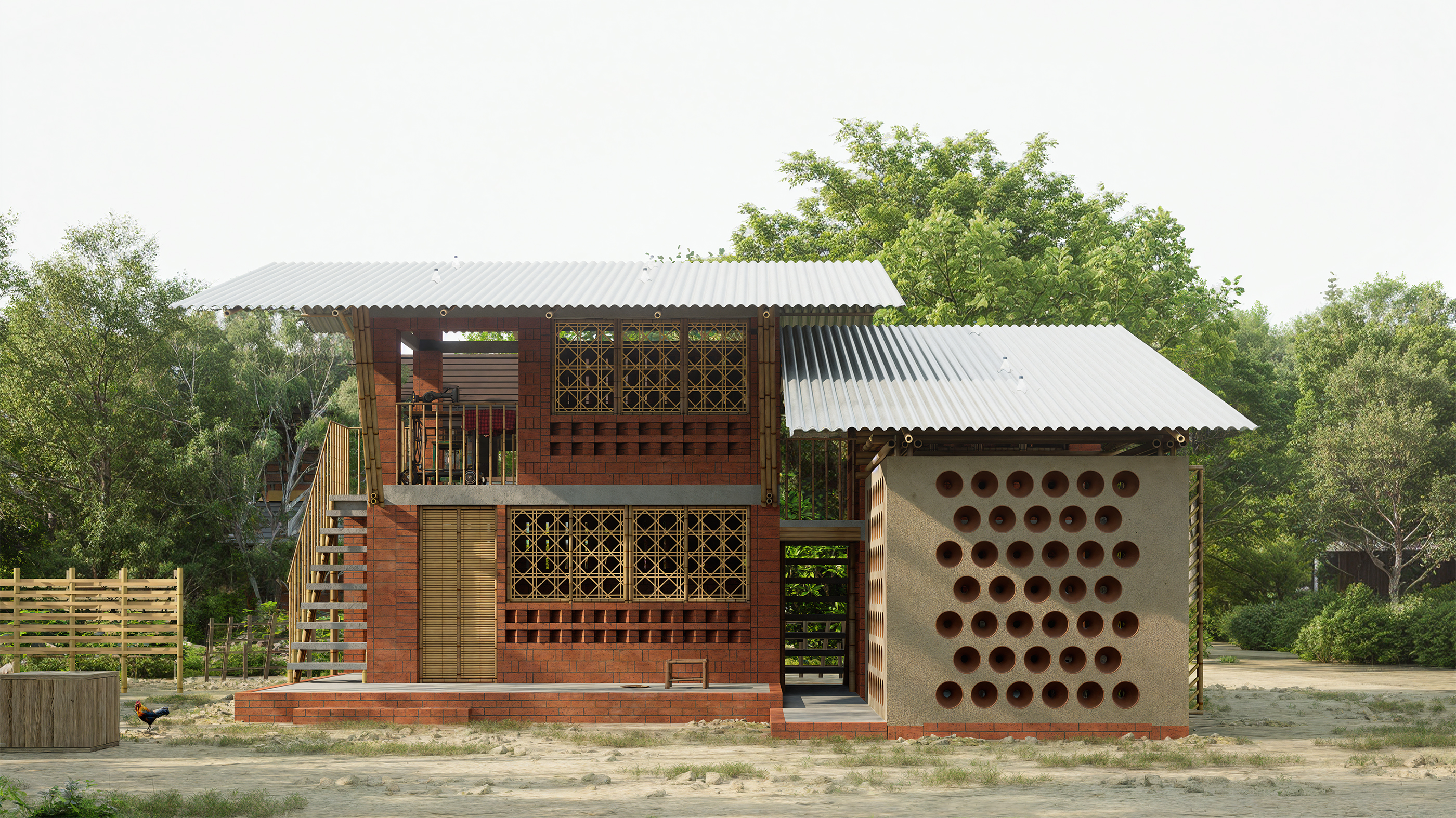 The $2,500 Vernacular Home is a sustainable house designed in Para Dash, the village of Modonpur, Bangladesh. Built with a budget under $2,500, including labor and materials, it uses only local resources: mud, straw, bamboo, bricks, and tin sheets. The home serves a family of four, parents and their son with his wife. To address Bangladesh’s hot climate and long monsoon season, the design uses a raised veranda, steeply pitched roofs for rain runoff, and a layout that ensures every room catches the breeze. Varying window heights on windward and leeward sides enhance ventilation. Clay pots from a nearby village are embedded in the tea house façade to cool the air through airflow compression. The house includes two bedrooms, a kitchen, a toilet, cow sheds, and a future child’s room. A weaving area for the daughter-in-law sits on the upper-level balcony, allowing her to stay connected to the family while working. The parents' tea house and shop are placed along the village road for accessibility and courtyard privacy. Due to limited electricity, 'liter bottles of light' are used on the roof to brighten interiors. Rooted in local knowledge, the design reflects true vernacular sustainability.