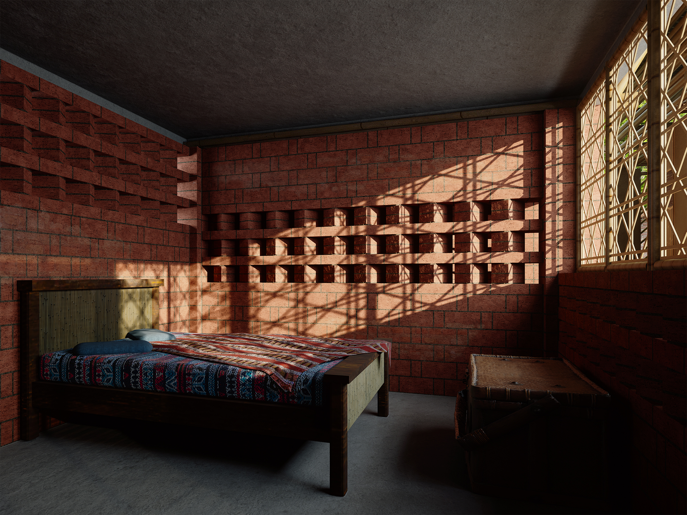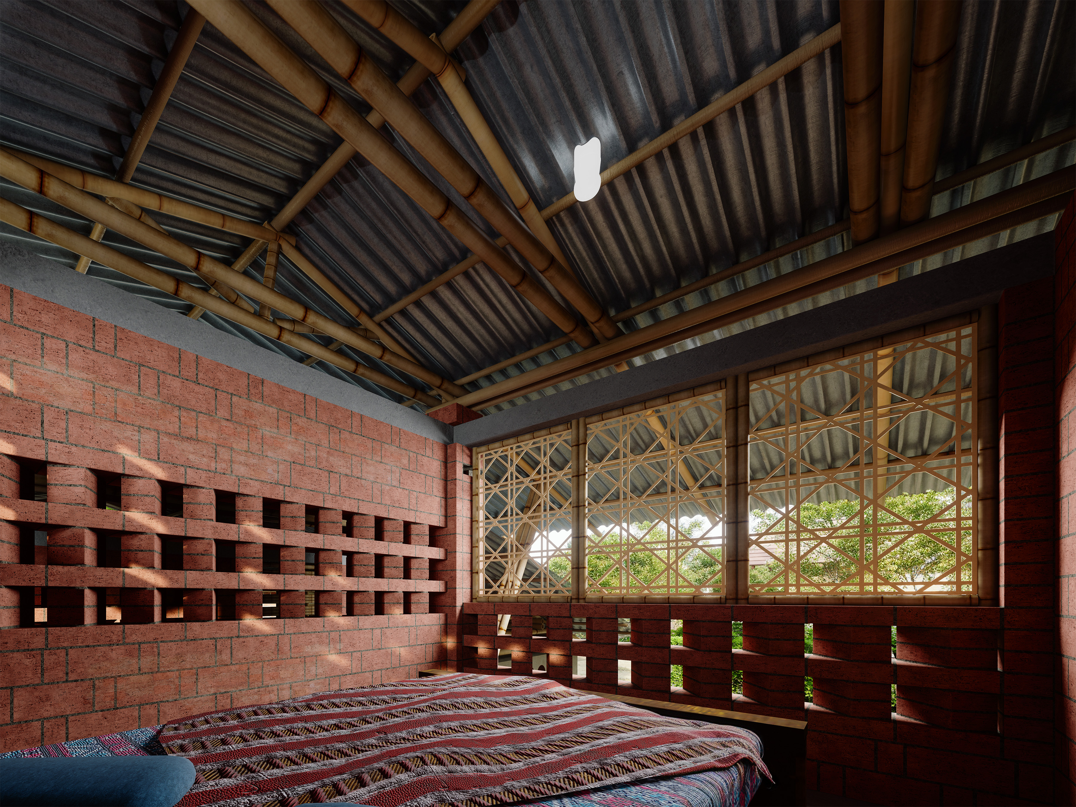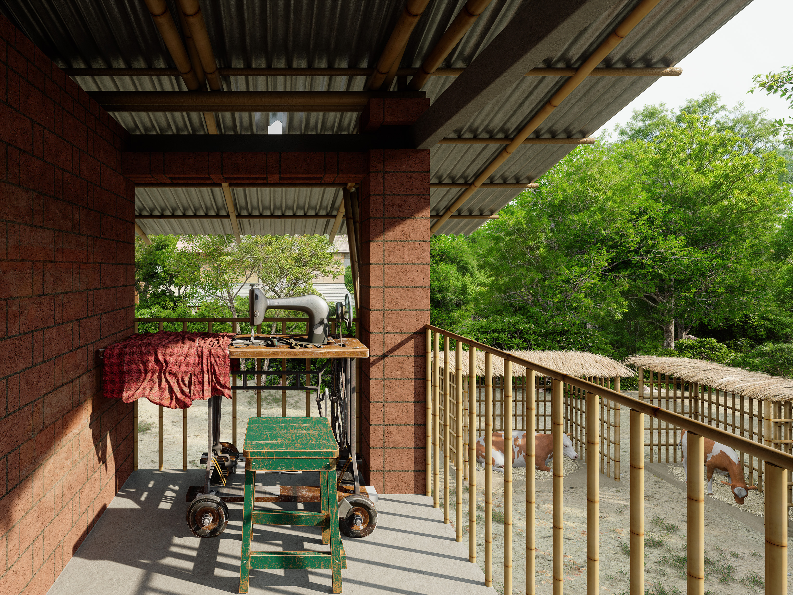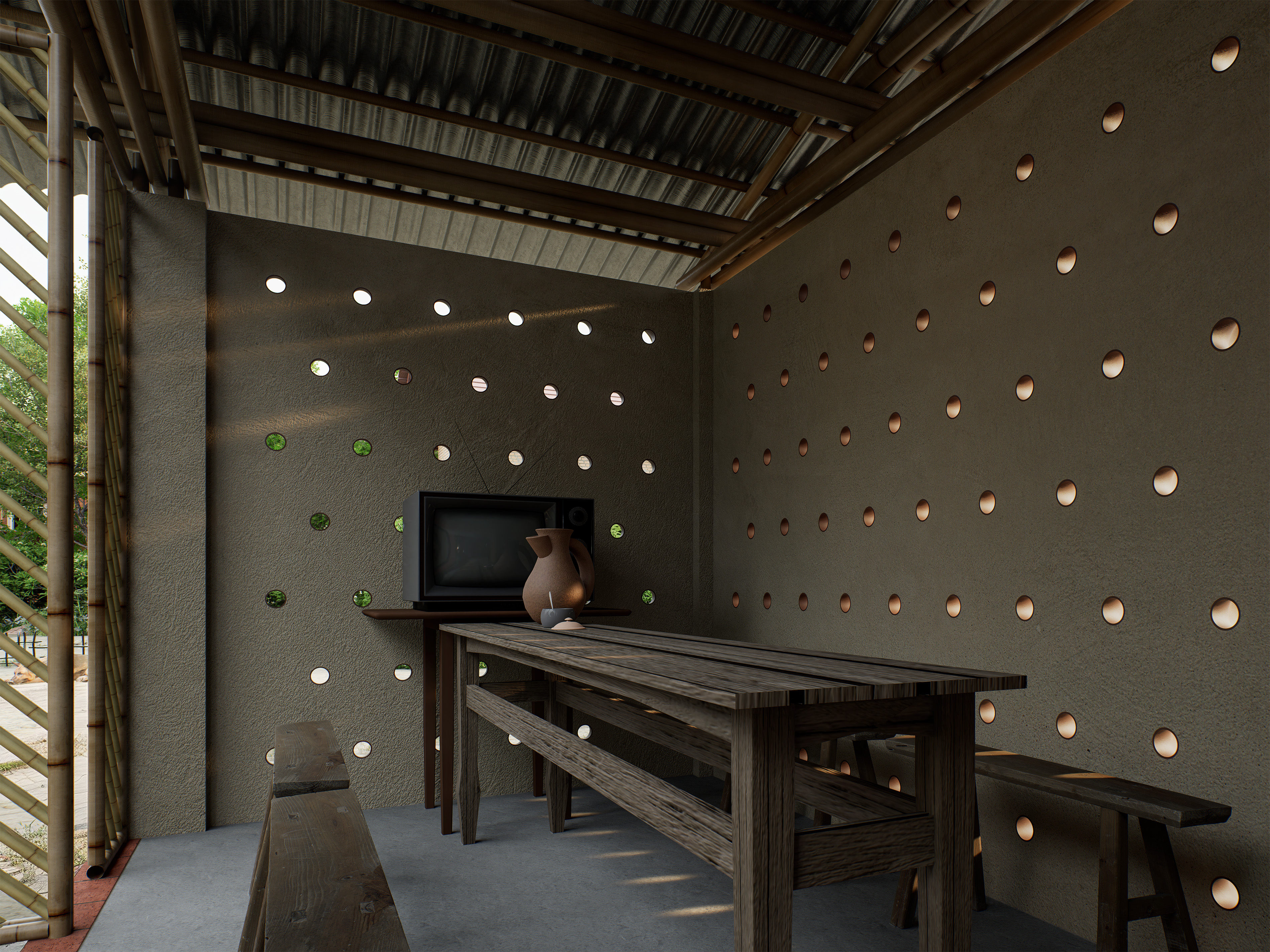 The $2,500 Vernacular Home is a sustainable house designed in Para Dash, the village of Modonpur, Bangladesh. Built with a budget under $2,500, including labor and materials, it uses only local resources: mud, straw, bamboo, bricks, and tin sheets. The home serves a family of four, parents and their son with his wife. To address Bangladesh’s hot climate and long monsoon season, the design uses a raised veranda, steeply pitched roofs for rain runoff, and a layout that ensures every room catches the breeze. Varying window heights on windward and leeward sides enhance ventilation. Clay pots from a nearby village are embedded in the tea house façade to cool the air through airflow compression. The house includes two bedrooms, a kitchen, a toilet, cow sheds, and a future child’s room. A weaving area for the daughter-in-law sits on the upper-level balcony, allowing her to stay connected to the family while working. The parents' tea house and shop are placed along the village road for accessibility and courtyard privacy. Due to limited electricity, 'liter bottles of light' are used on the roof to brighten interiors. Rooted in local knowledge, the design reflects true vernacular sustainability.
