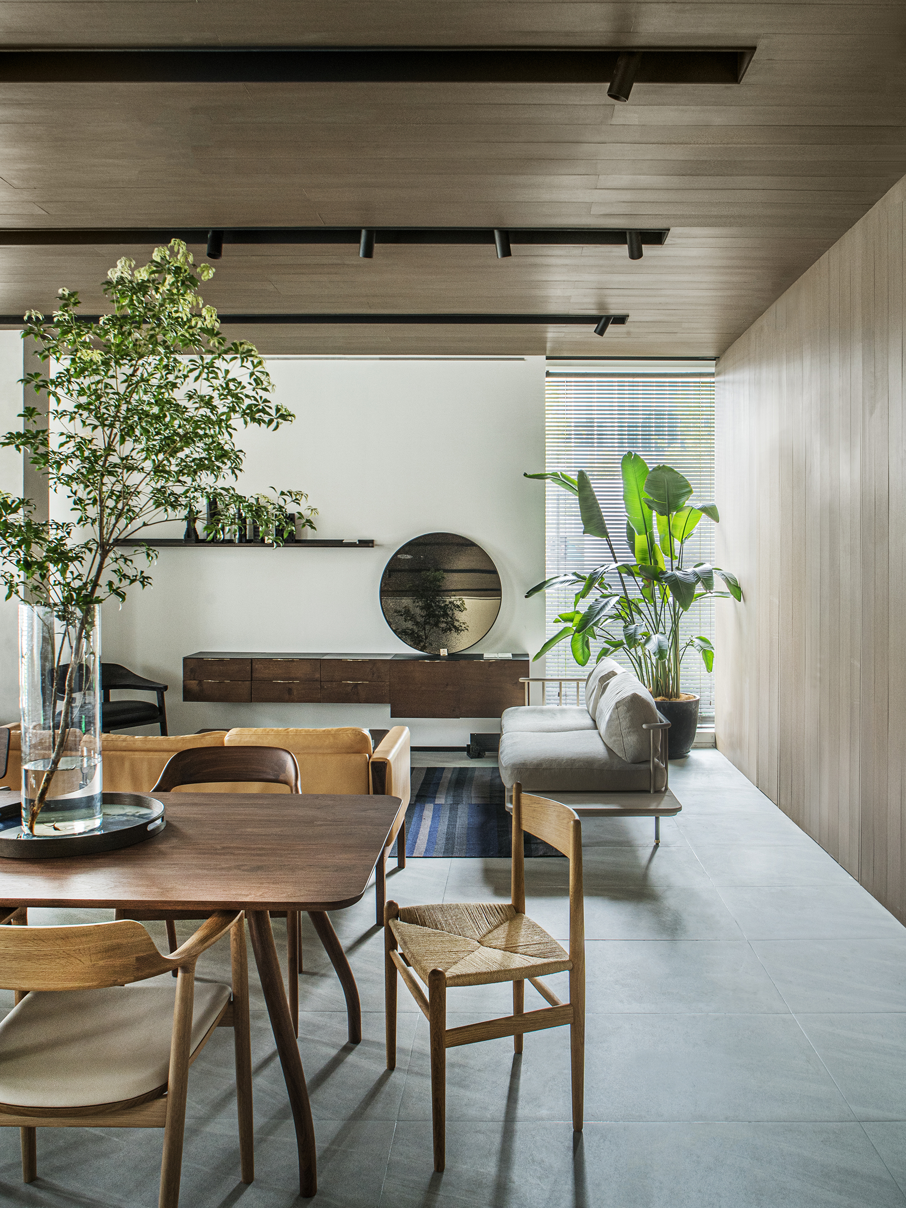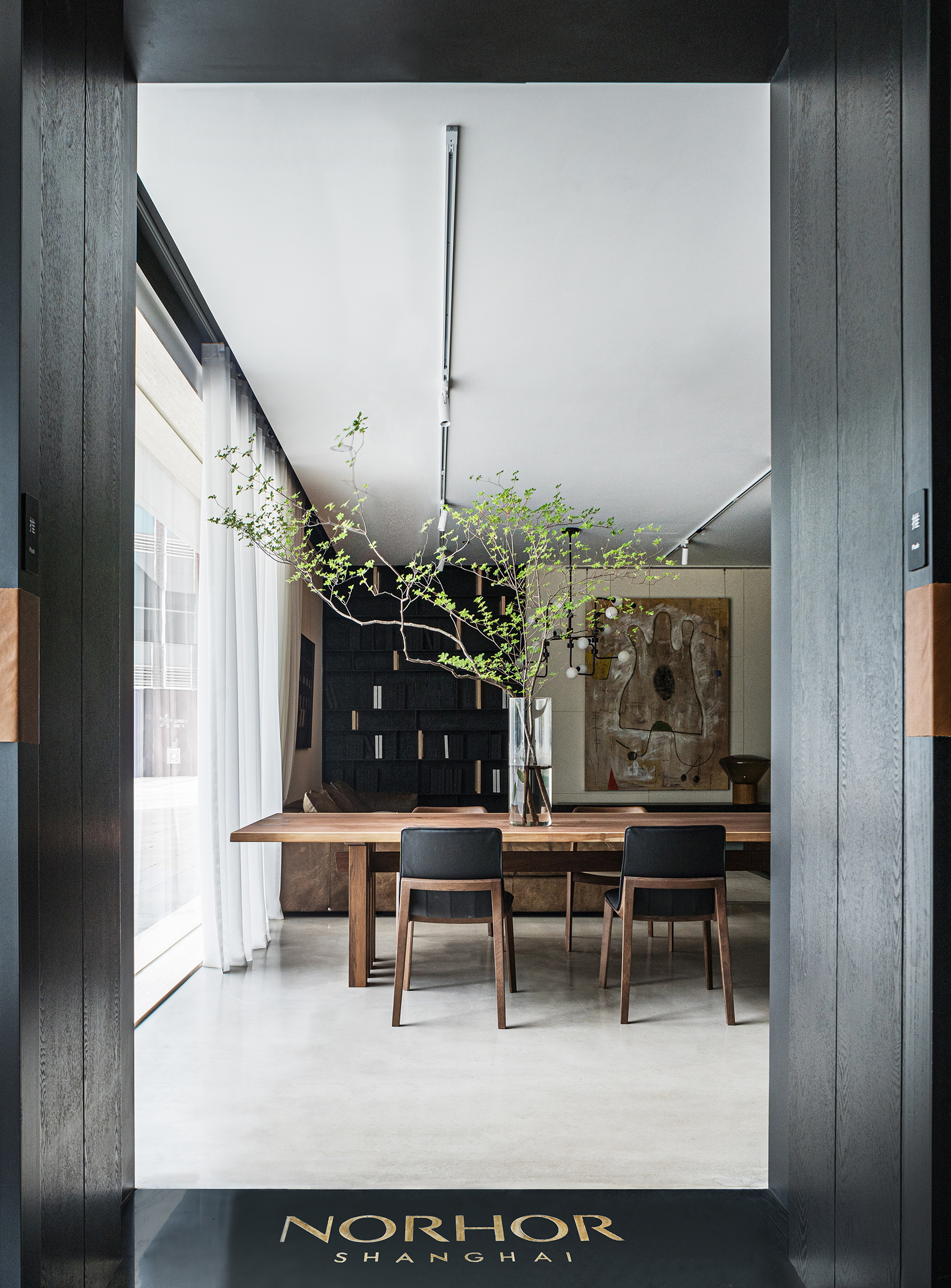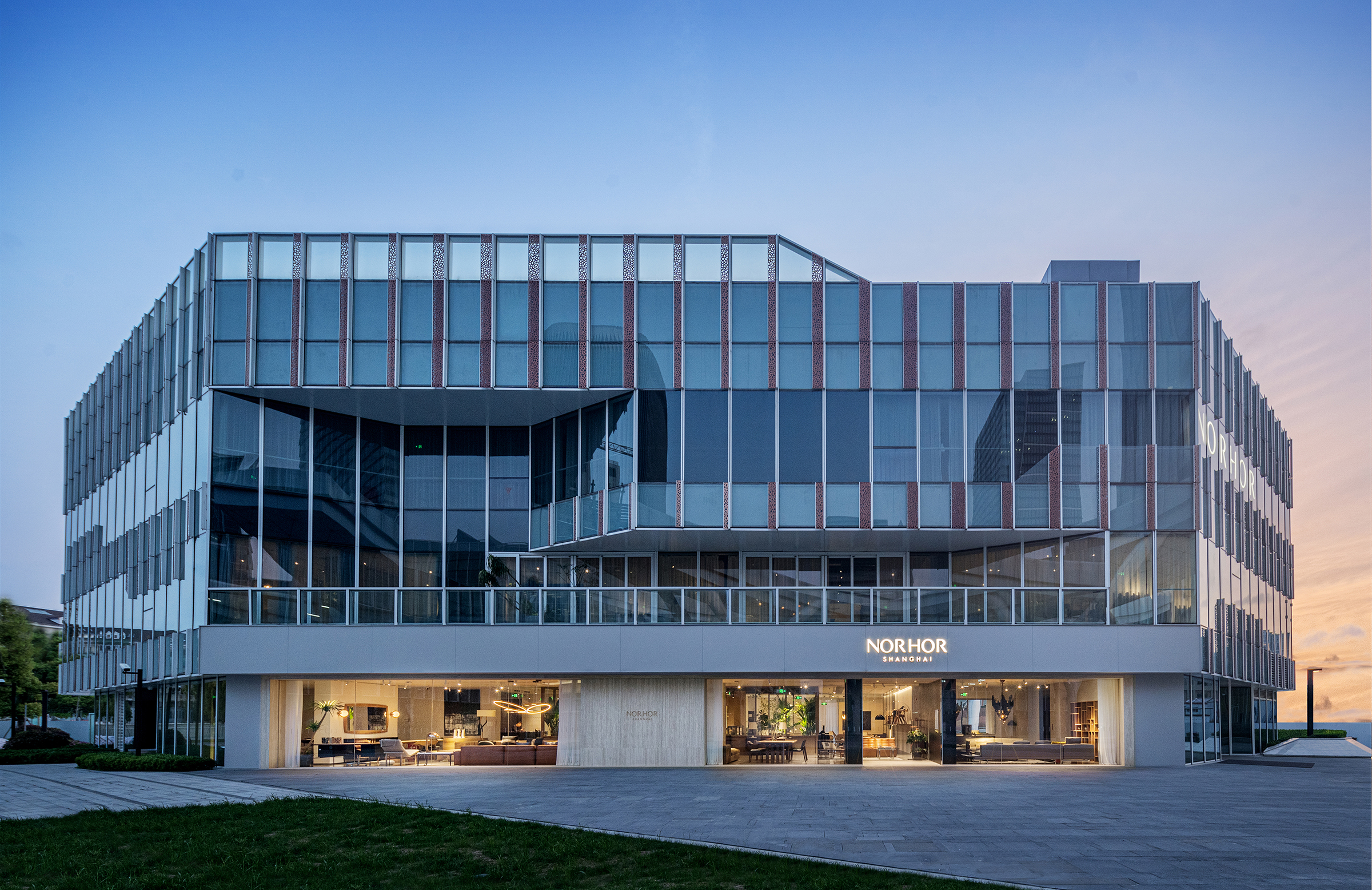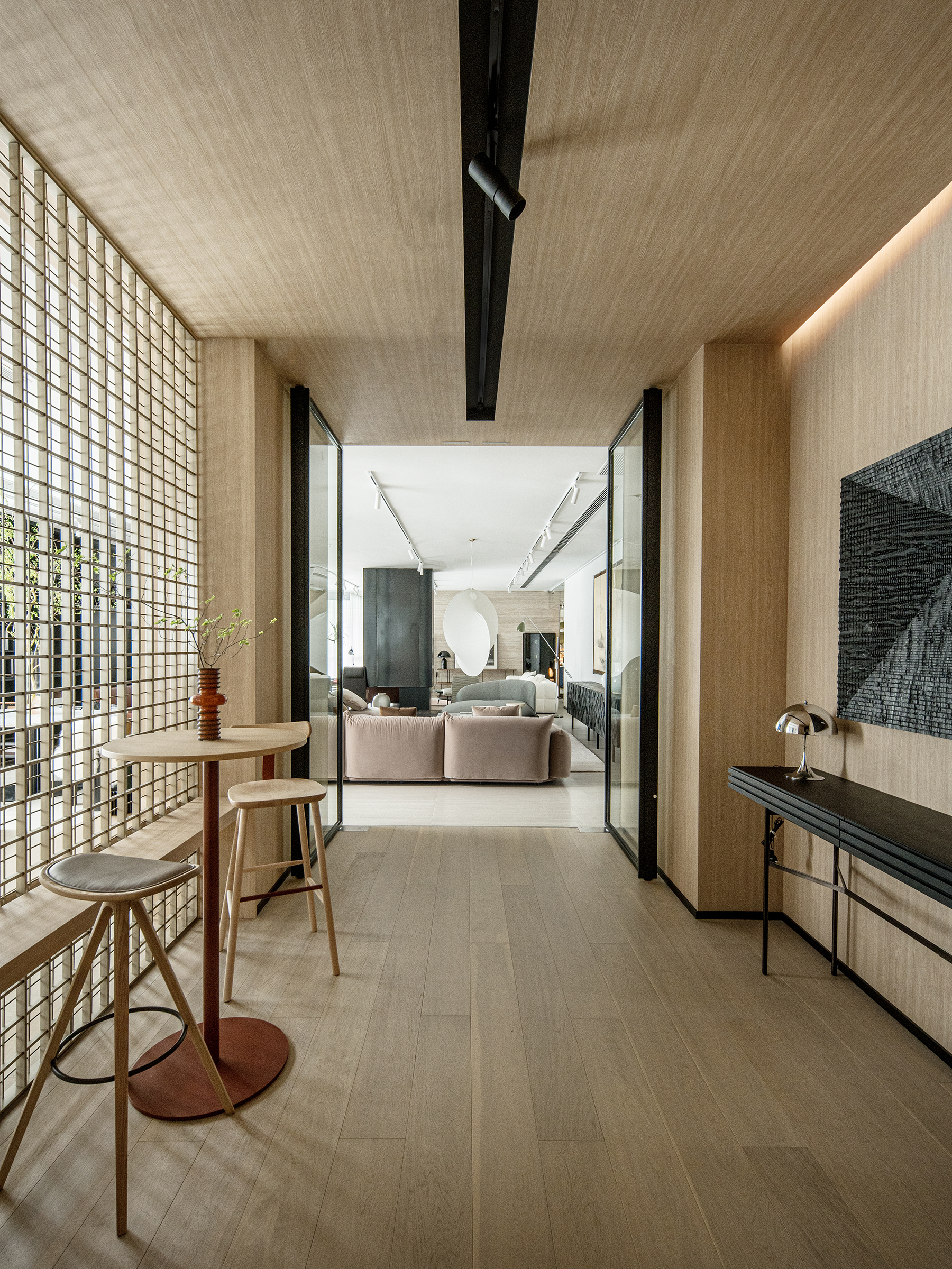 Located in Shanghai’s Xuhui West Coast, this project redefines the showroom typology as a transparent, immersive, and emotionally rich environment. Positioned at the intersection of the cultural artery and the fast-paced rhythm of the city, the four-story glass structure uses ultra-clear tempered glass and vertical aluminum grids to form a permeable light-screen façade. This approach dissolves the traditional enclosure of exhibition halls and invites natural light to flow in, turning the building itself into a luminous urban installation that connects inside and out. Inspired by the "Pujiang Migration," the design translates the gentle curves of river currents into vertical spatial narratives, from the “Tidal Living Room” on the ground floor to the “Cloud Sleeping Room” at the top, creating sixteen progressive home-themed ecological vignettes. Warm natural materials—such as cave stones with breathable textures, FSC-certified oak, and handcrafted elements—interact with sunlight and shadow to bring out the beauty of furniture through minimal intervention and soft visual language. The design dissolves the boundary between art and life, integrating curated furniture, contemporary artworks, greenery, and cultural symbolism into an open, circular circulation path that mimics the changing scenery of a traditional Chinese garden. Visitors are guided through a sequence of spaces including the central “Furniture Art Island,” a sculpture gallery, and an interactive corner, forming a flowing experiential rhythm of “exploration, immersion, and resonance.” Traditional motifs are abstracted into modern forms, such as window patterns and moon reflections, while color tones in neutral greys and beiges are accented with Klein blue and amber orange to provide visual warmth and emotional tension. Emphasizing “life is art,” the space becomes a dialogue between function and aesthetics, East and West, tradition and innovation. More than just a furniture display, the exhibition hall serves as a slow-living cultural field—an oasis in the fast-paced urban jungle—allowing people to reconnect with the senses, with nature, and with the poetics of everyday life.