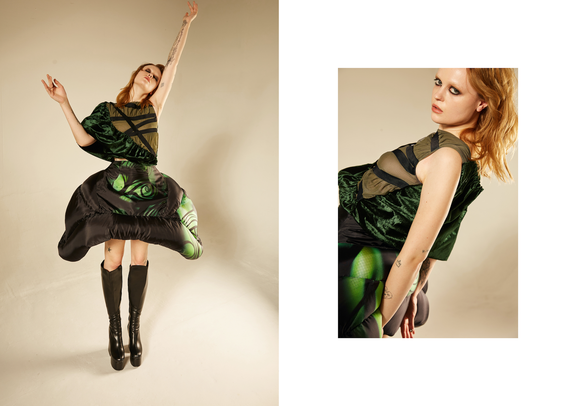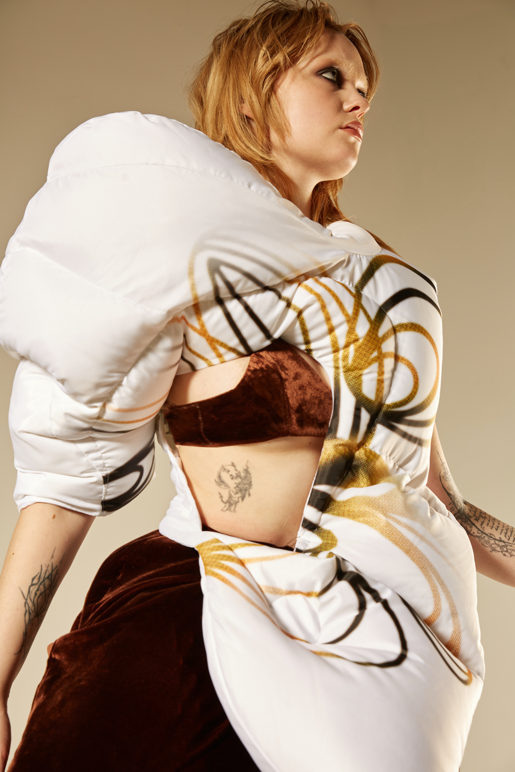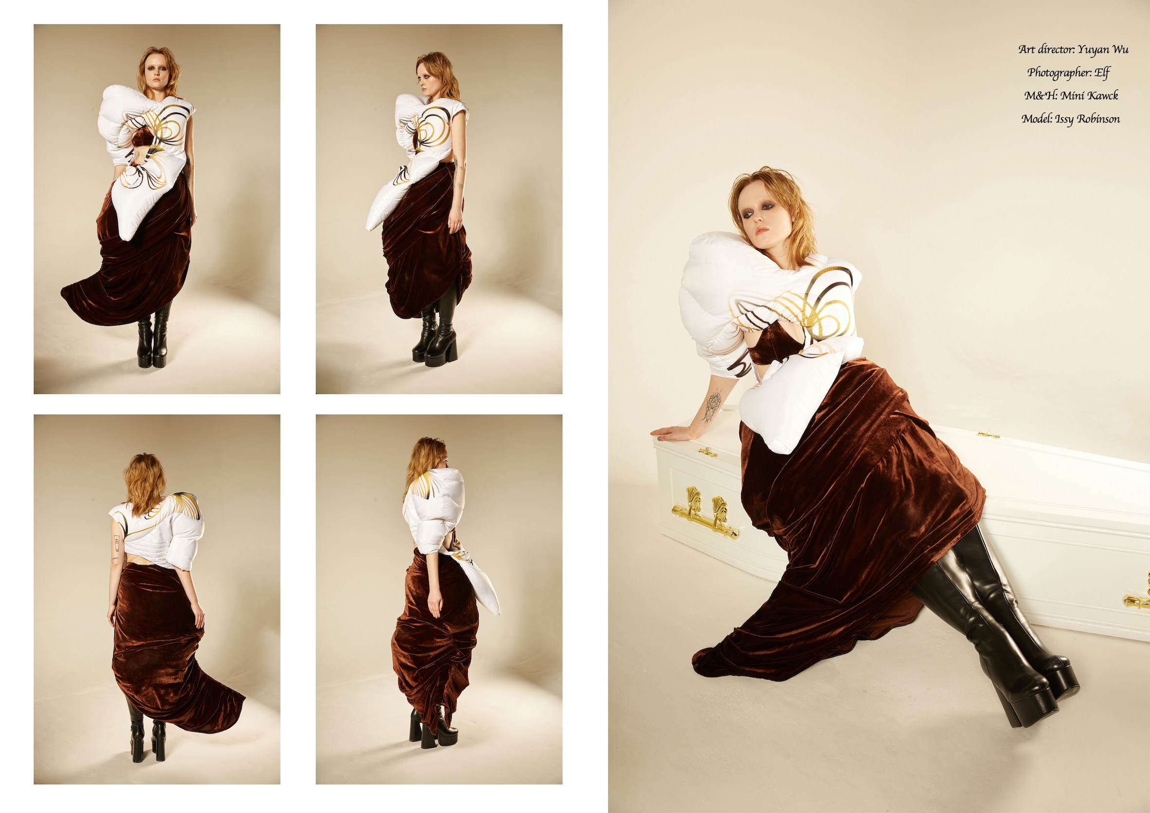 Christianity's perspective on death, likening it to peaceful slumber with eternal companionship with Jesus, brought solace. I feel people's pursuit of tranquility, which makes me believe that I can replace my anxiety with emotions of this faith Let us relax and embrace tranquility. The power of faith will be our always comfortable and warm bed and shelter. So I chose a soft mattress material in this project to dissolve the image of death represented by the coffin. Starting from this, I conducted many experiments on the relationship between comfortable sleeping bedding and the body, religious prayer postures, and painting, quilting, and printing experiments based on the symbols of the Christian concept of life and death The use of down material provides a soft wrapping and spiritual healing for the body, making the wearer feel comfortable and relaxed.