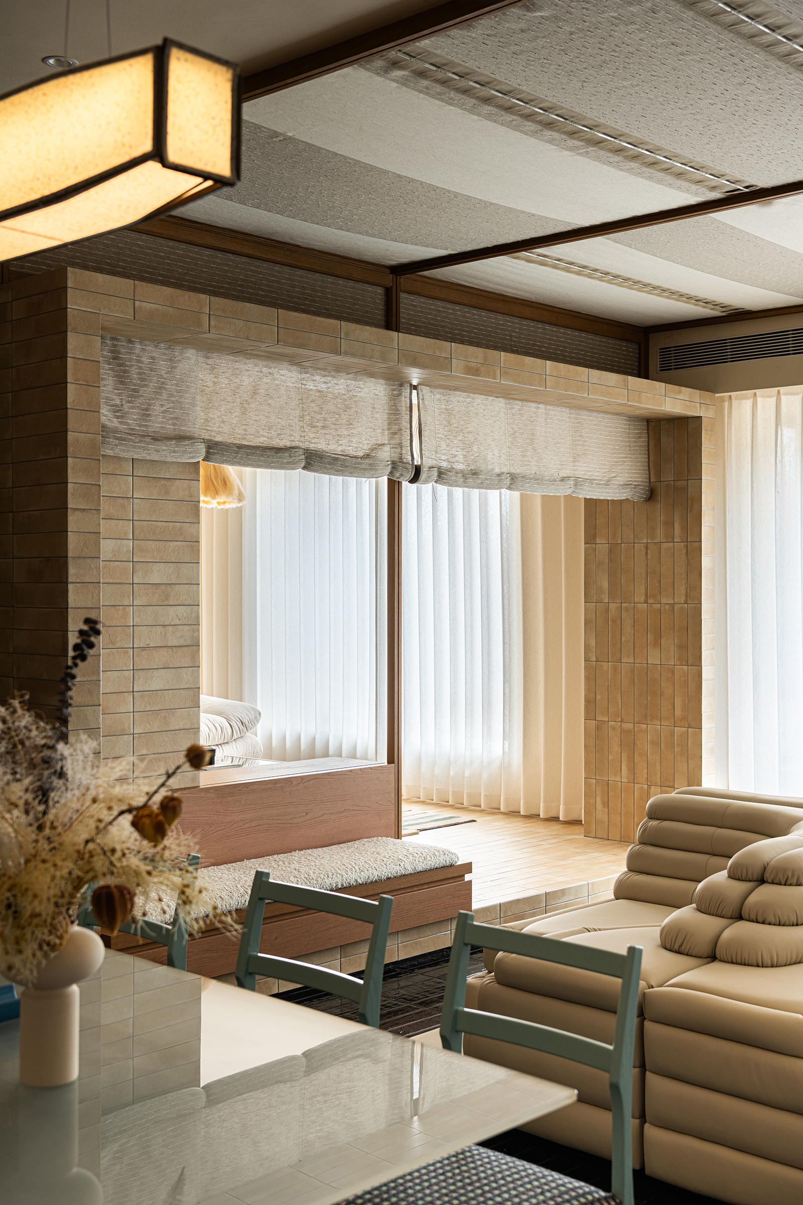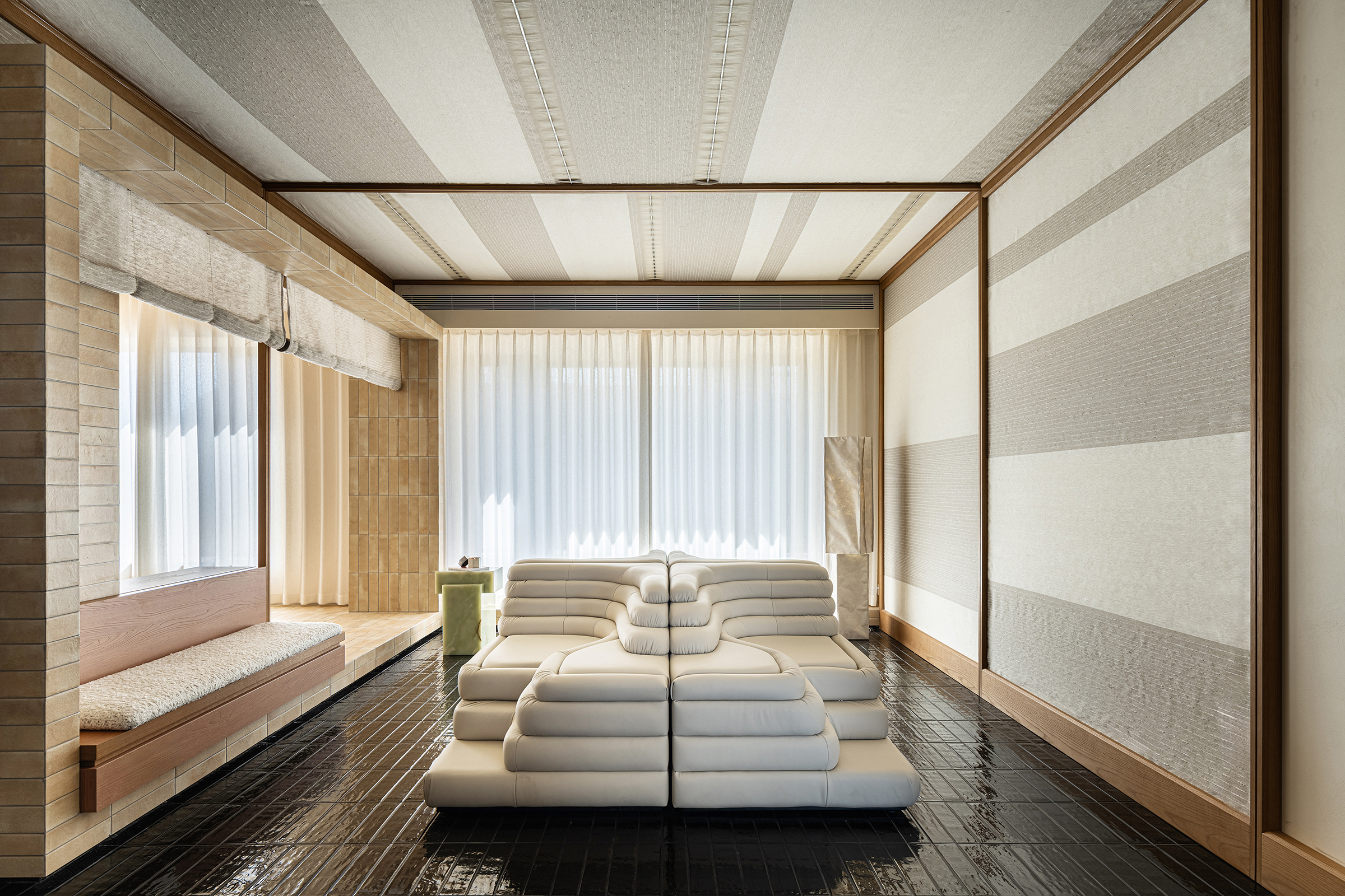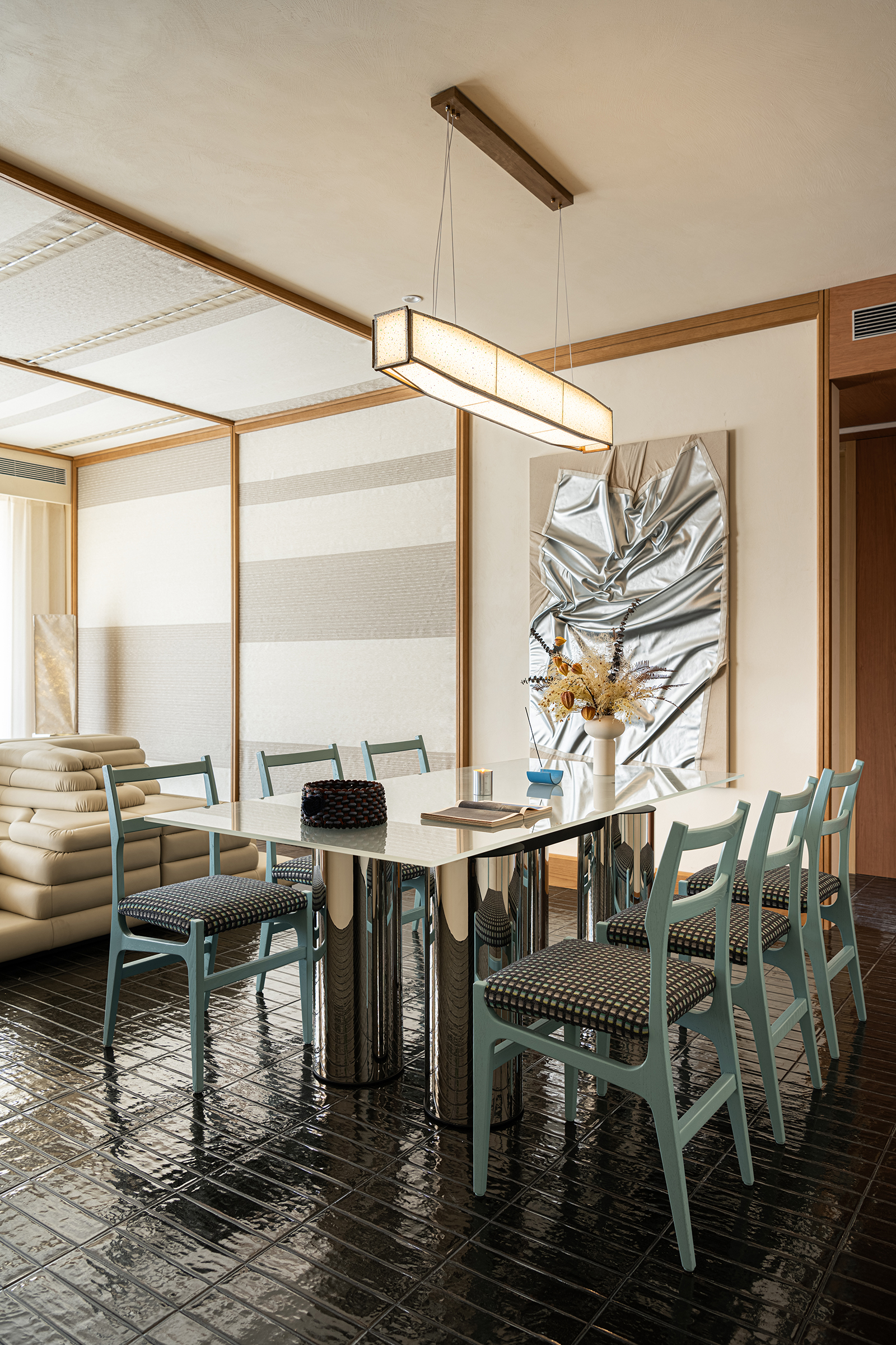 in its "multiple identities"—it serves as a holiday sanctuary where RoMaa and her family can escape the city and relax, an open and inclusive social space where friends can be comfortably hosted and small parties held, and, most importantly, a visual display and shooting venue for the women's shoe brand "Milooey Shoes". The design inspiration stems from exploring the community attributes of the space. Combined with the diverse lifestyle of the Aranya community, it was ultimately decided to create an integrated residence, commerce and social space to meet the project's multiple functional needs. Its innovative highlights lie in drawing inspiration from "Milooey Shoes" designs, seamlessly integrating brand elements into daily life scenarios: artistic installations are crafted from the leather materials used in the shoes, chandeliers and carpets are made from horsehair and special fabrics, and the coffee table in the reception room is transformed into a small display stand showcasing shoe design drafts and production processes, allowing elements of women's shoes to blend into Luoma's home in a life-like manner. The greatest difficulty during the design process was balancing the integrated attributes of "residence + commerce + social space"—it needed to embody the fashion sense of commercial design while maintaining the practicality and functionality of a residence. Additionally, the incorporation of commercial props in the space increased the difficulty of implementation, requiring precise control over the proportion and presentation of each element in the design.