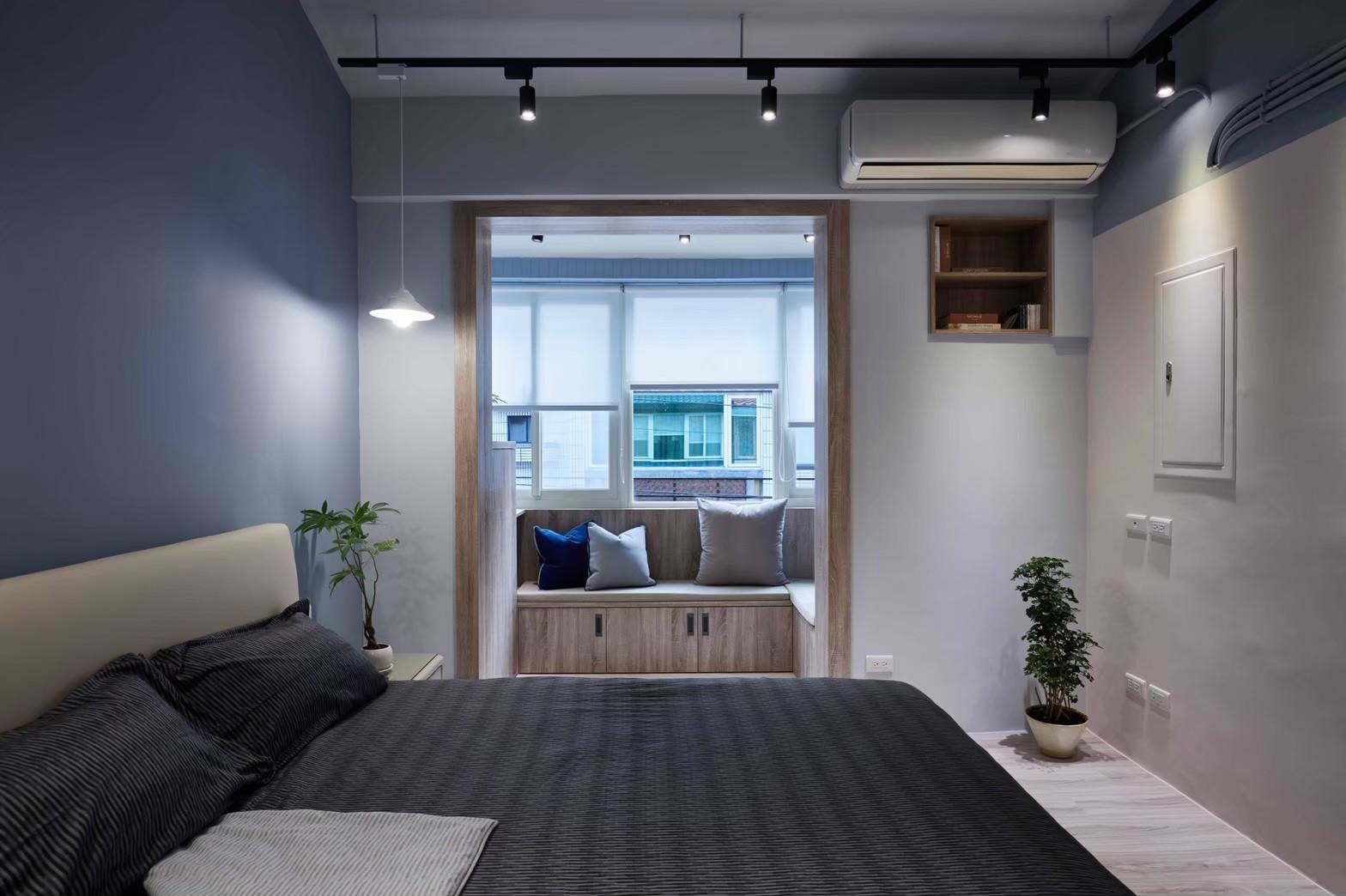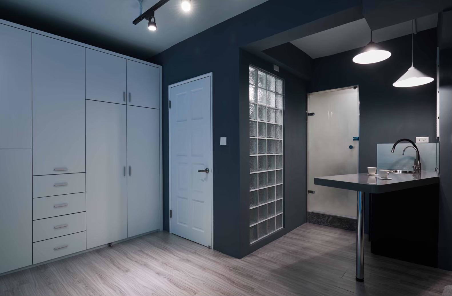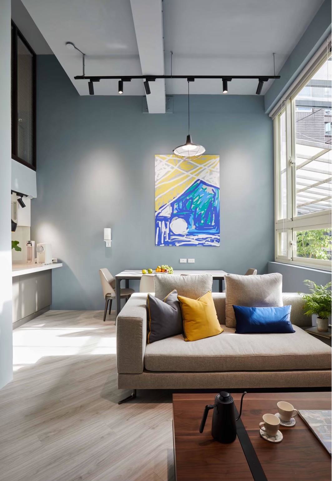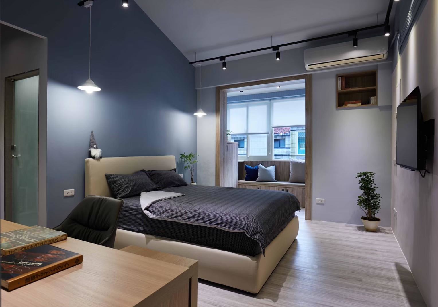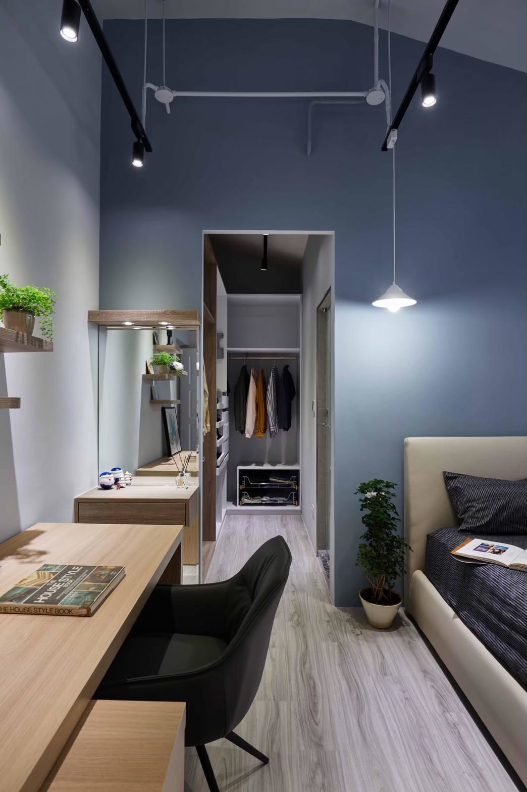 The kitchen and dining area invites natural light through large glazing, complemented by an open bar counter design. The designer’s hand-painted, vibrant geometric artwork interacts with the light, imbuing everyday dining with a sense of ceremony. In the bedroom, the sloped ceiling is reimagined with layered materials and lighting, creating a serene and design-forward atmosphere.