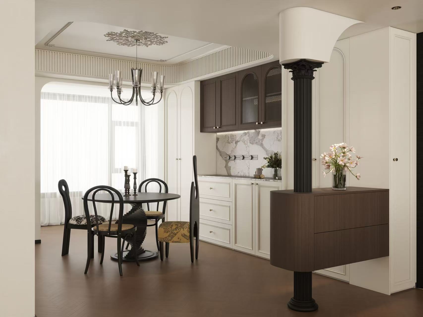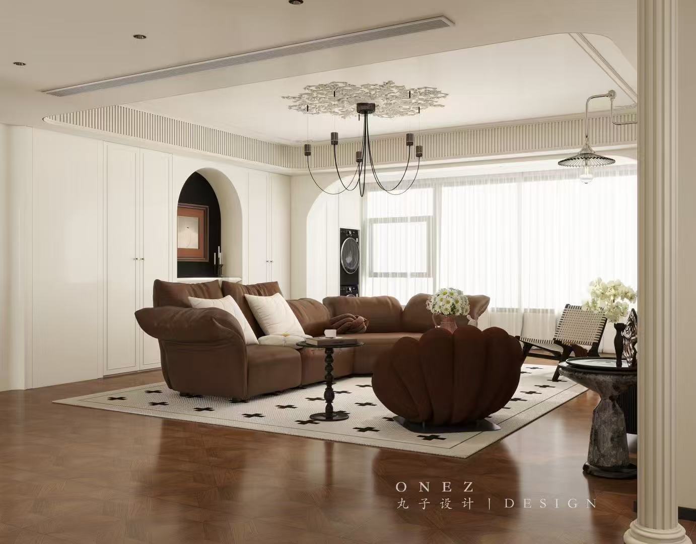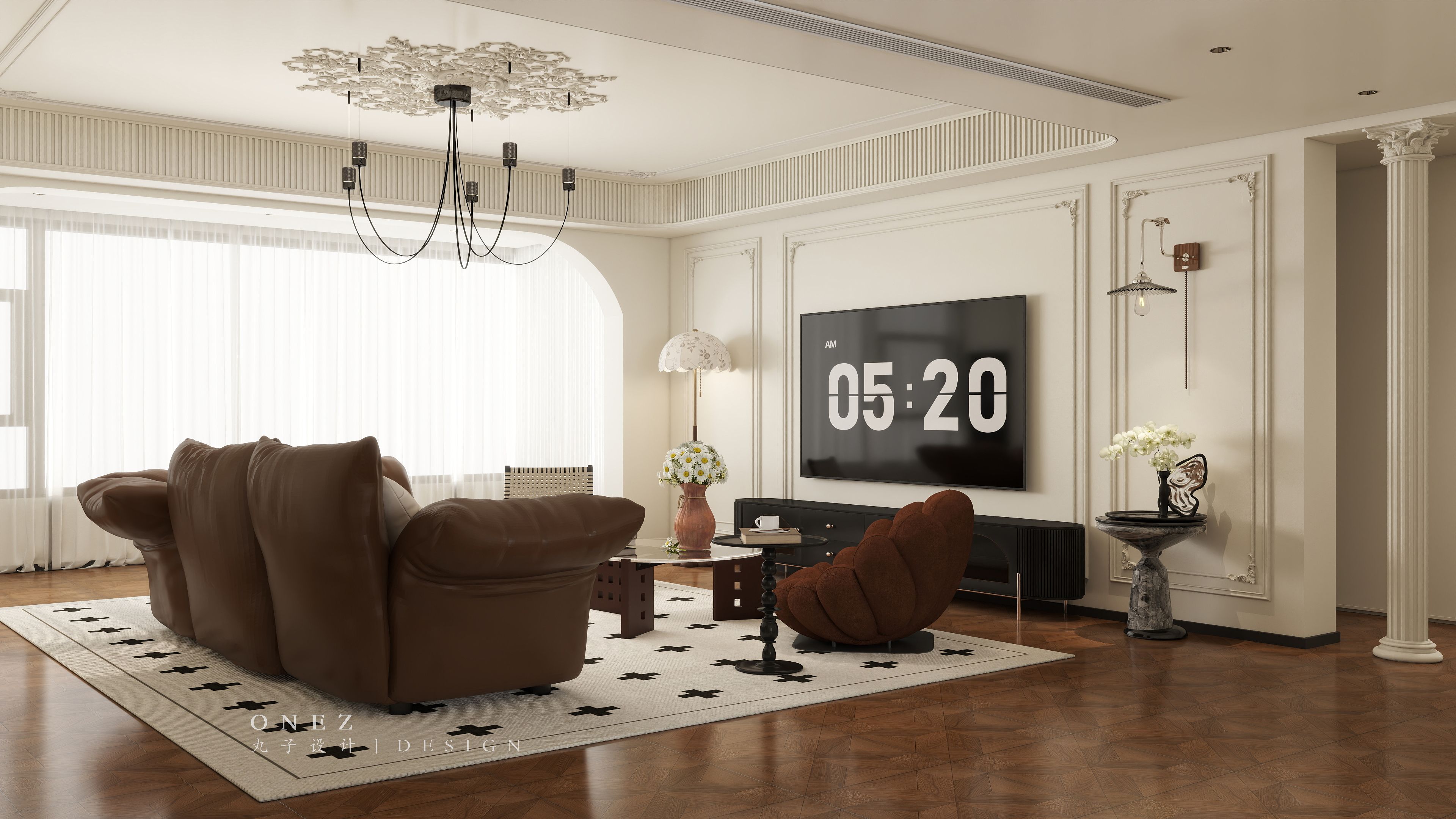 In term of materials, the use of gypsum moldings, walnut wood, and natural stone enhances the overall living ambiance.