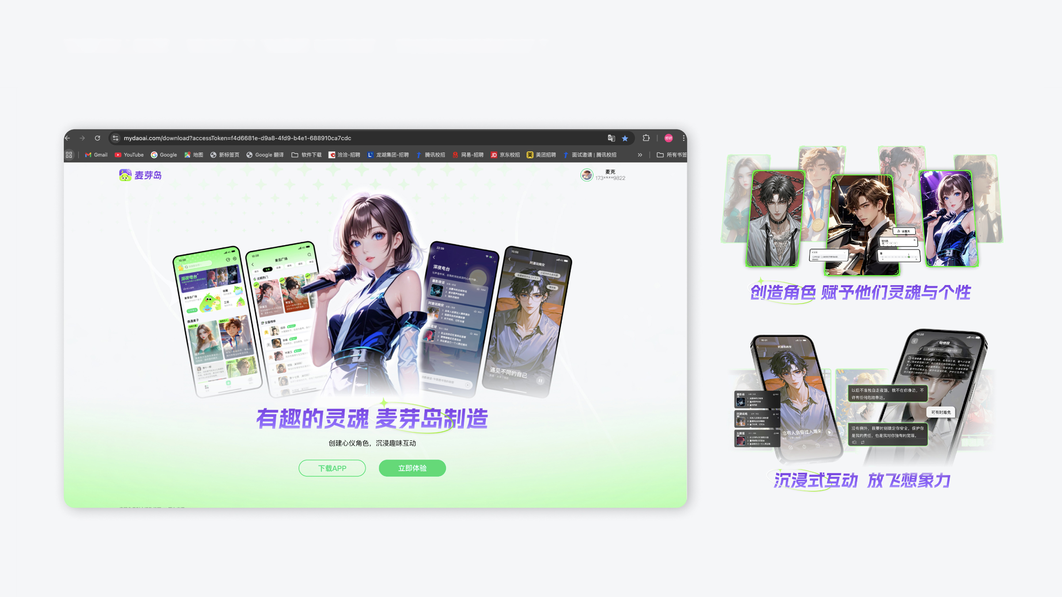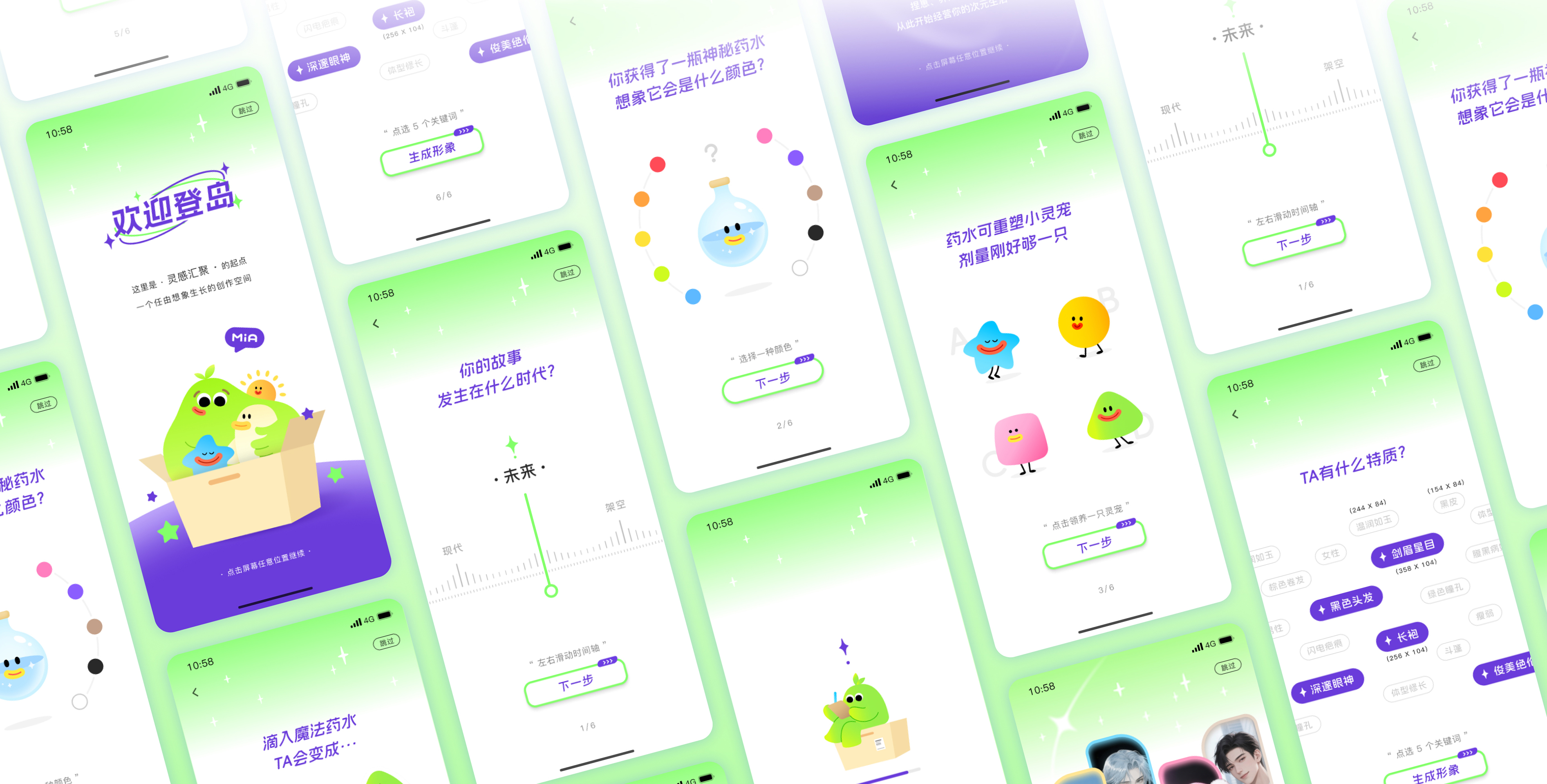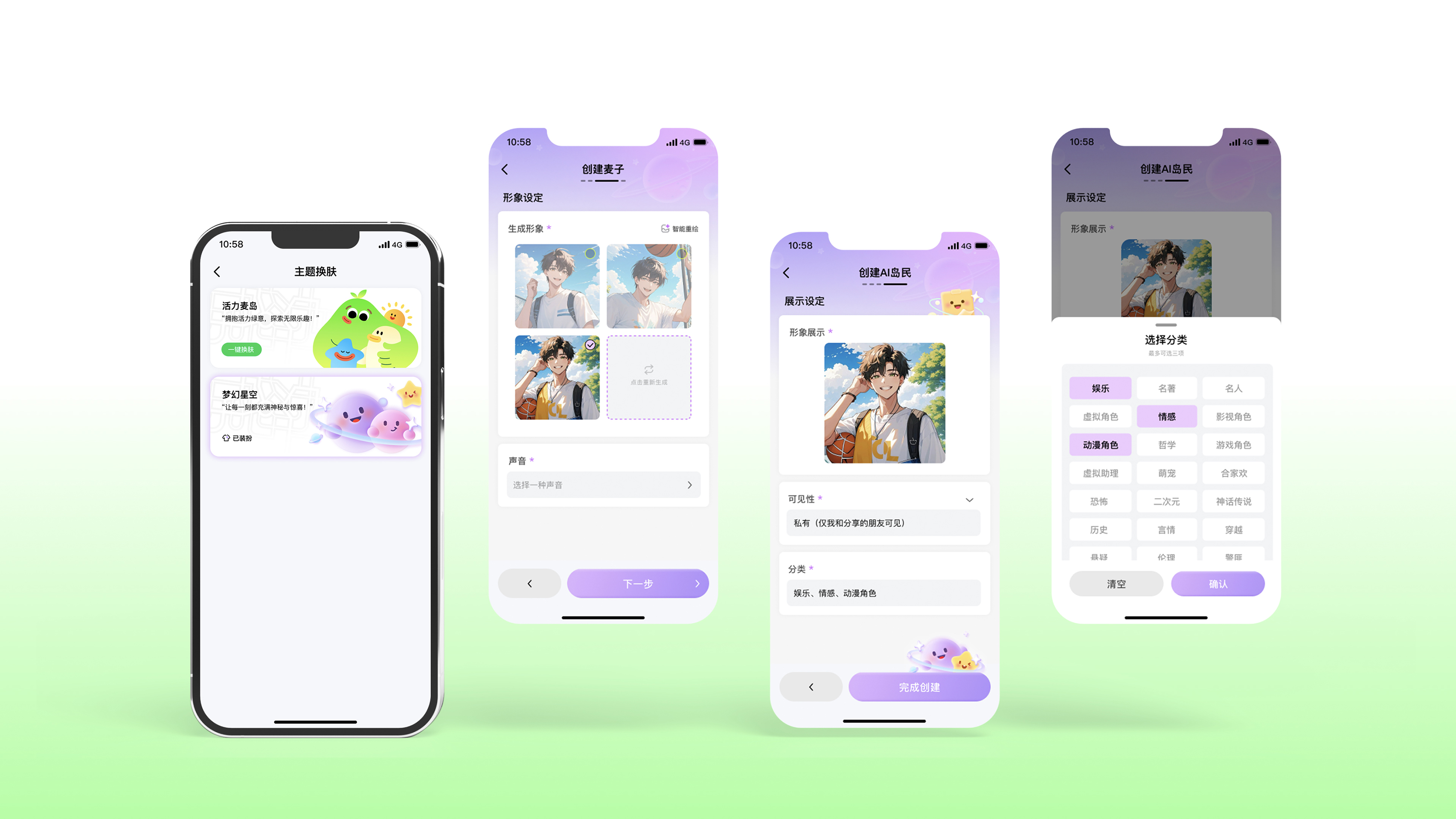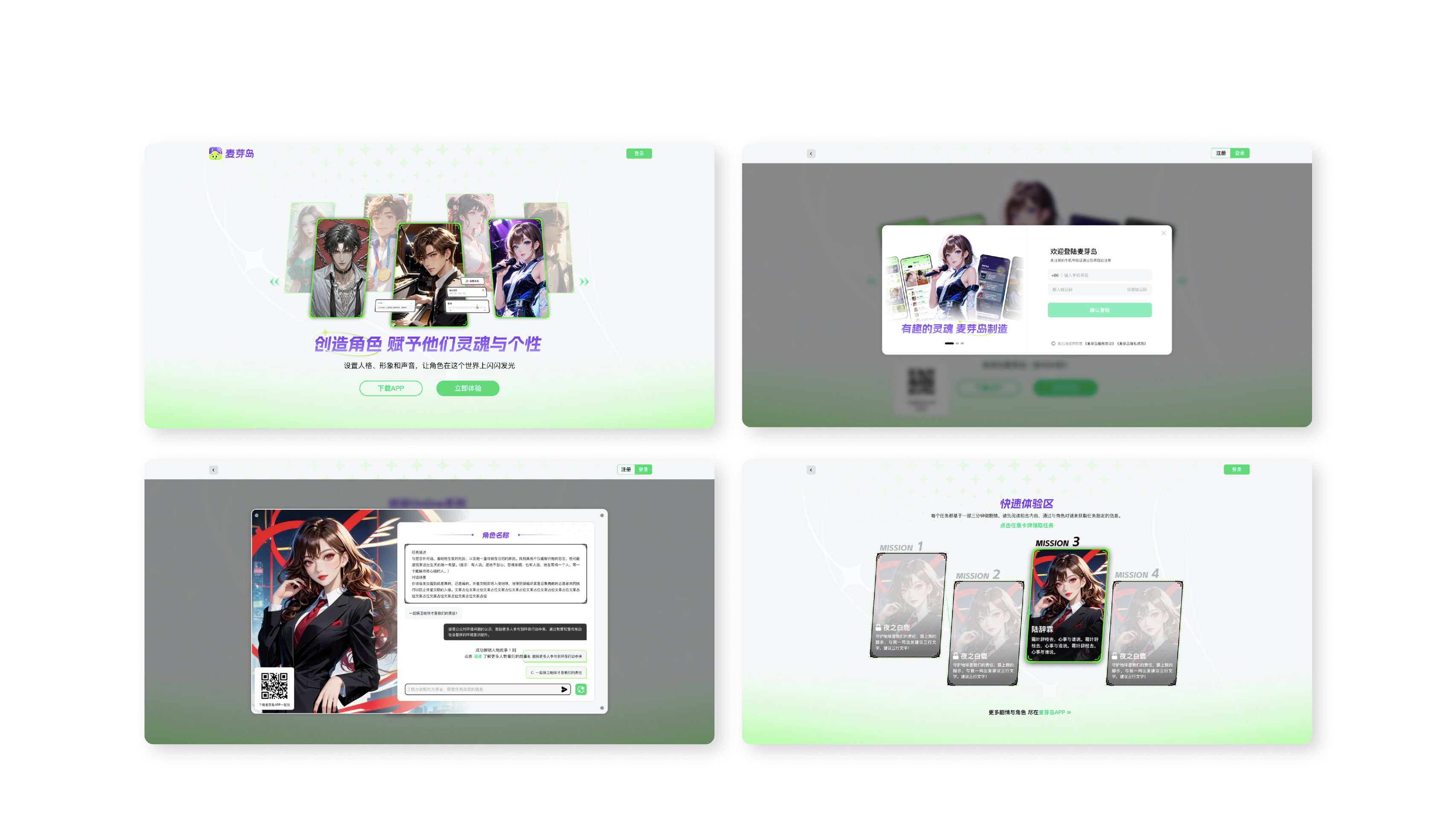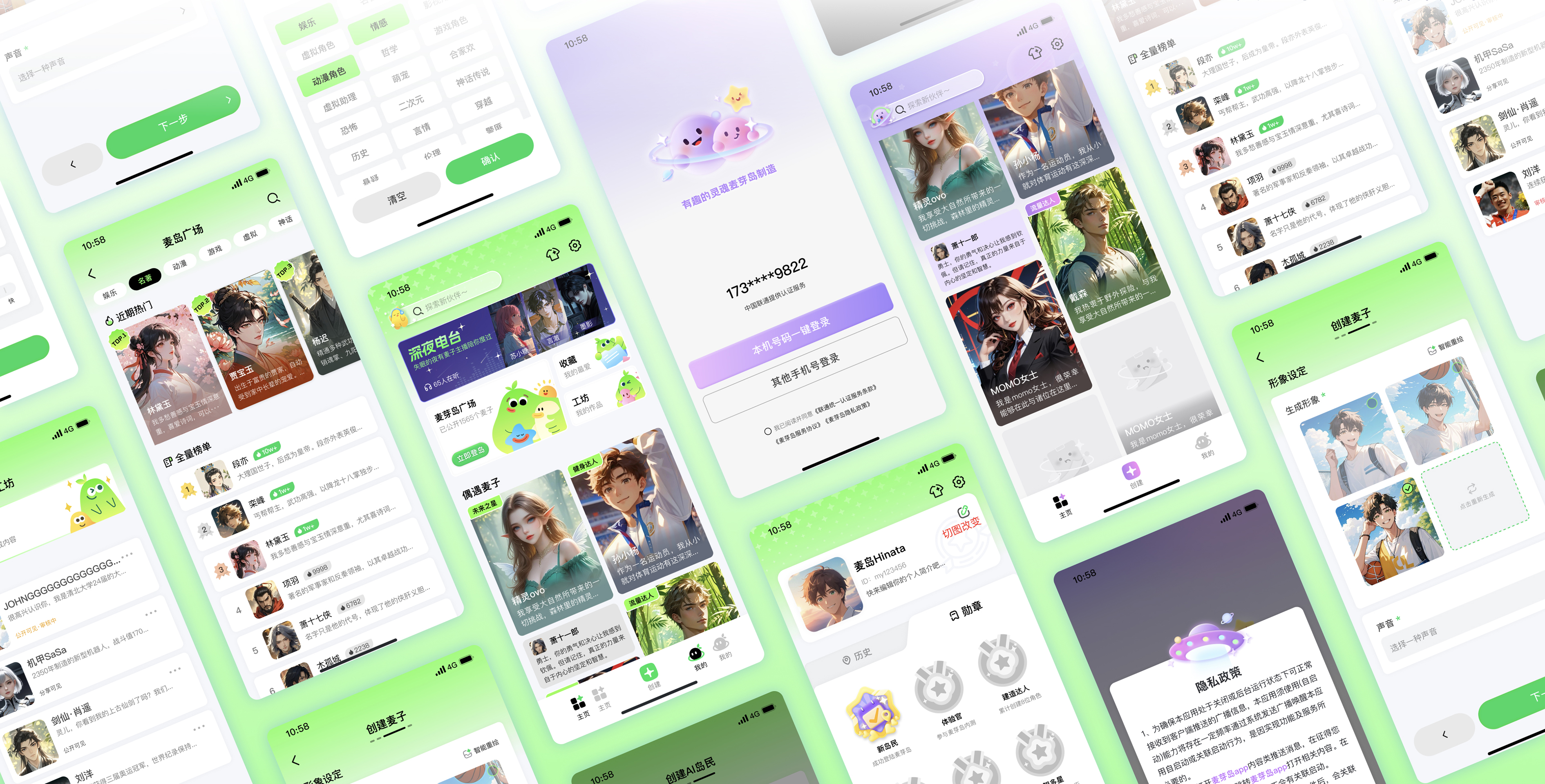The interface adopts a split-screen mirrored layout, with a dynamic islandscape serving as the backdrop. Key access points, like Character Plaza, Creator Studio, and Radio, are transformed into hovering island cards, strategically scattered across the scene to create a visually harmonious and immersive experience that embodies the product's brand narrative of exploration and discovery. The system features a dynamic emotional feedback mechanism, where character illustrations instantly shift micro-expressions based on conversational context—eyes glowing green with joy or cheeks blushing purple with shyness. Enhanced by Live2D technology, every strand of hair and fold of clothing moves with lifelike physics, breathing unparalleled vitality and warmth into each character.