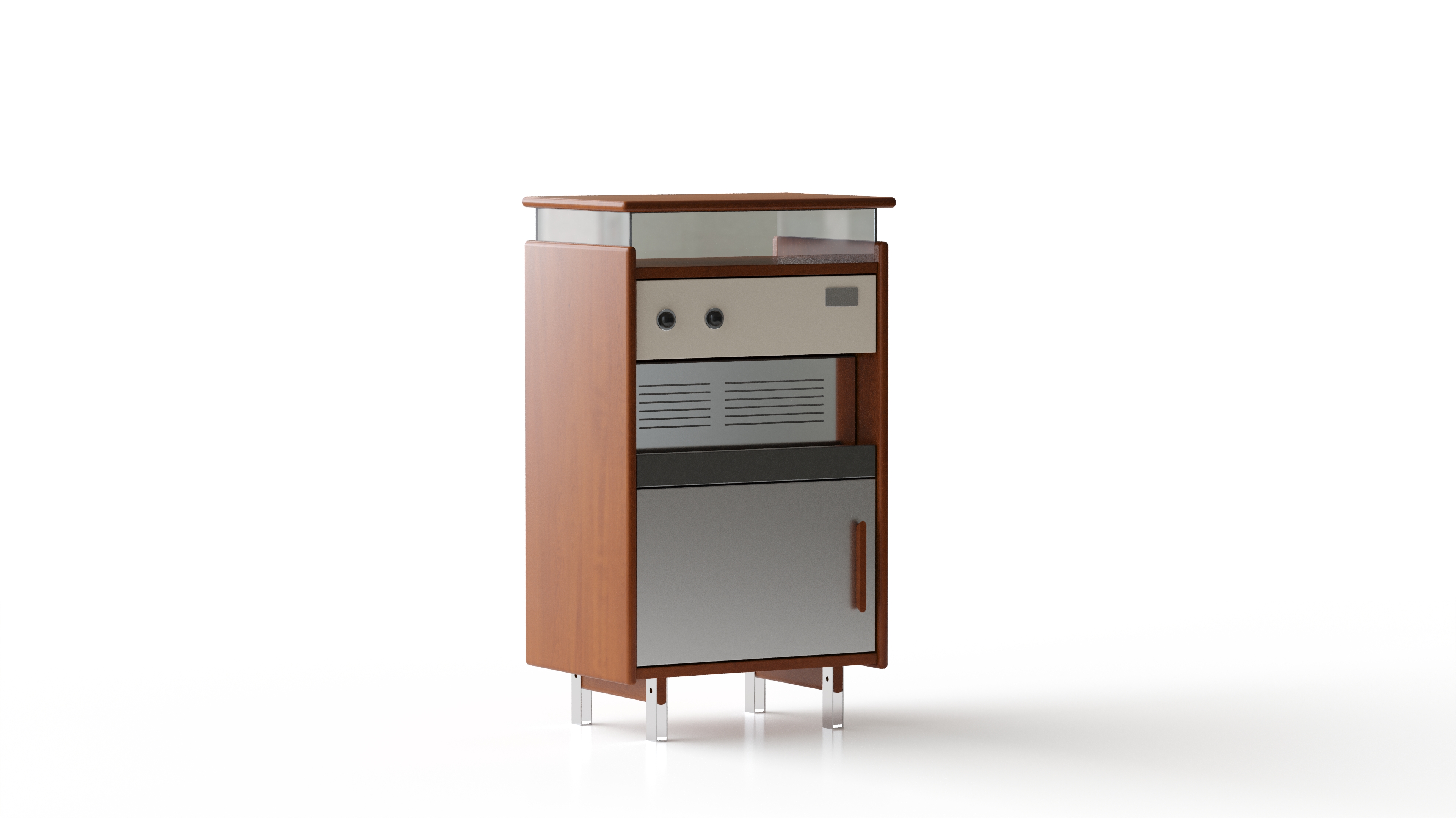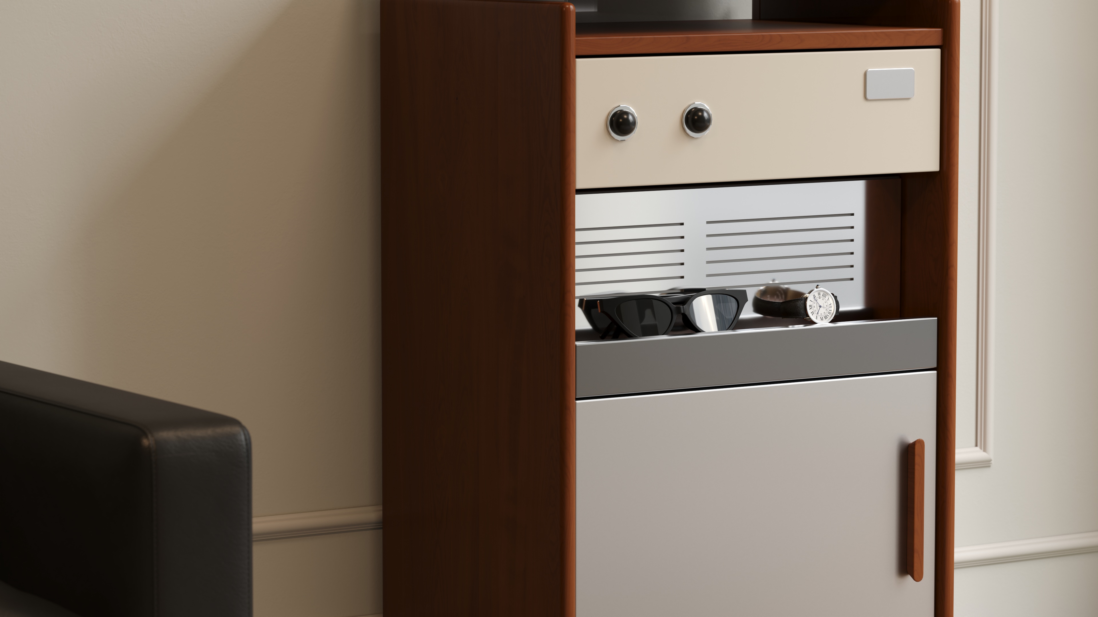 With a framework of minimalist geometric lines, we construct a clear and elegant spatial order. This is not merely a piece of furniture, but a miniature, mobile piece of architecture. At its core is a carefully orchestrated symphony of materials: