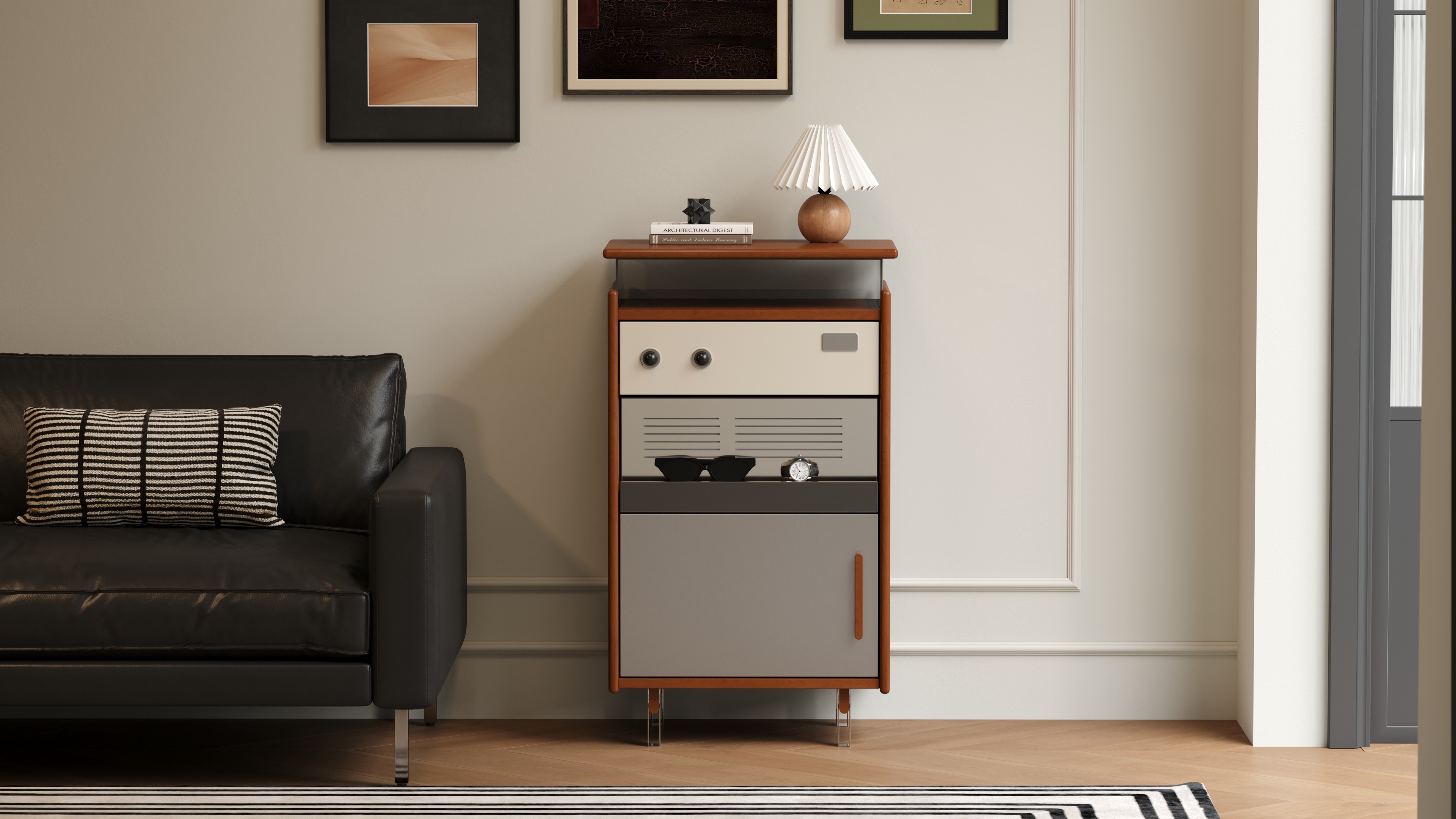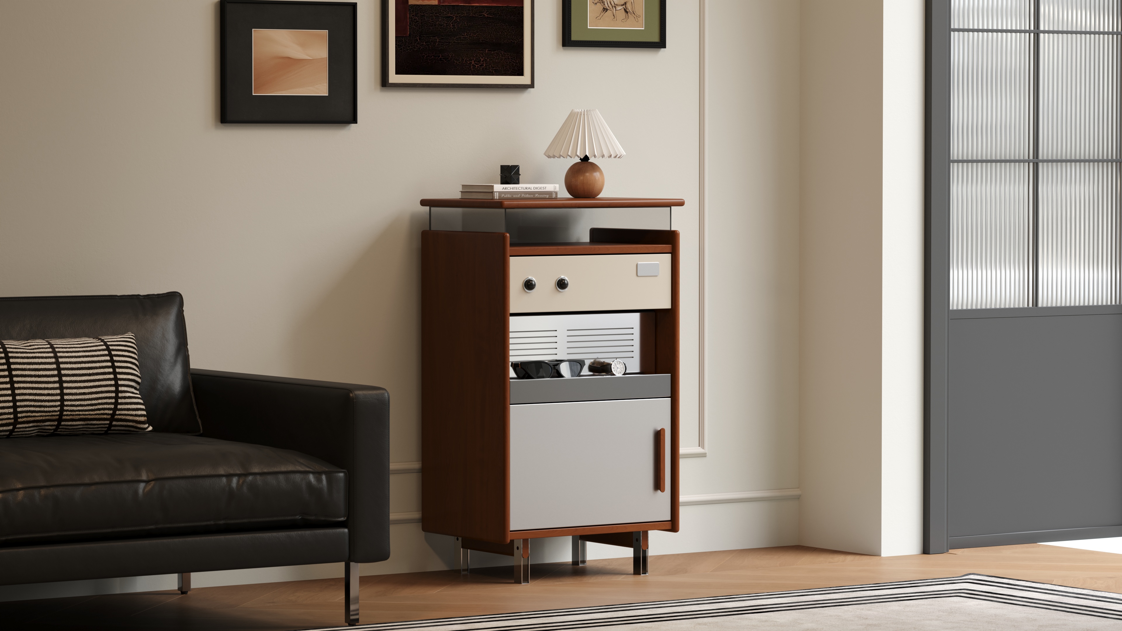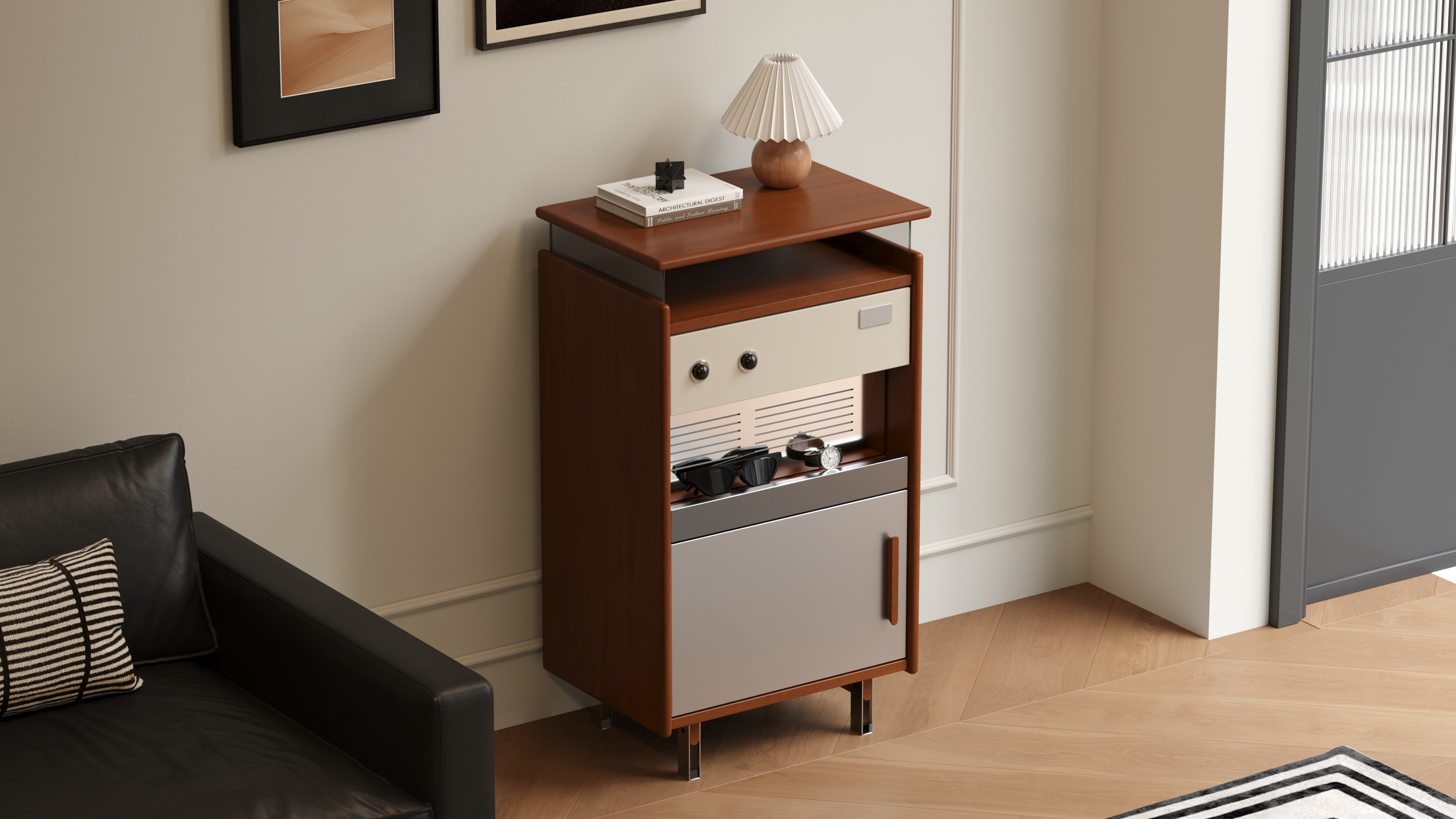 True to the principle of "form follows function," we have created an exceptionally practical five-zone storage system within its compact form. From the glass display top and the semi-open drawer to the slatted shelf and the enclosed cabinet, every inch of space is assigned a clear purpose, turning storage itself into a form of ordered beauty.