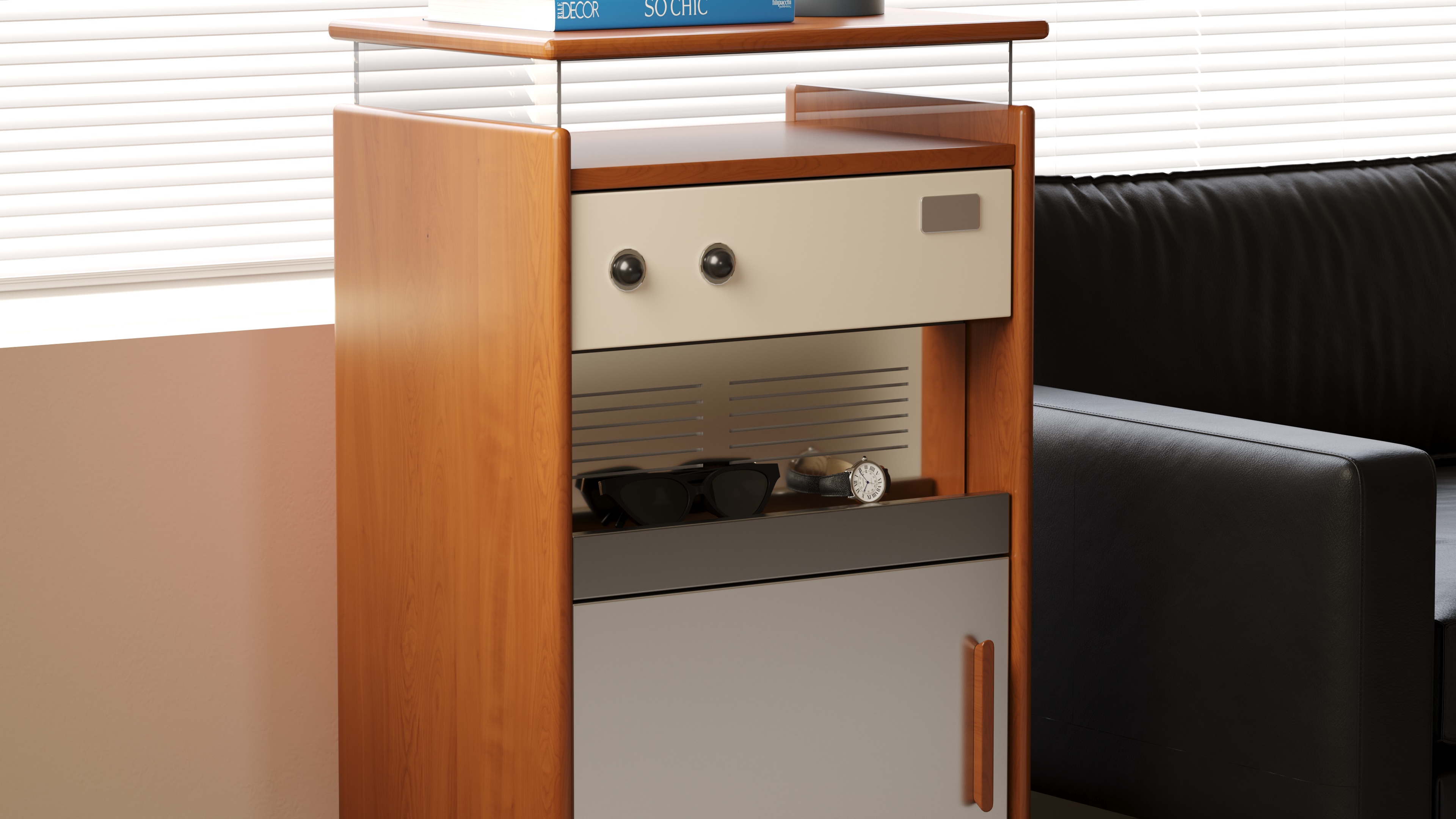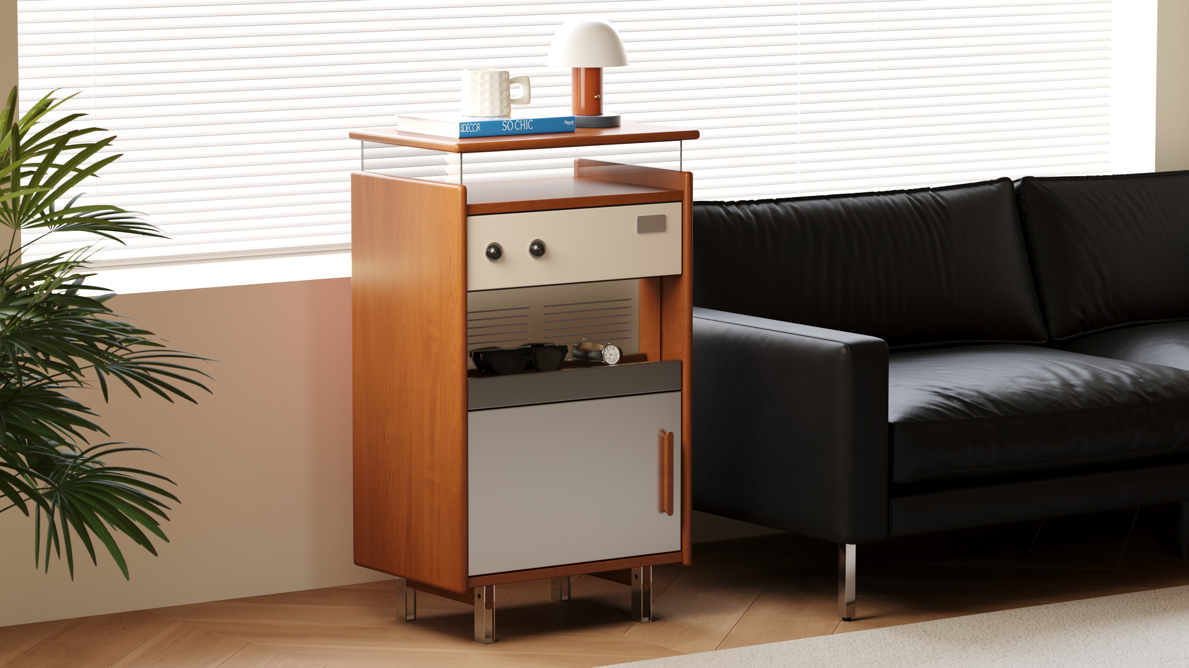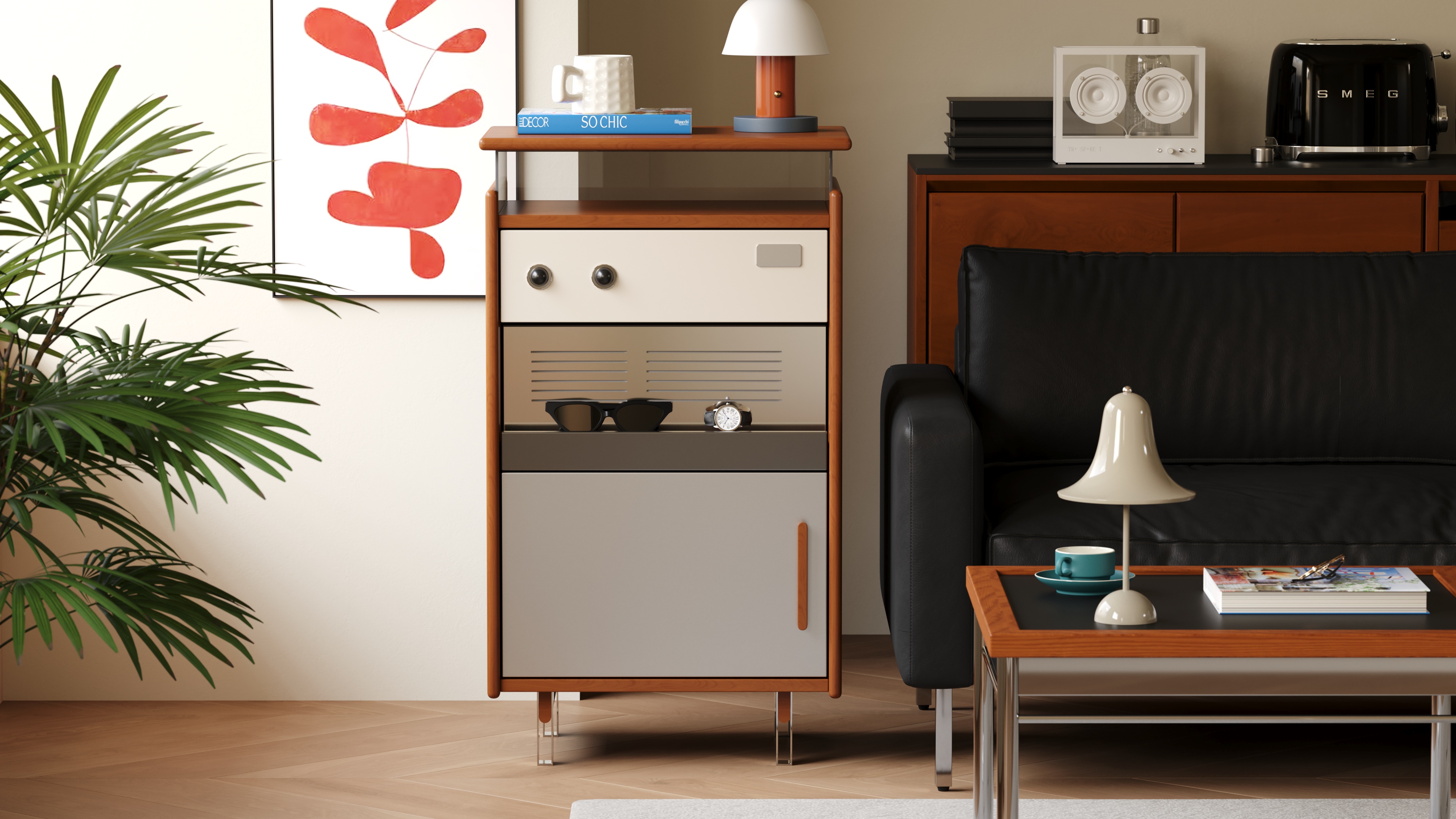 True to the principle of "form follows function," we have created an exceptionally practical five-zone storage system within its compact form. From the glass display top and the semi-open drawer to the slatted shelf and the enclosed cabinet, every inch of space is assigned a clear purpose, turning storage itself into a form of ordered beauty.