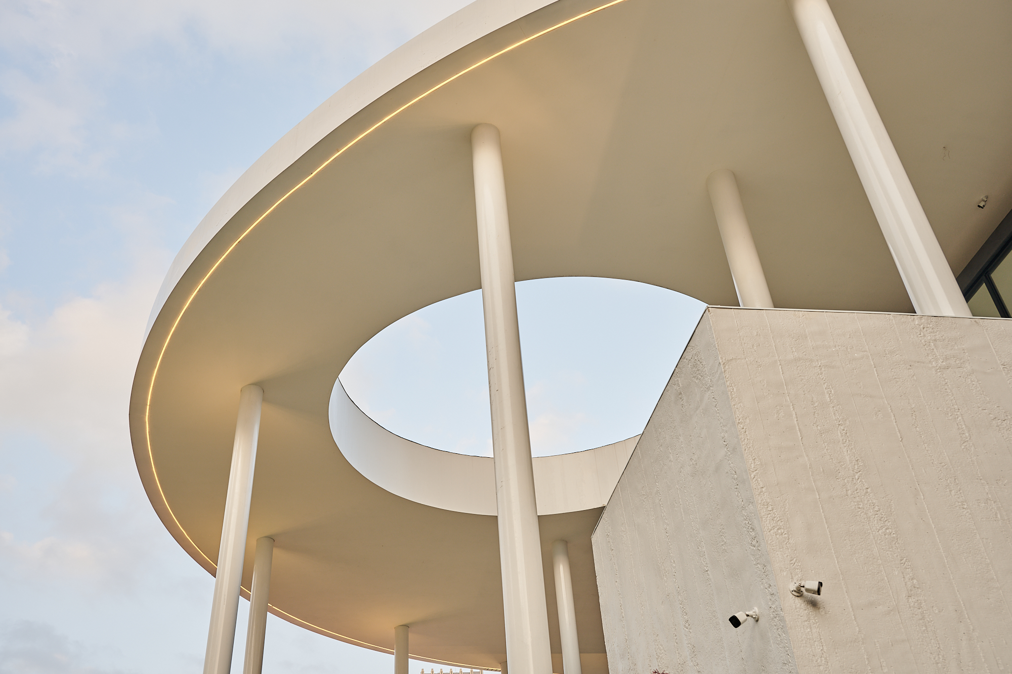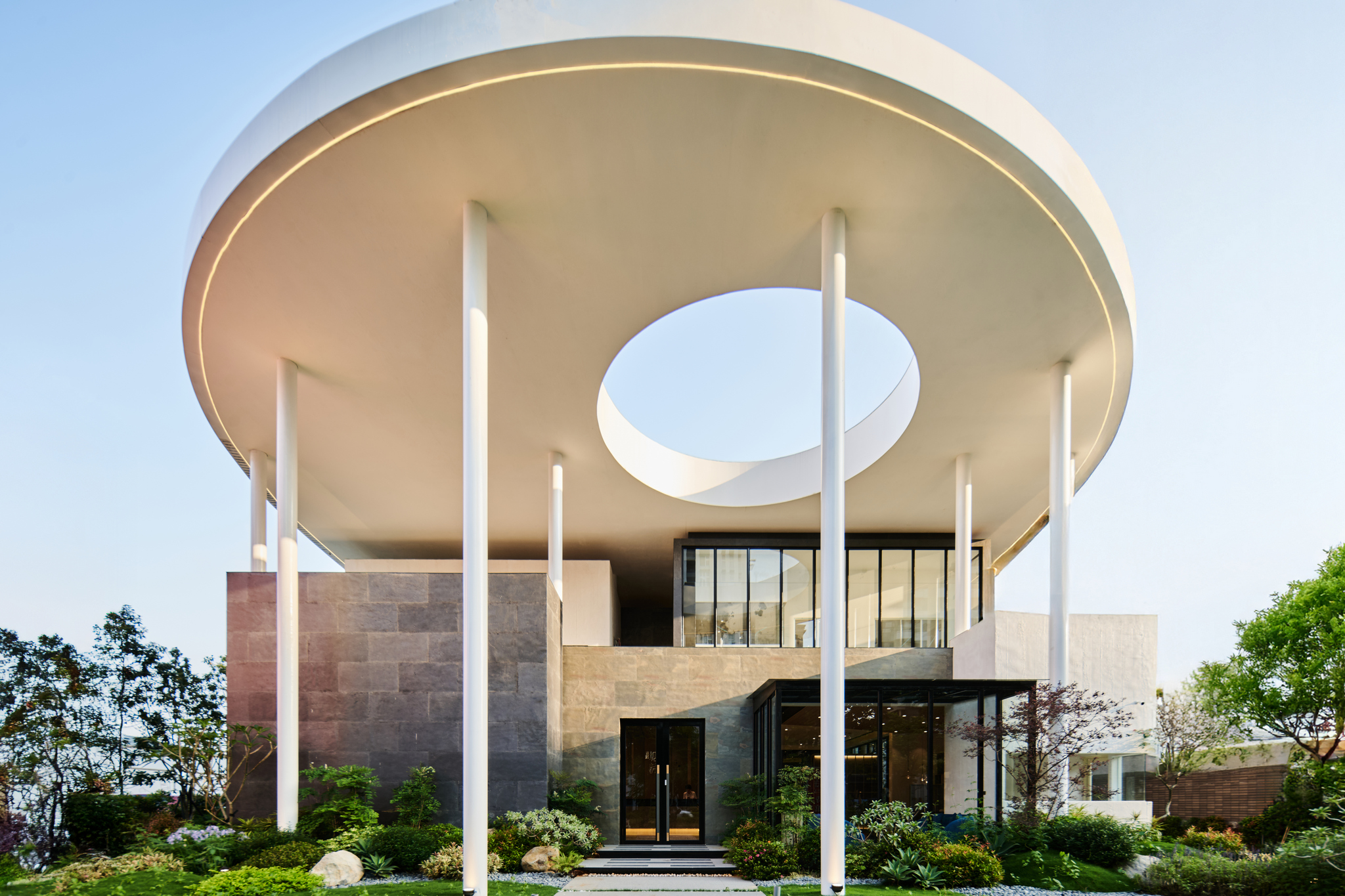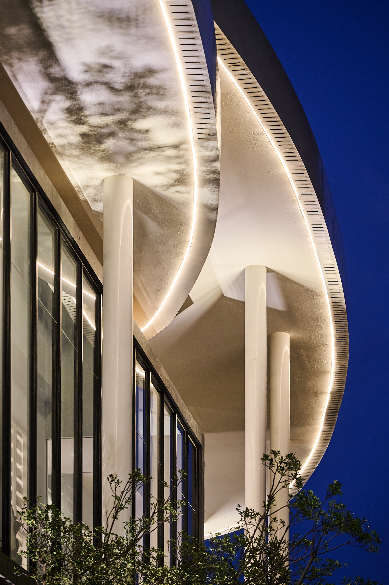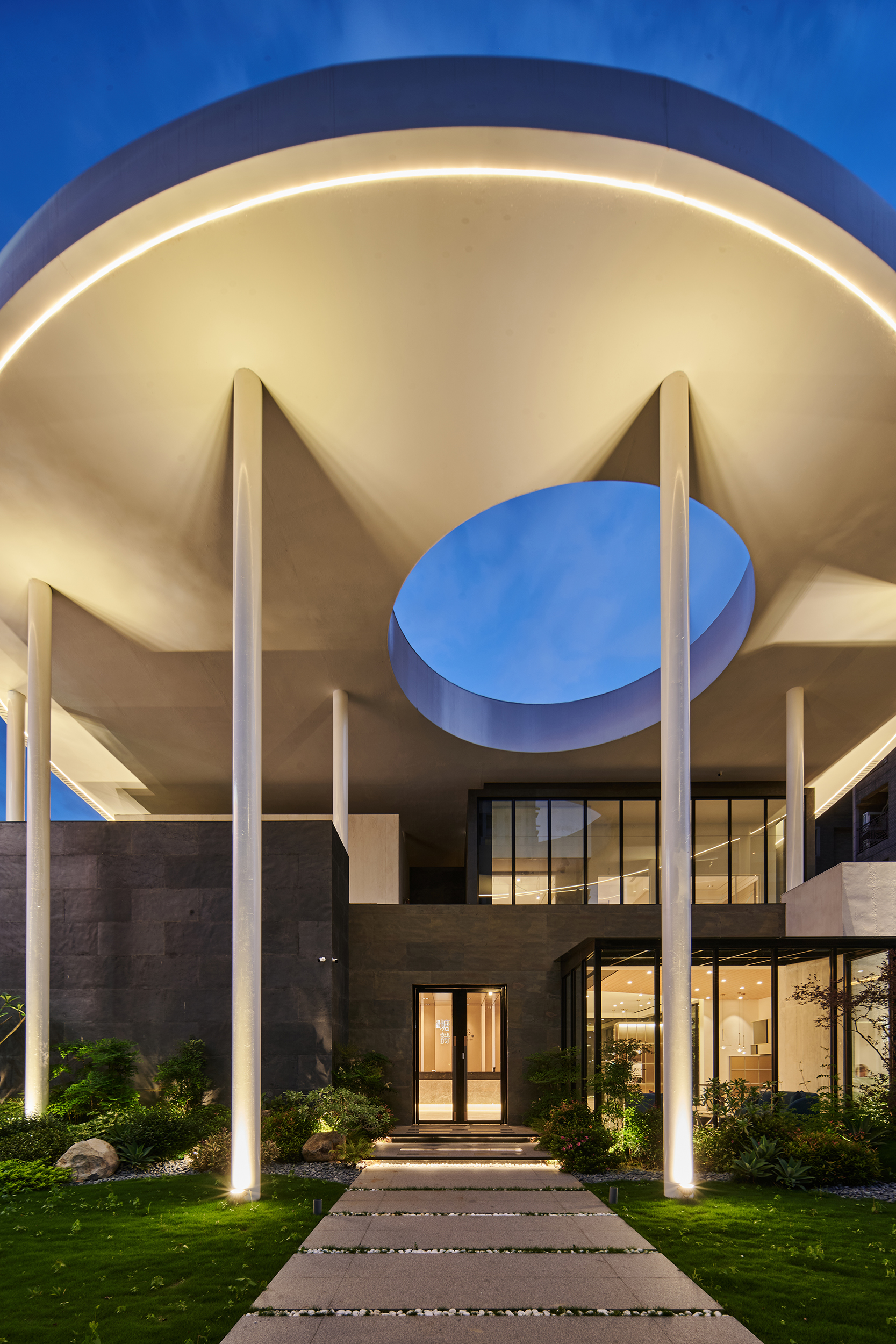 The project, located in Qingpu, Taoyuan, draws from Taiwan’s iconic irrigation ponds to reinterpret water ripples as two overlapping sloped roof forms. Resembling a lightweight hat suspended over the building, the design channels rainwater downward while its central cut-out brings in sky views and natural light. Below, 40 slender columns support interlocked volumes that appear to emerge naturally from the ground. The nighttime lighting composition—featuring curved lines, wall washers, and column uplights—gives the building both transparency and radiance throughout the day.