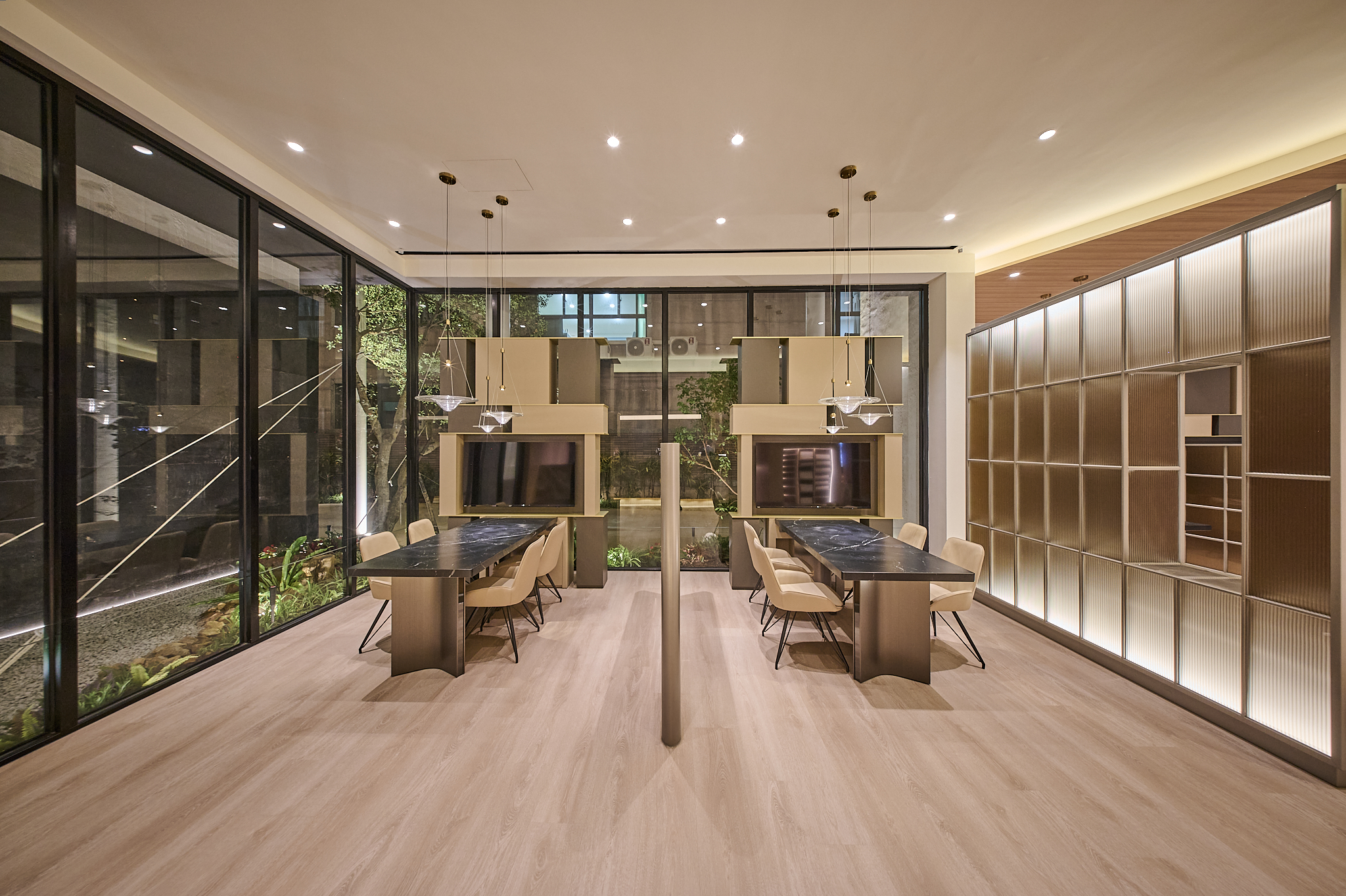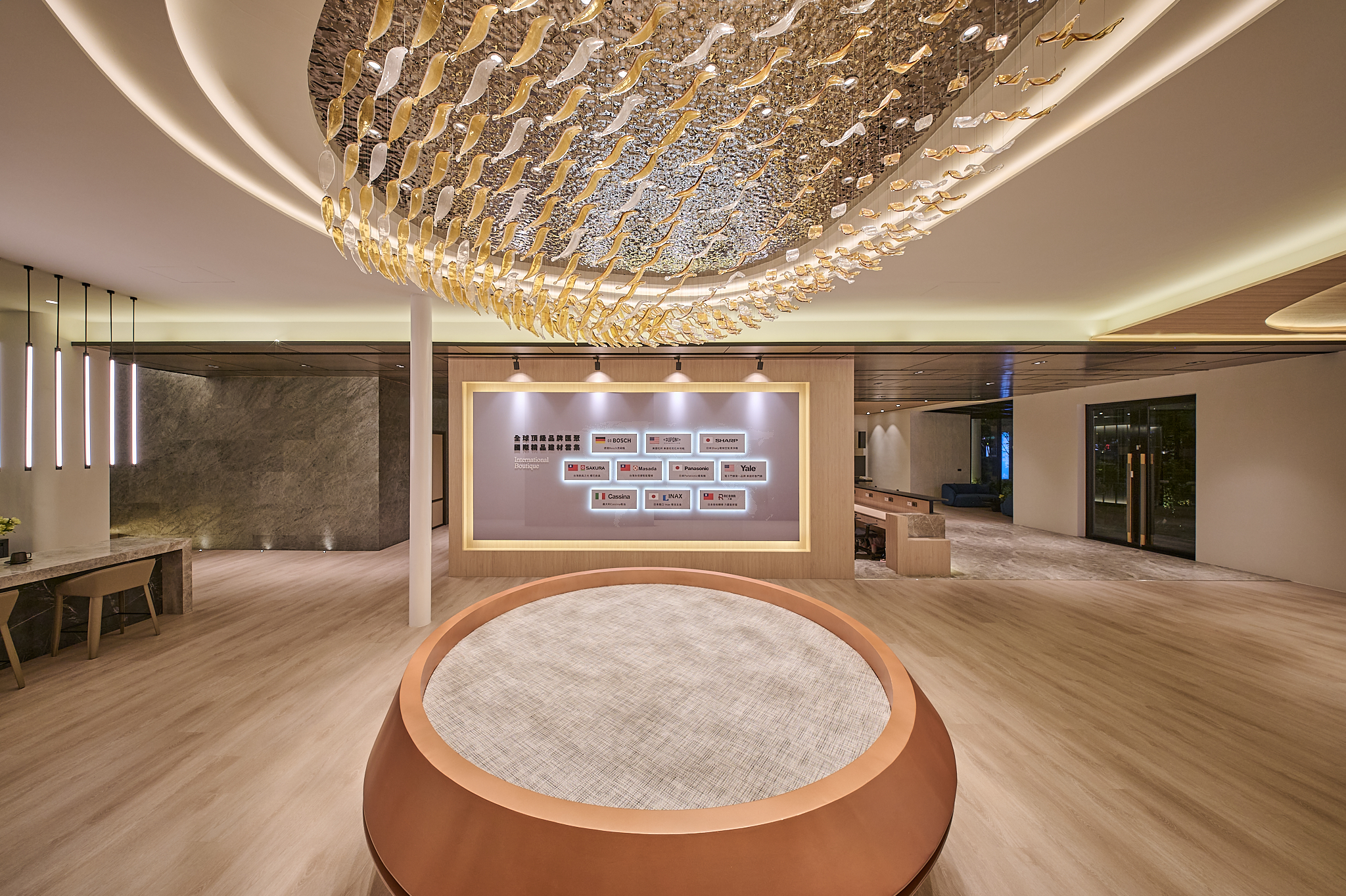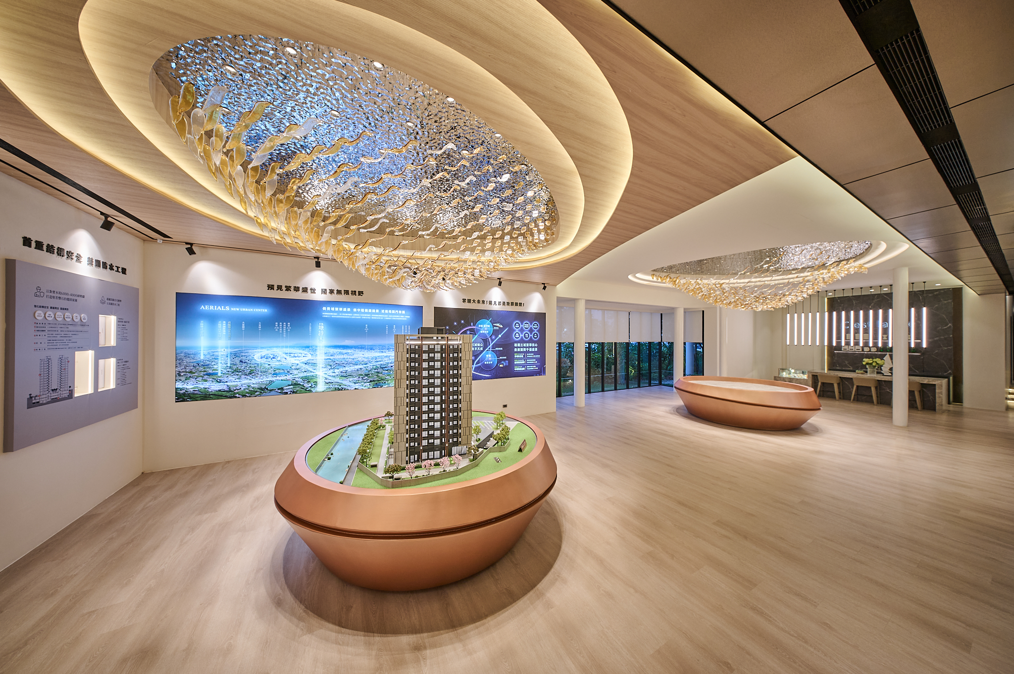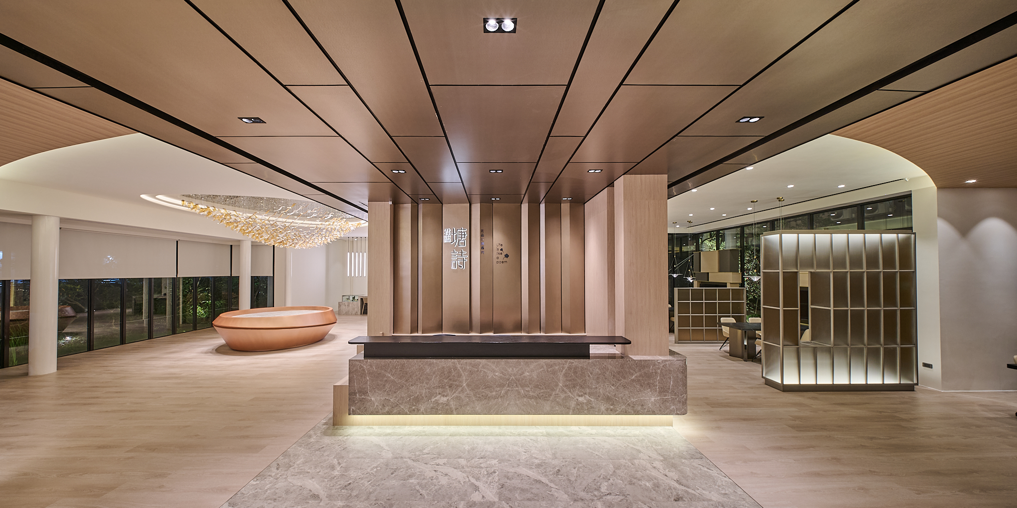 The project, located in Qingpu, Taoyuan, draws from Taiwan’s iconic irrigation ponds to reinterpret water ripples as two overlapping sloped roof forms. Resembling a lightweight hat suspended over the building, the design channels rainwater downward while its central cut-out brings in sky views and natural light. Below, 40 slender columns support interlocked volumes that appear to emerge naturally from the ground. The nighttime lighting composition—featuring curved lines, wall washers, and column uplights—gives the building both transparency and radiance throughout the day.