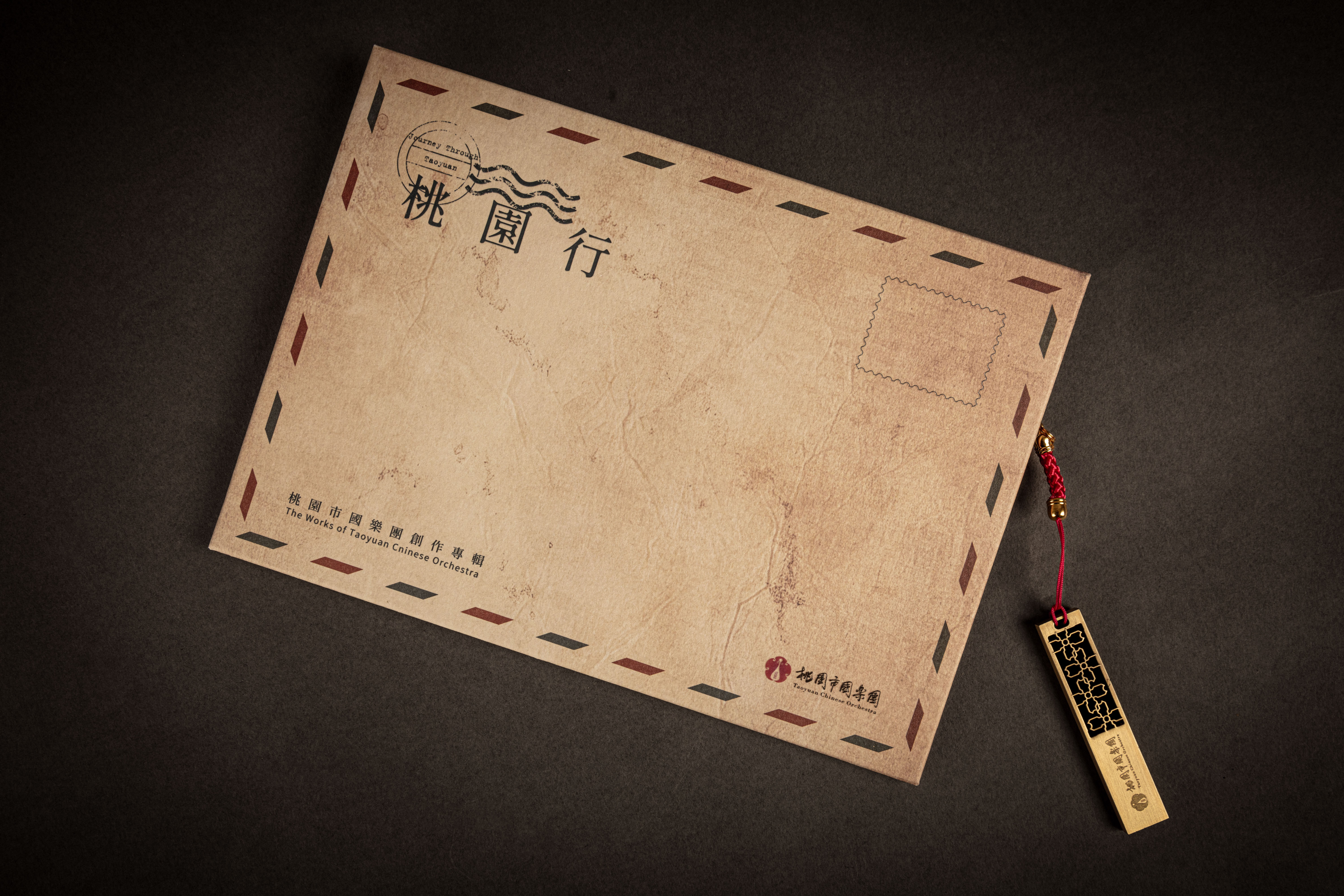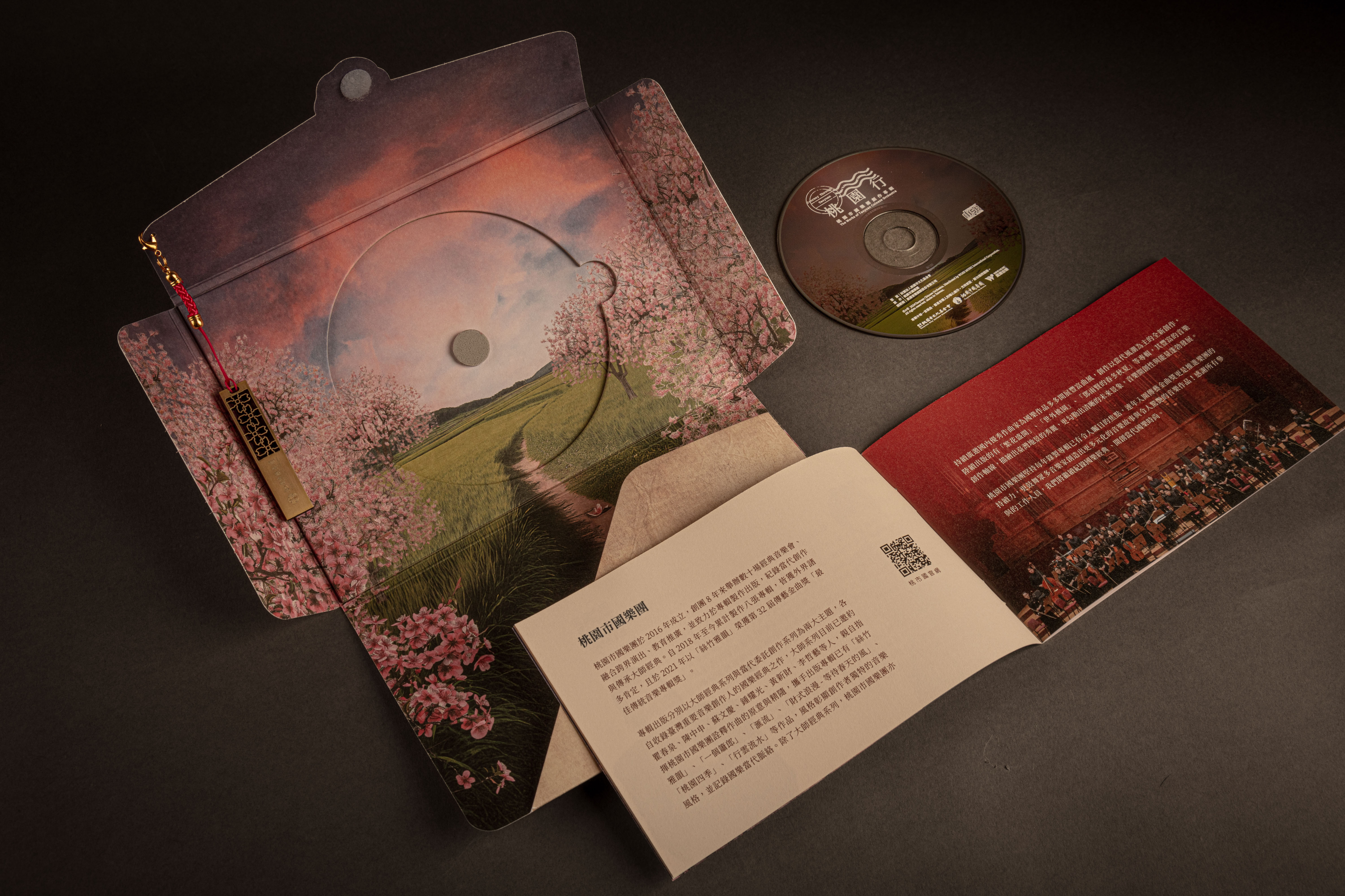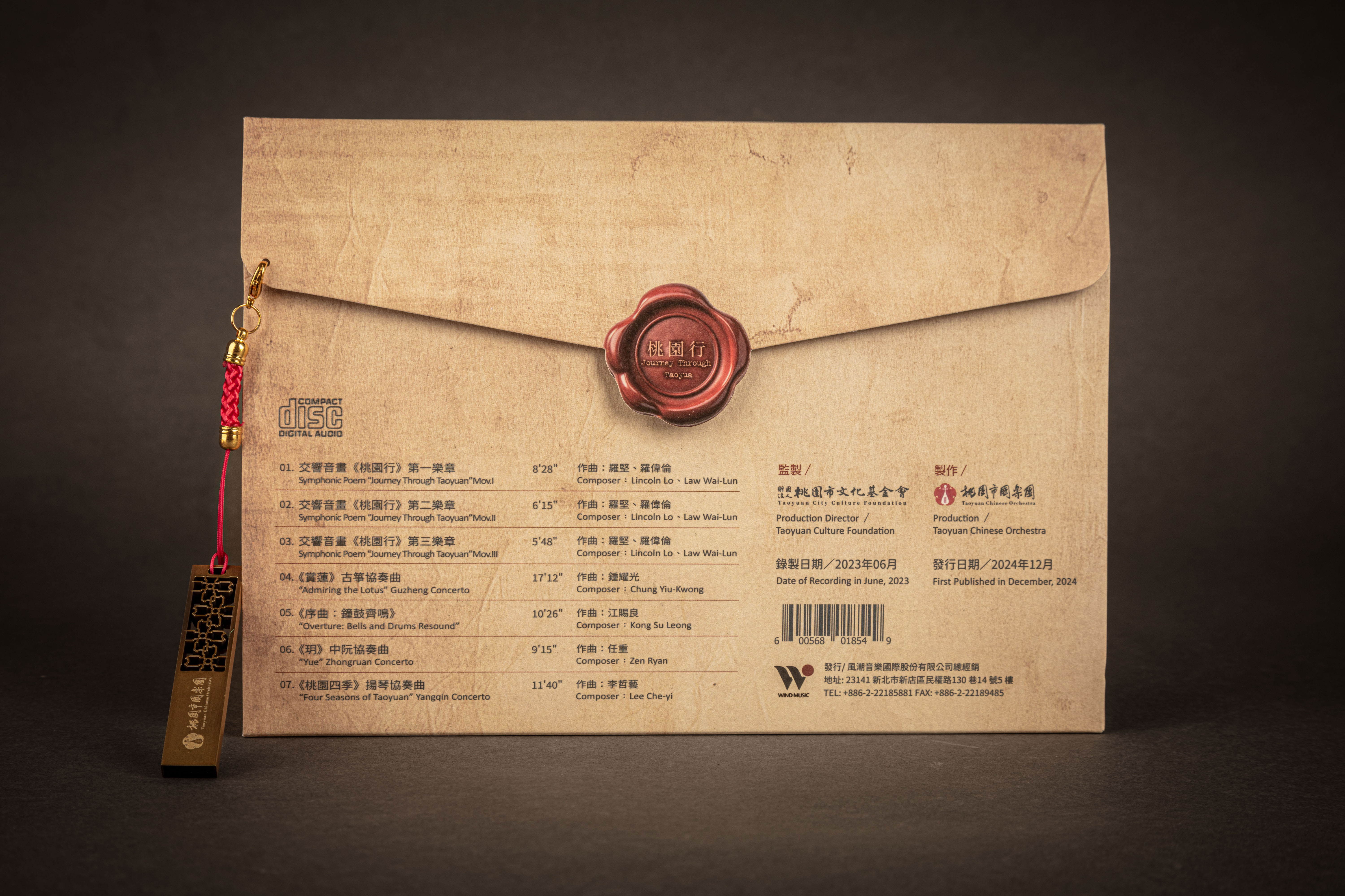 The CD packaging resembles a letter envelope, featuring thoughtful details—postage stamp frames, postal markings, the orchestra’s name as sender, a wax seal closure, and dimensions based on standard envelopes. A gold USB drive, specially designed for this project, dangles from the side like a decorative charm, enhancing the elegant, gift-like feel. The USB is inspired by traditional Chinese lattice windows, rendered in an openwork gold pattern and tied with a red Chinese knot symbolizing joy and blessing. Each USB contains the complete Journey Through Taoyuan album in MP3 format, offering another way to experience the music.