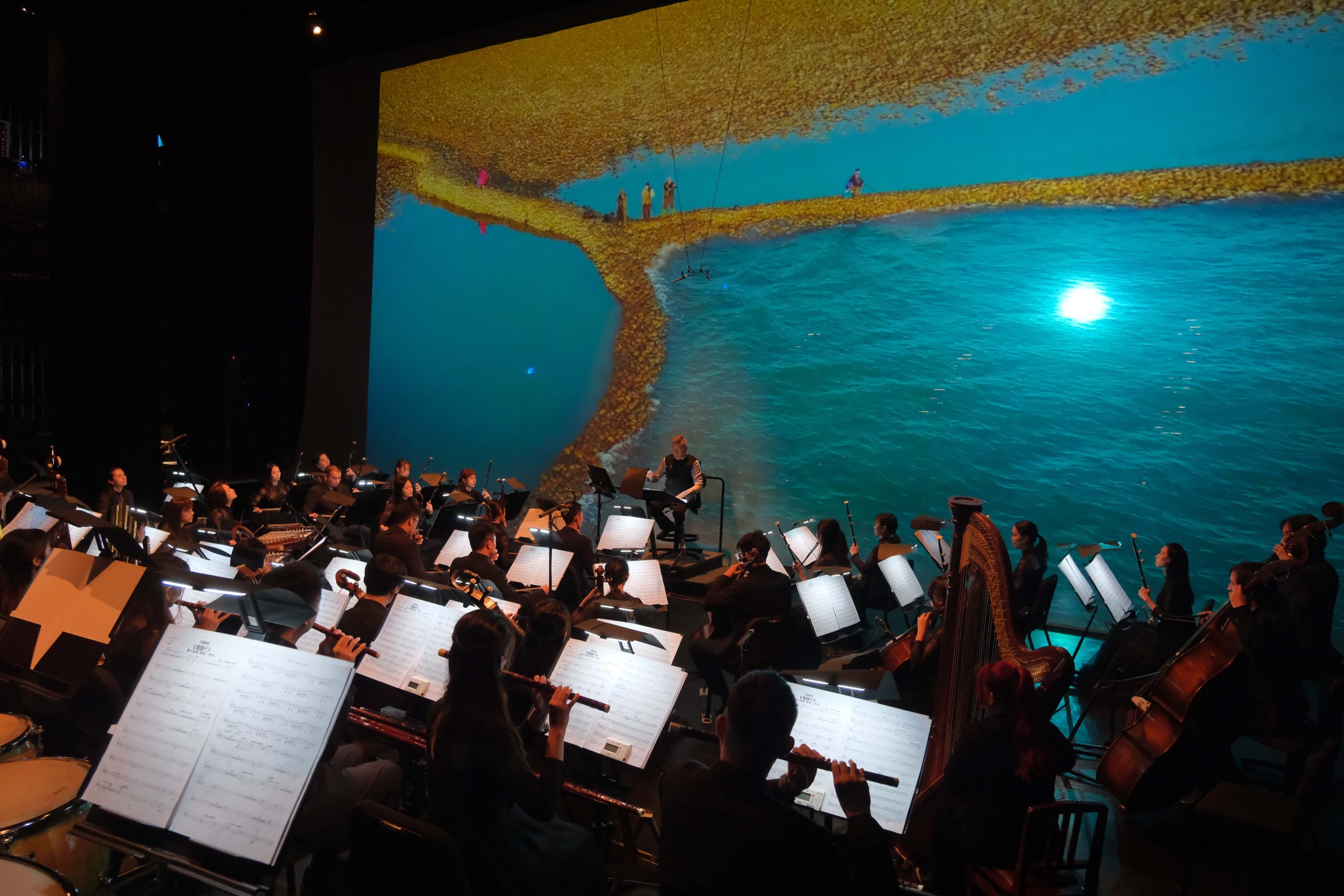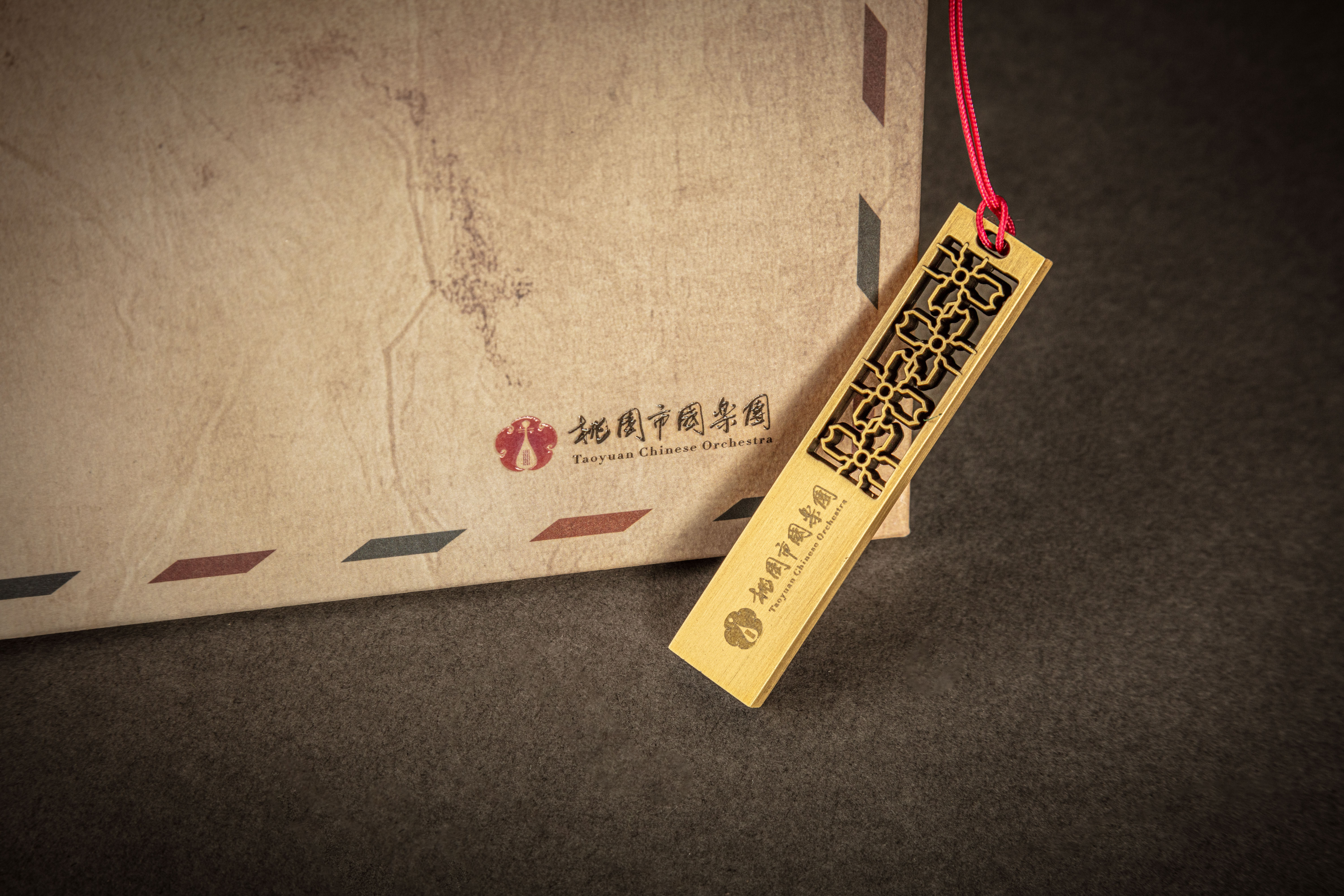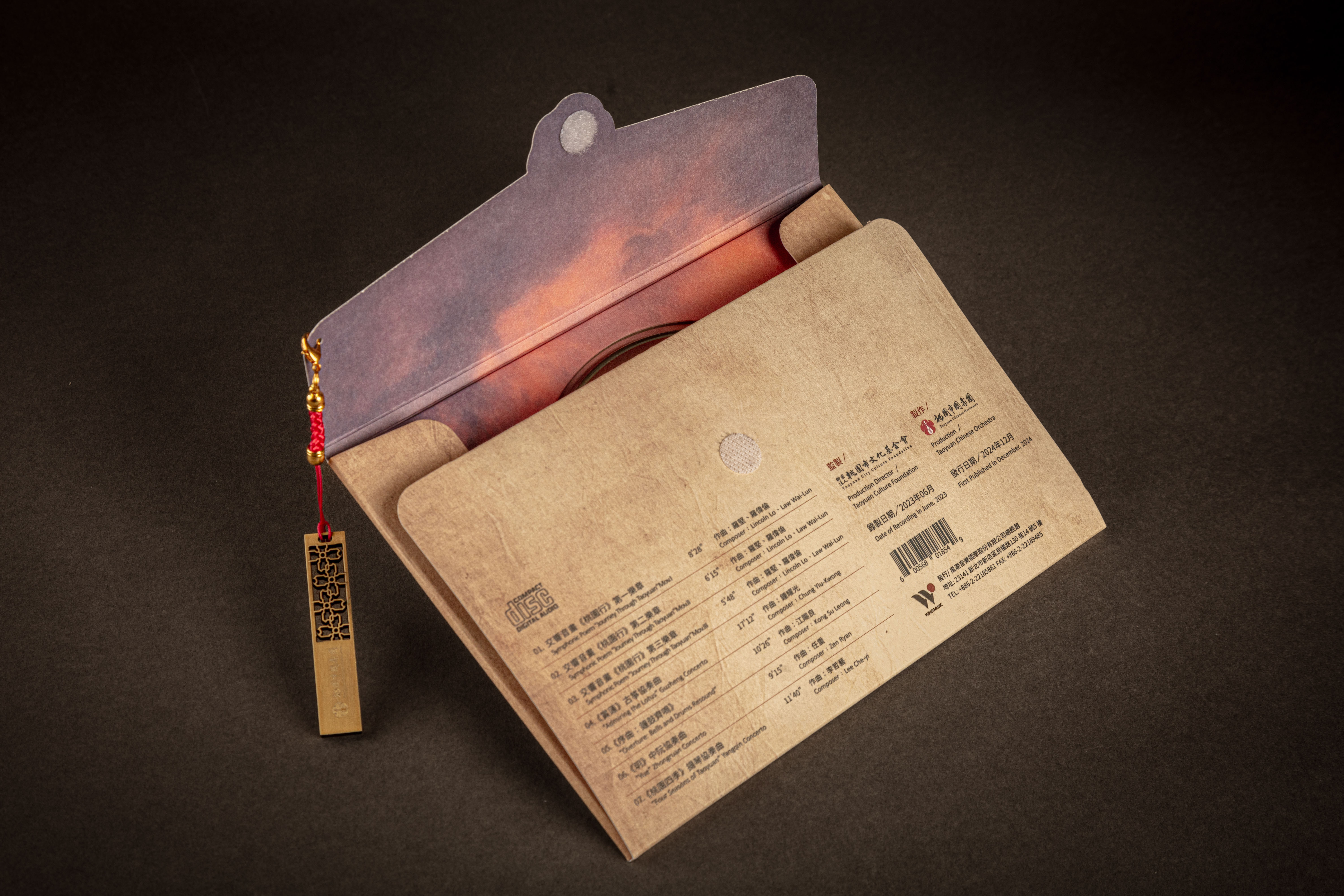 The CD packaging resembles a letter envelope, featuring thoughtful details—postage stamp frames, postal markings, the orchestra’s name as sender, a wax seal closure, and dimensions based on standard envelopes. A gold USB drive, specially designed for this project, dangles from the side like a decorative charm, enhancing the elegant, gift-like feel. The USB is inspired by traditional Chinese lattice windows, rendered in an openwork gold pattern and tied with a red Chinese knot symbolizing joy and blessing. Each USB contains the complete Journey Through Taoyuan album in MP3 format, offering another way to experience the music.