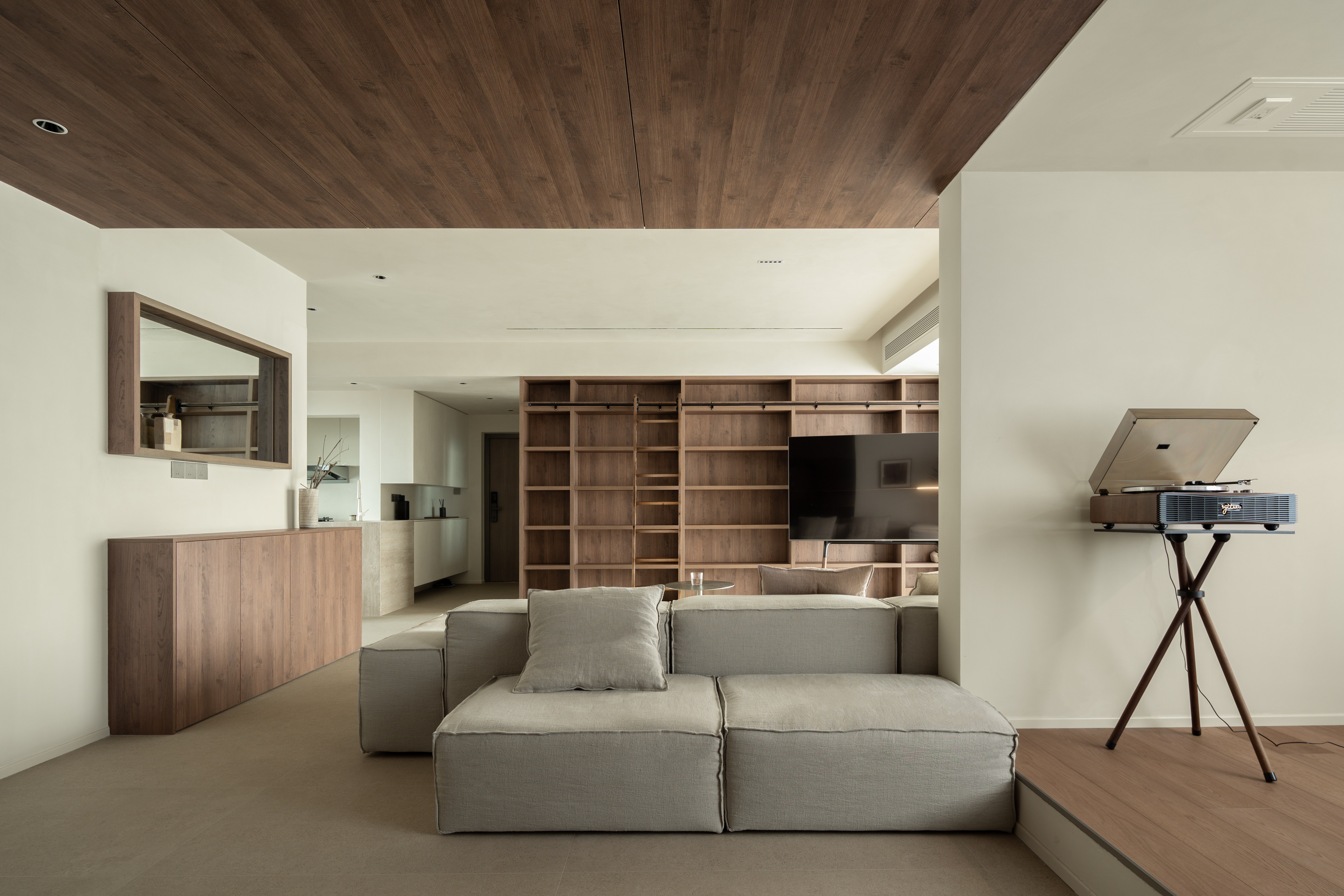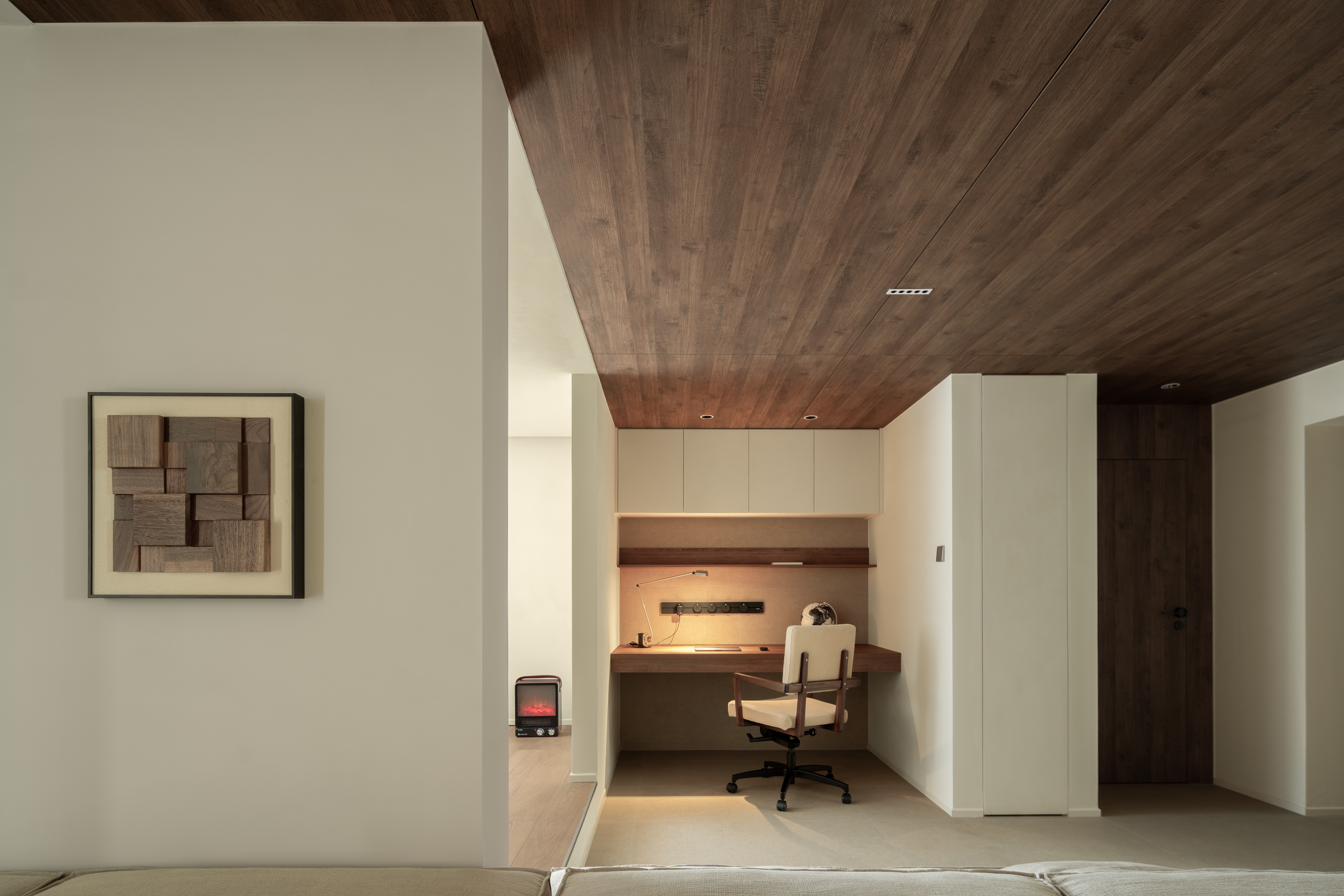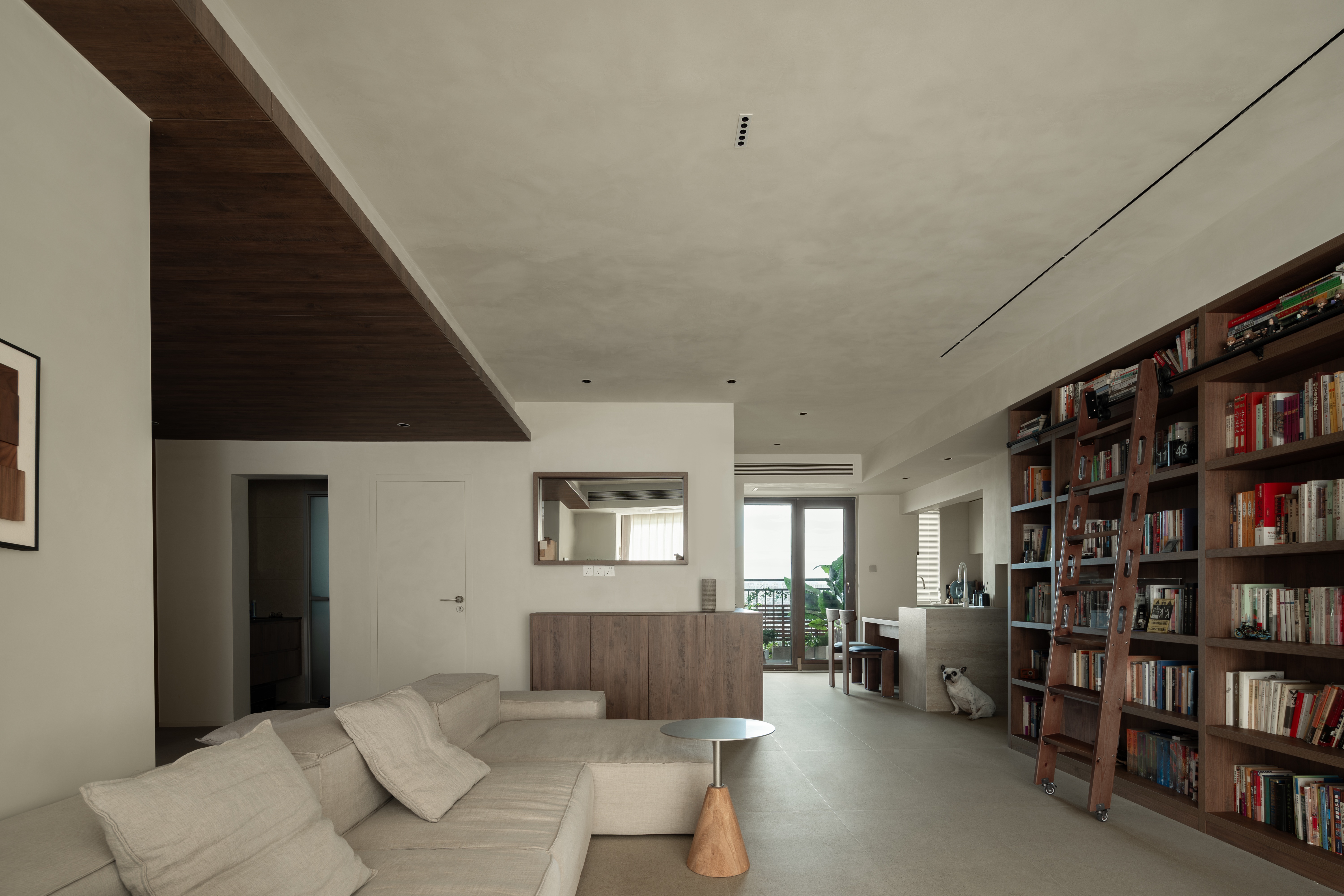 To achieve spatial division without isolation, a full-width wooden decorative overhang was employed on the ceiling behind the sofa, creating a visual demarcation of zones while enhancing the sense of stability and enclosure around the desk area. The harmonious textures of the flooring and wall materials further fostered a relaxed and liberating atmosphere upon returning home. Thus, the conventional living room was transformed into a multifunctional space integrating a library, audiovisual room, study, and comfortable lounging area.