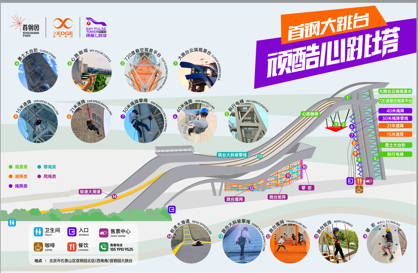 The Sky Pulse Tower is a distinctive extreme adventure experience sports project created by Shanghai X-EDGE sports & Culture Group Co., Ltd. relying on the physical space of the Shougang Ski Big Air. As an inno-vative benchmark for the sustainable reuse of post-Winter Olympics herit-age, this project takes the three functional areas of the Shougang Ski Big Air, the starting area, take-off area, and landing area, which are permanent-ly preserved in the world. It skillfully utilizes the steel frame structure, ski jump slope, and industrial landscape to innovatively create projects such as Heartbeat Coffee, a 720° suspended viewing platform, 15m/21m speed de-scent, 30m rope descent and climbing, 40m rope descent, rope climbing on the big slope of the ski jump, rock climbing, ski jump matrix, ski jump magic net, and extreme big slide, unlocking heart-pounding experiences for all ages. From the Winter Olympics venue to the national heart-pounding bat-tlefield, the "Cool Heartbeat Tower" of the Shougang Big Air is not only an amusement park but also a living exhibition hall for urban renewal. It is re-defining the new concept and integration of sports, culture, and tourism with hardcore industrial aesthetics and the spirit of extreme sports!
