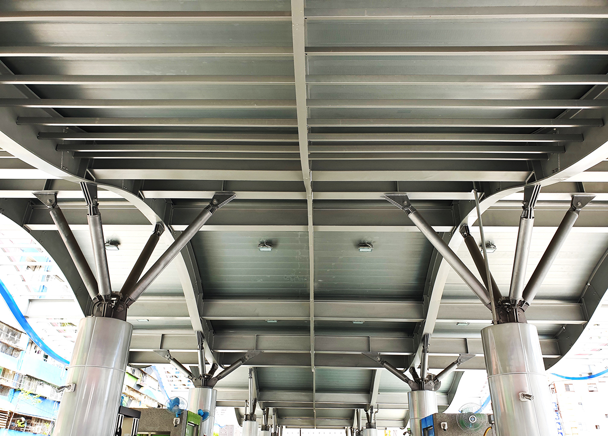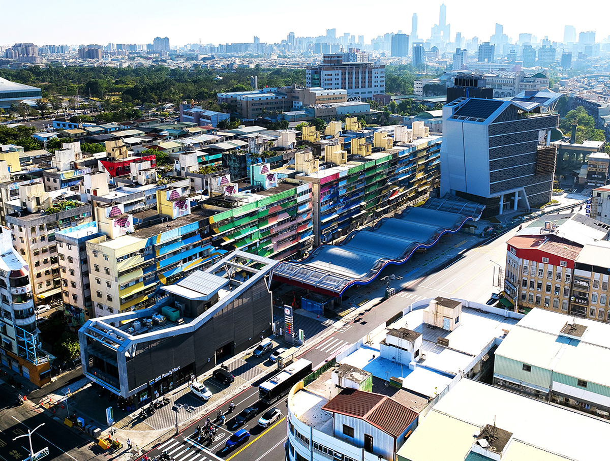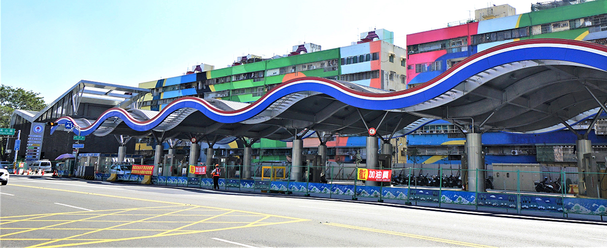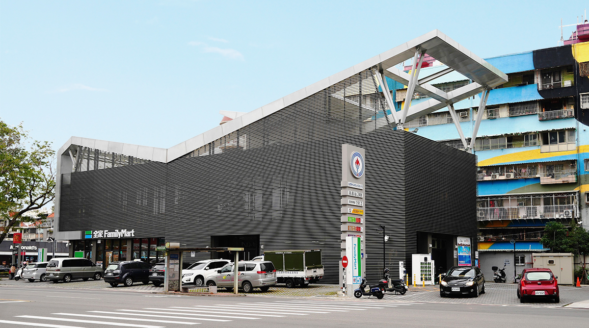 Located in central Fengshan district north of Weiwuying Military district and beneath the Jianguo Interchange, the project occupies a key transportation node and serves as a spatial urban landmark. Spanning 200 meters along the street, the eastern side houses a two-story service station and fueling station, while the western end features an eight-story office building.