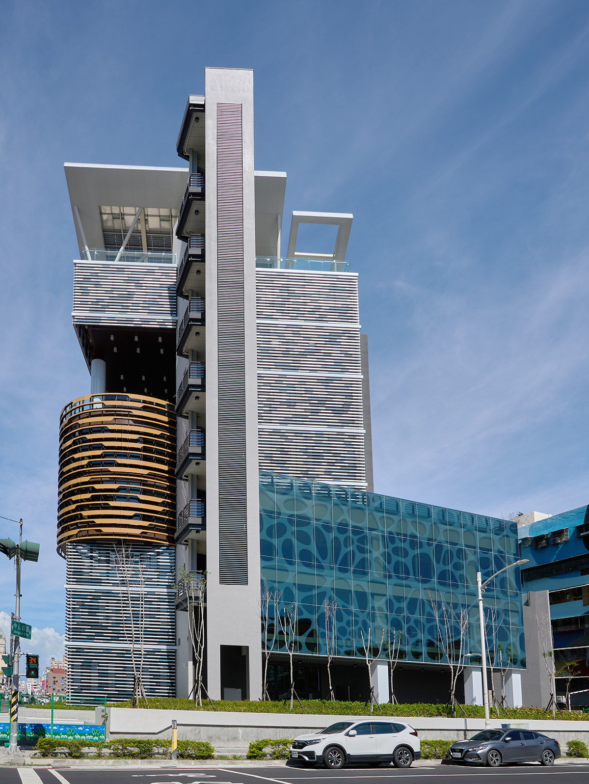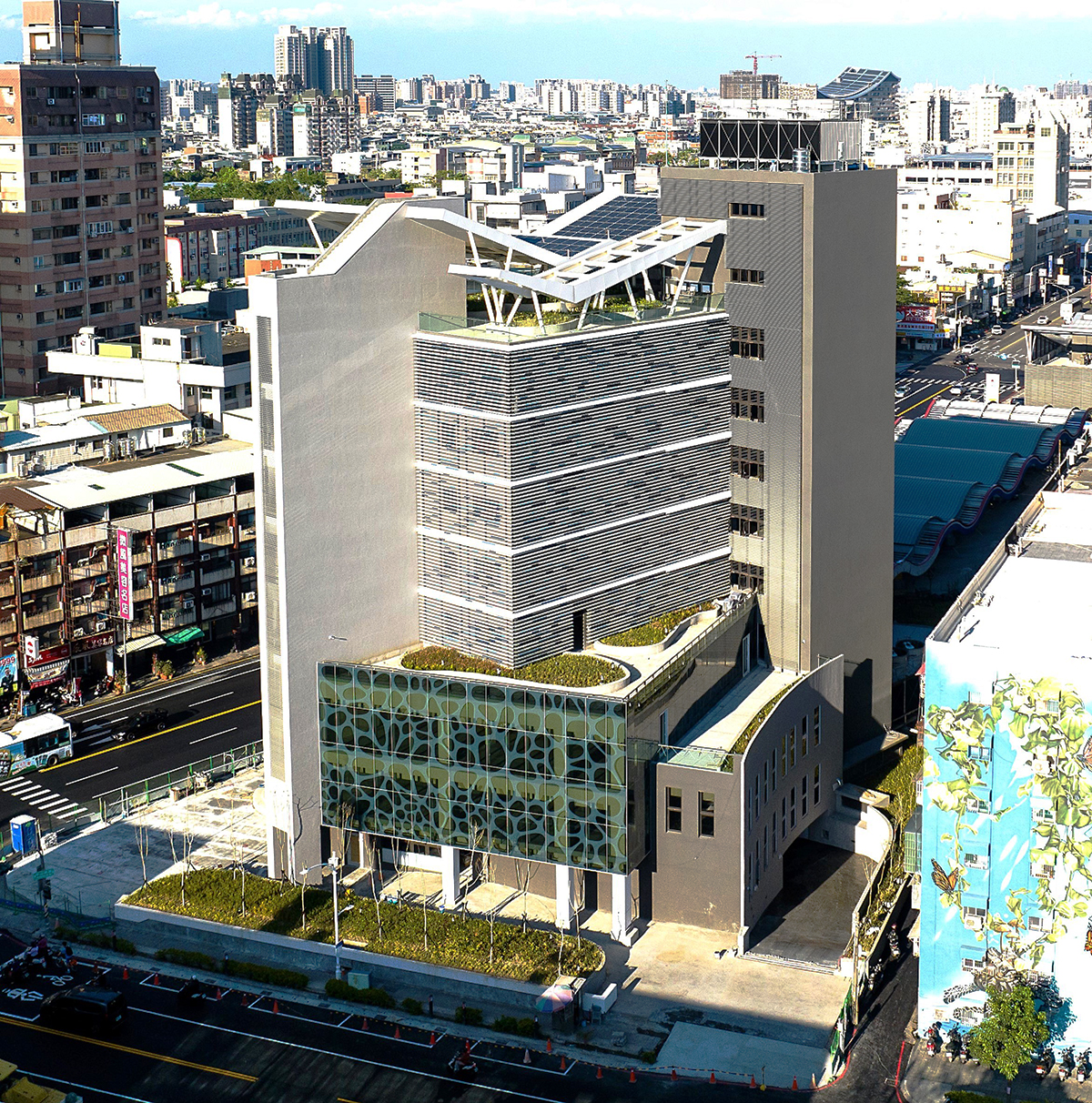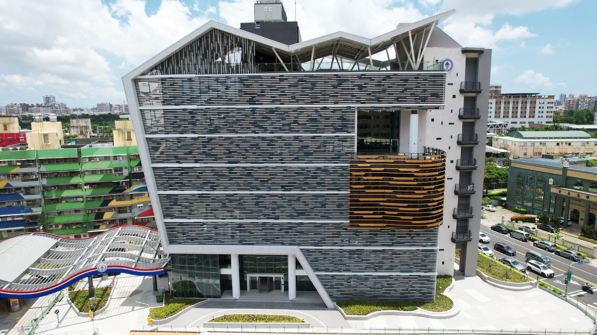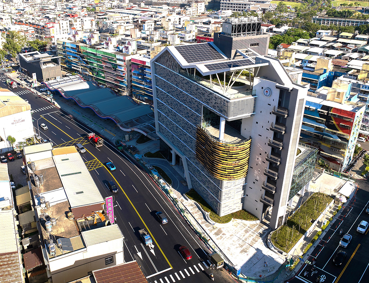 Awarded the Diamond-level Green Building candidate emblem, the building mitigates western heat with semi-outdoor stairwells, and uses double-skin aluminum façades on the east to generate a chimney effect. The south is buffered by vertical shafts and elevator lobbies, with grilles providing shading. Large north-facing windows incorporate anti-glare grilles. The roof features thin-layer greenery and 92kWp of translucent BIPV solar panels.