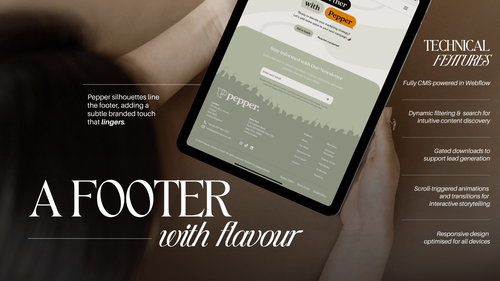 Pepper Agency, a social-first marketing agency, set out to transform its digital presence into an experience that would stand out in a crowded industry and clearly convey its ethos: *people connect with people*. The goal was to create a platform that felt intuitive, editorial, and creator-led, while also reflecting the strategic impact behind its award-winning campaigns.