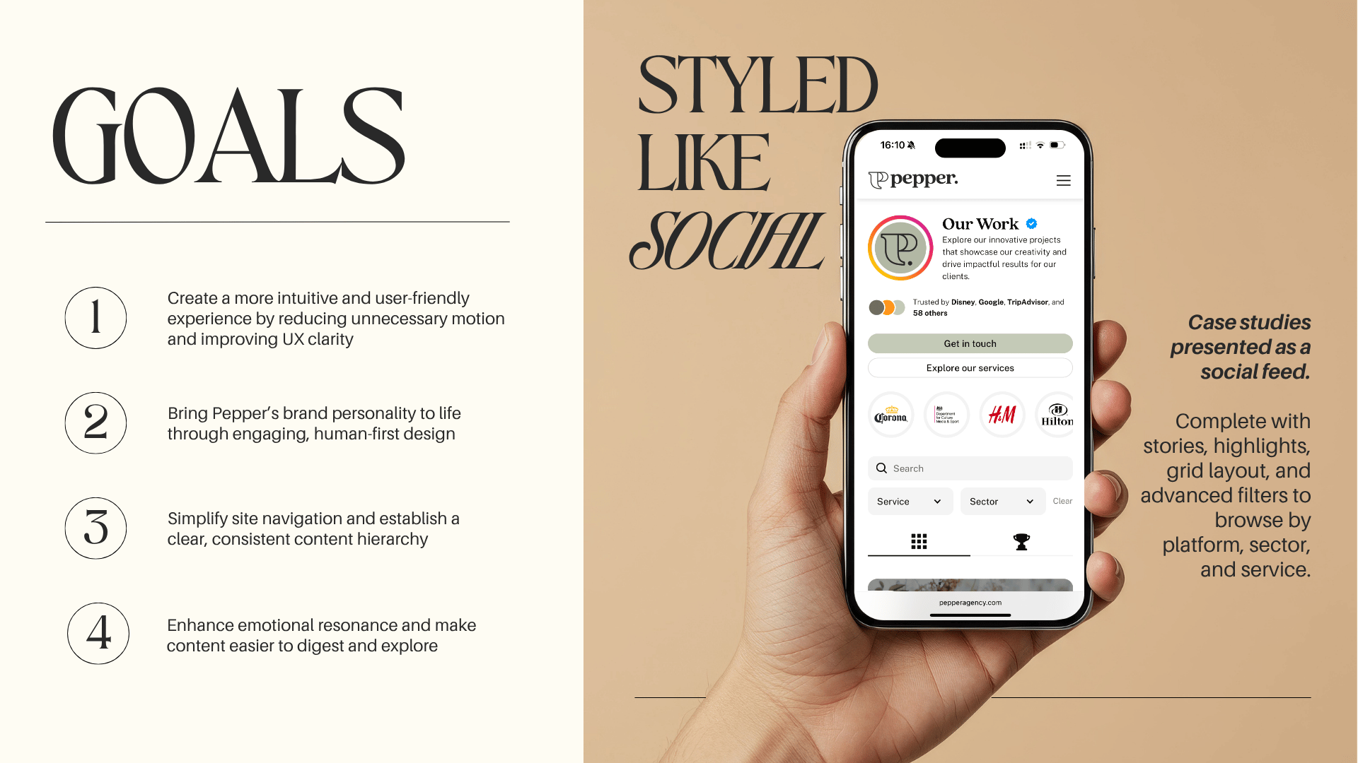 Every visual and structural element was designed to echo Pepper’s presence in the social space, taking cues from the way audiences engage with modern social media content. Grid-based layouts, interactive storytelling elements, and bite-sized content create a rhythm that feels familiar and intuitive to navigate.