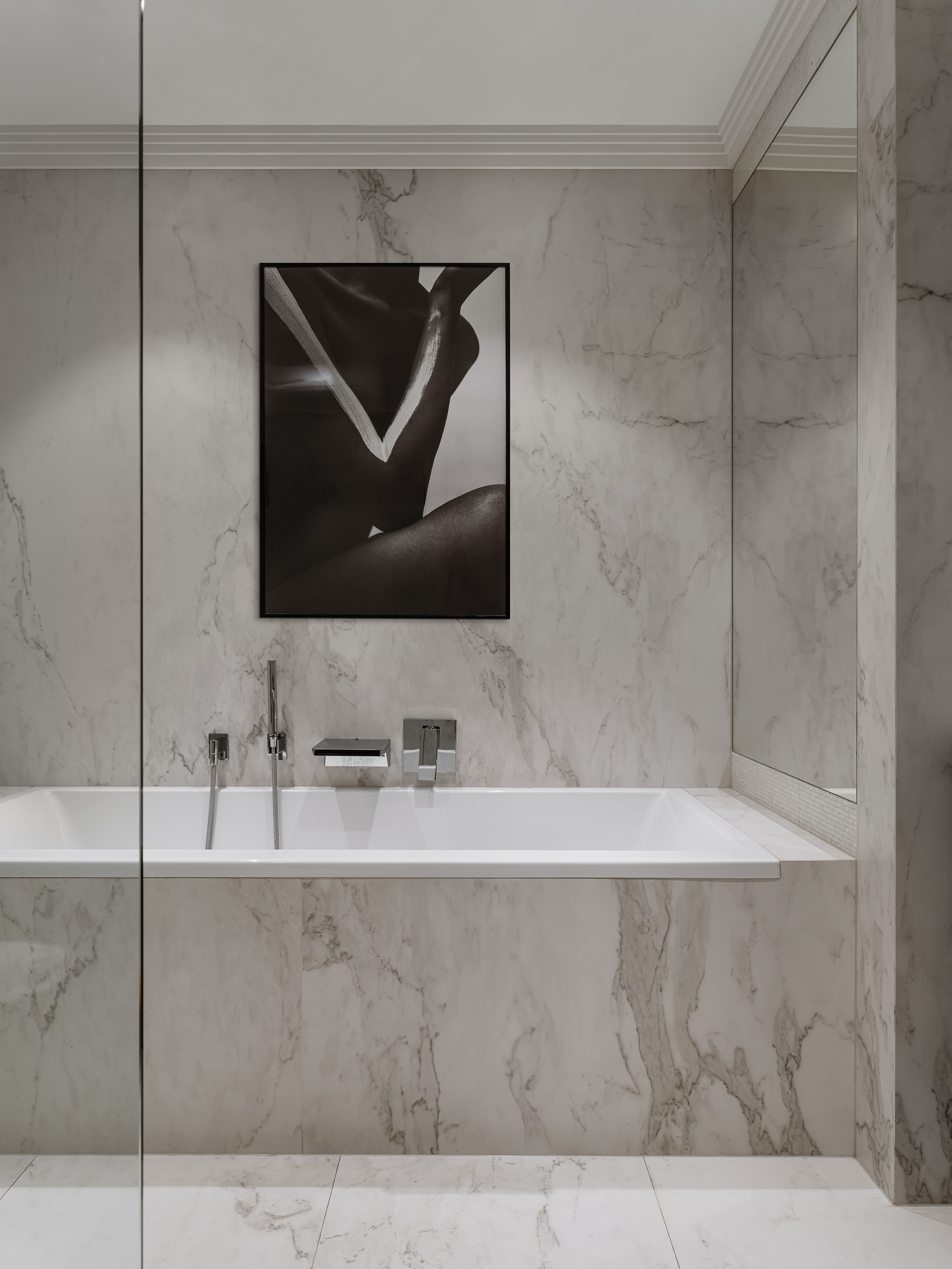 The apartment is furnished with high-end Italian design pieces, including a Poliform kitchen, and select furniture from Dall’Agnese, Misura Emme, and Cattelan Italia, complemented by elegant lighting from Italamp.