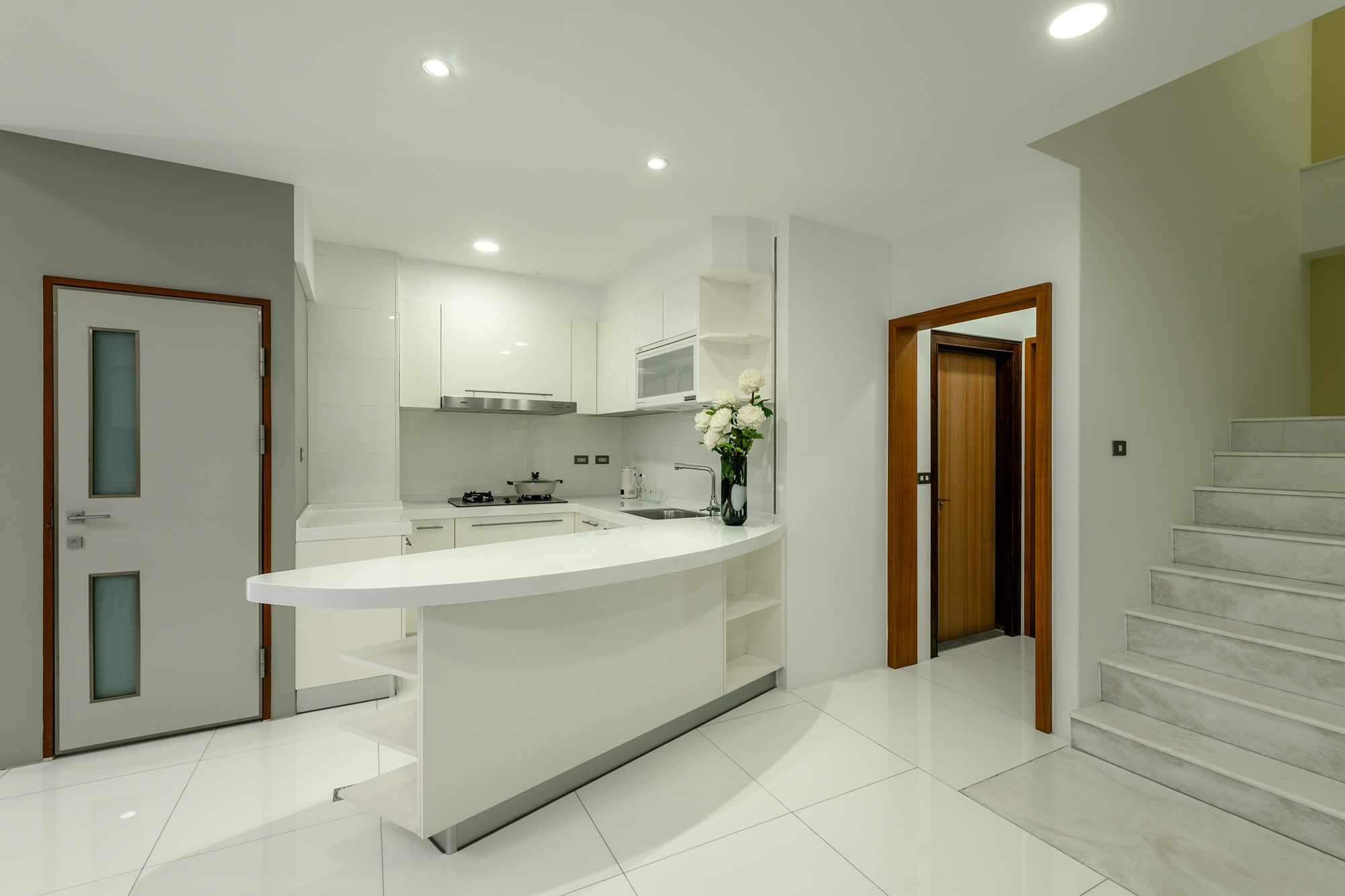 The fourth floor is thoughtfully divided into distinct front and rear sections, each serving its unique purpose. In the front area, a spacious open-plan design showcases a refined white color scheme complemented by cleverly concealed storage solutions, resulting in a clean and uncluttered aesthetic. Notably, a gracefully curved island extends into the dining area, elegantly defining the space while introducing a dynamic rhythm to the overall layout.