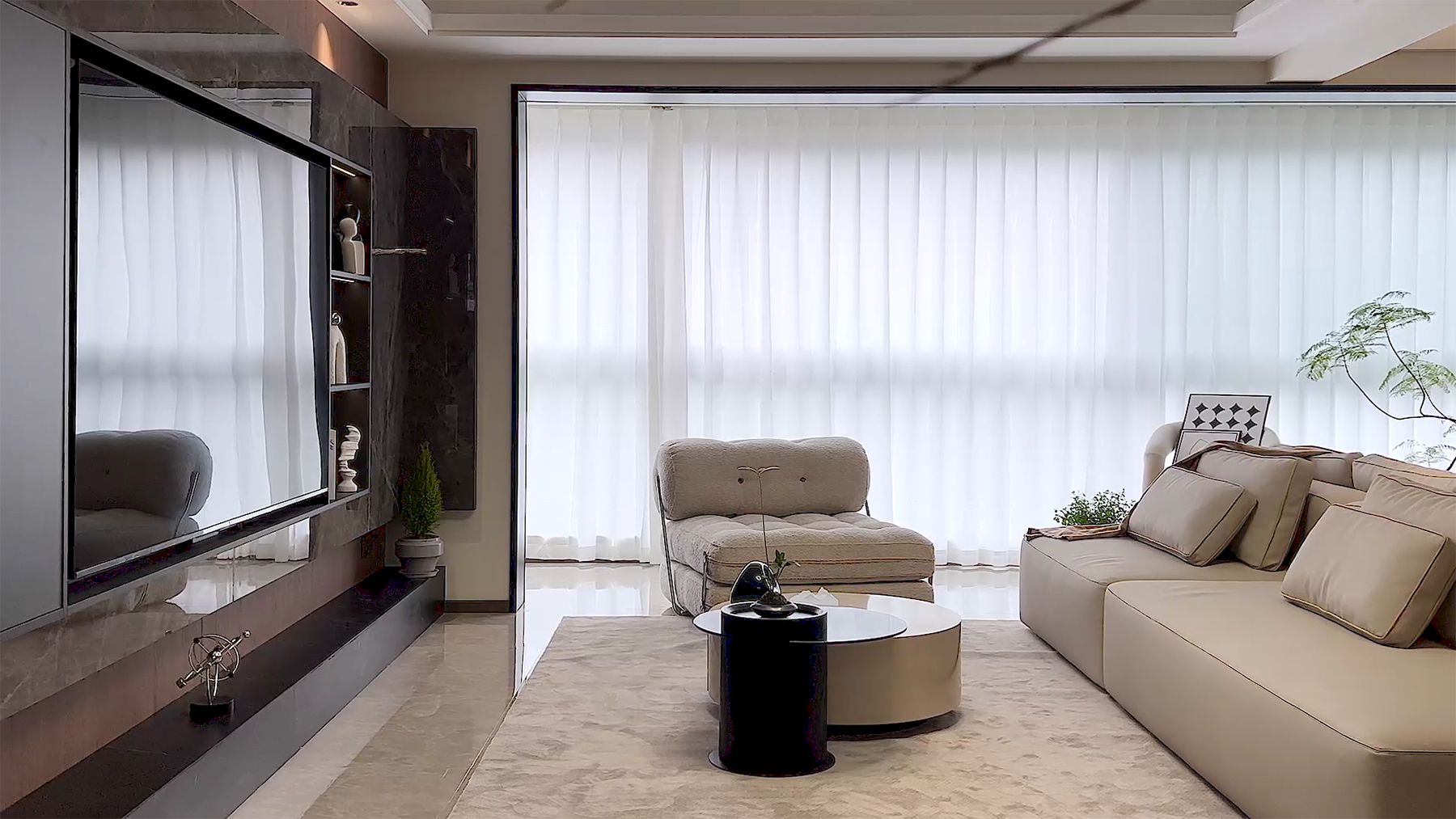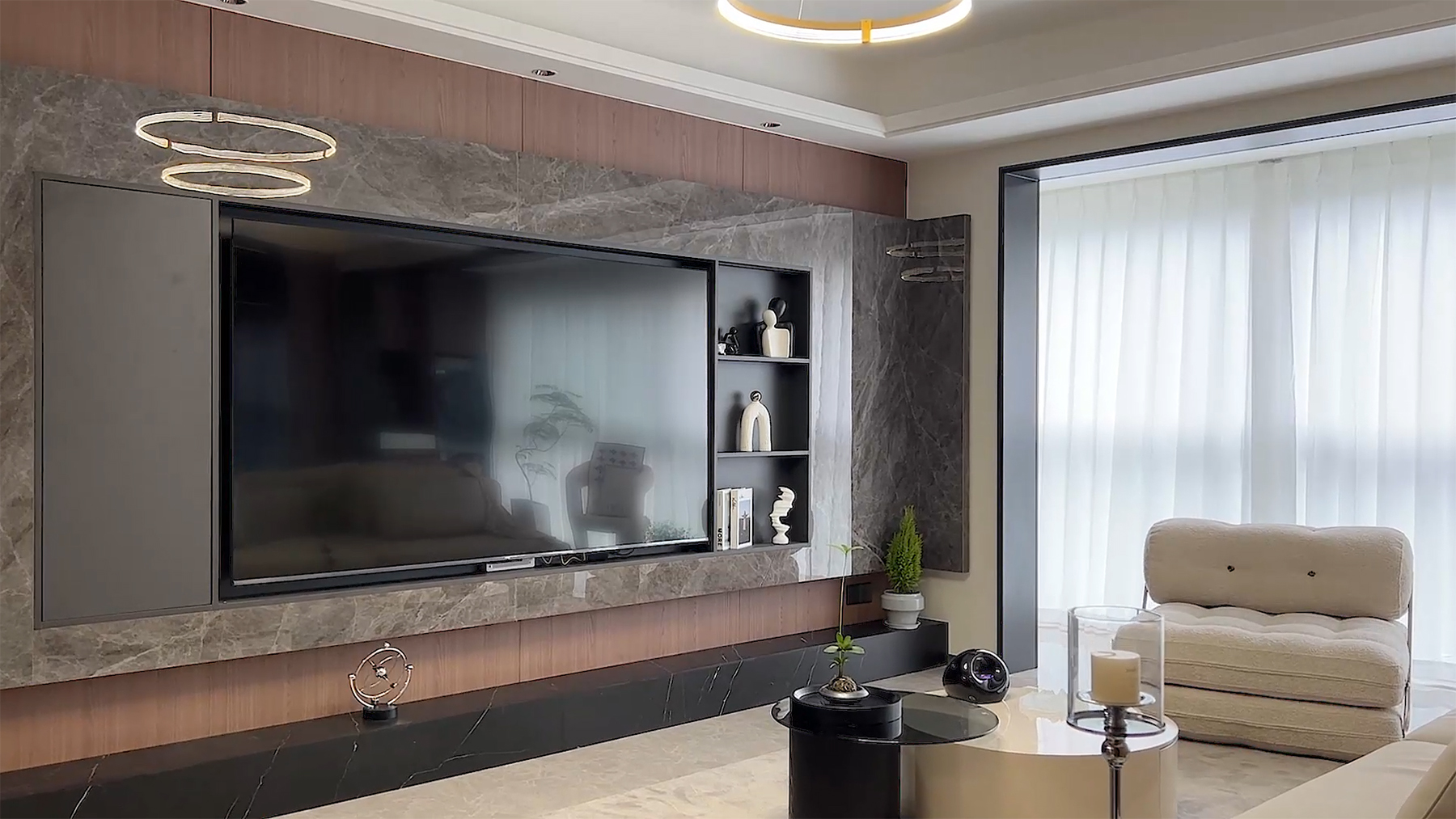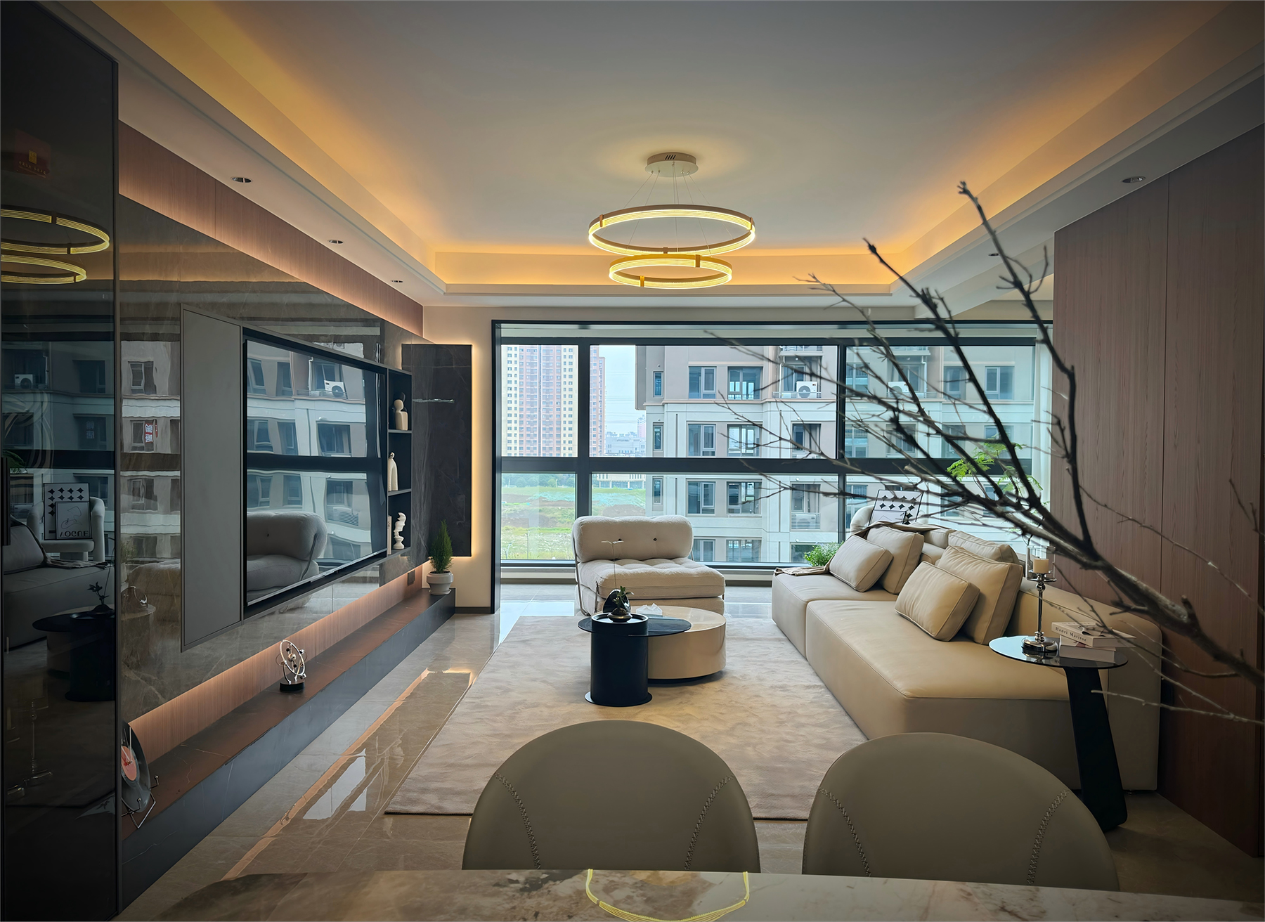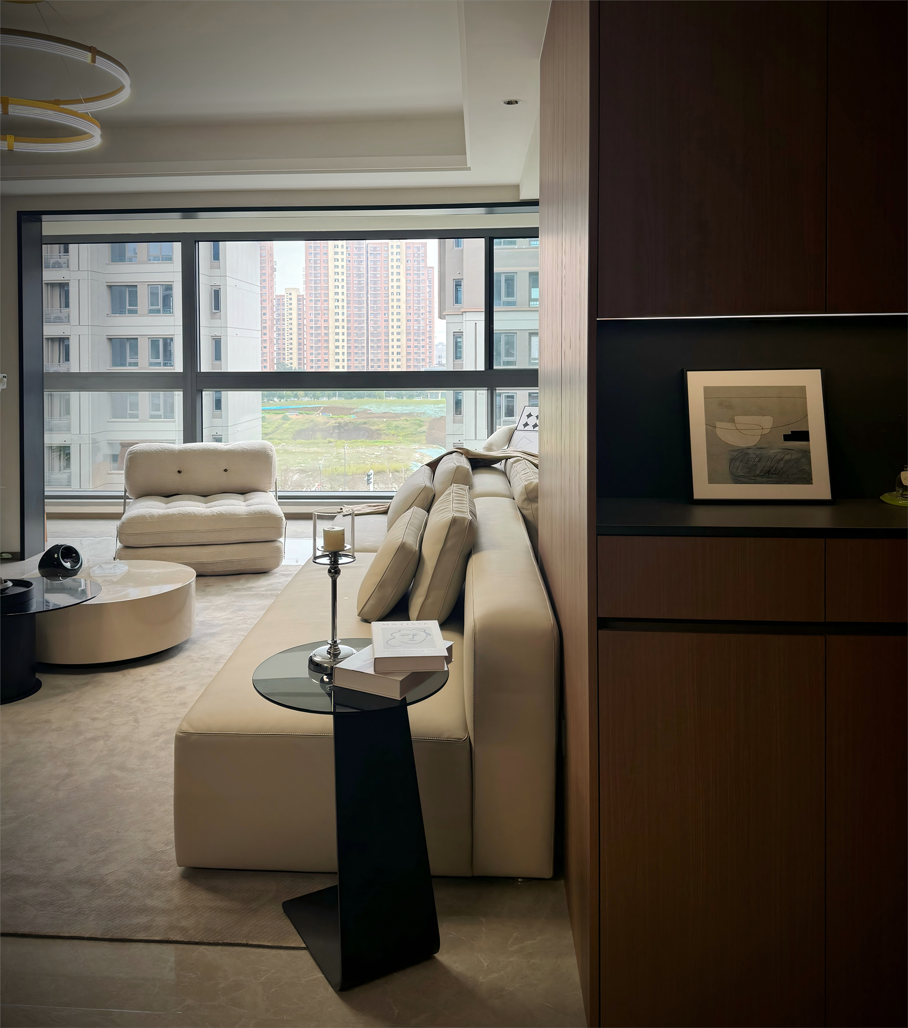 Minimalism here is not alienation but the ultimate expression of relaxed aesthetics. Clean lines and polished surfaces are softened with warmth, allowing every blank space to serve as a canvas for life stories. The home integrates elements of intimacy: a consciousness sofa with sculpted contours becomes a safe harbor for closeness, while the expansive horizontal hall houses an elegant desk that serves both as a rational workspace and a shared corner for reading, planning, and companionship.