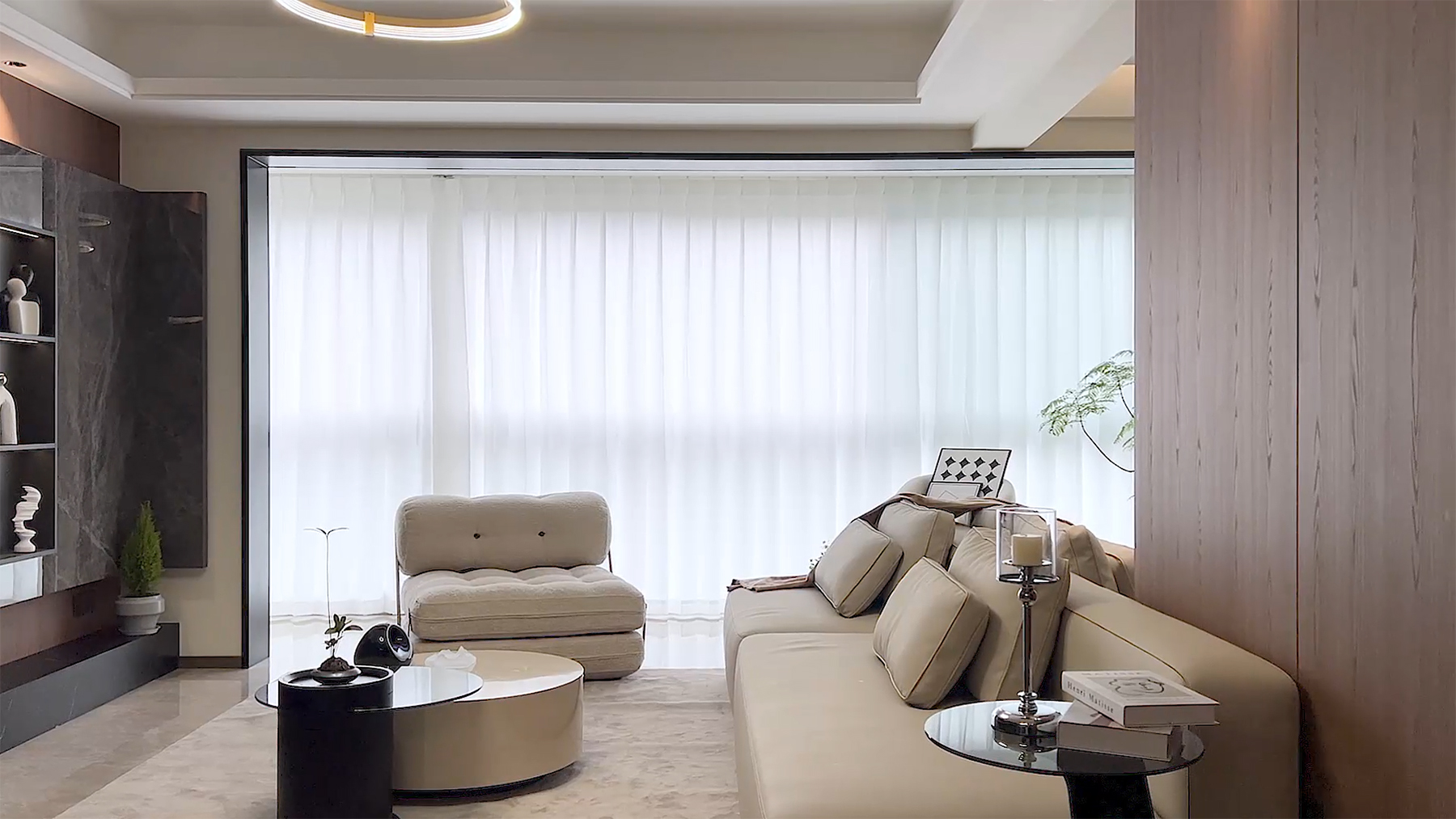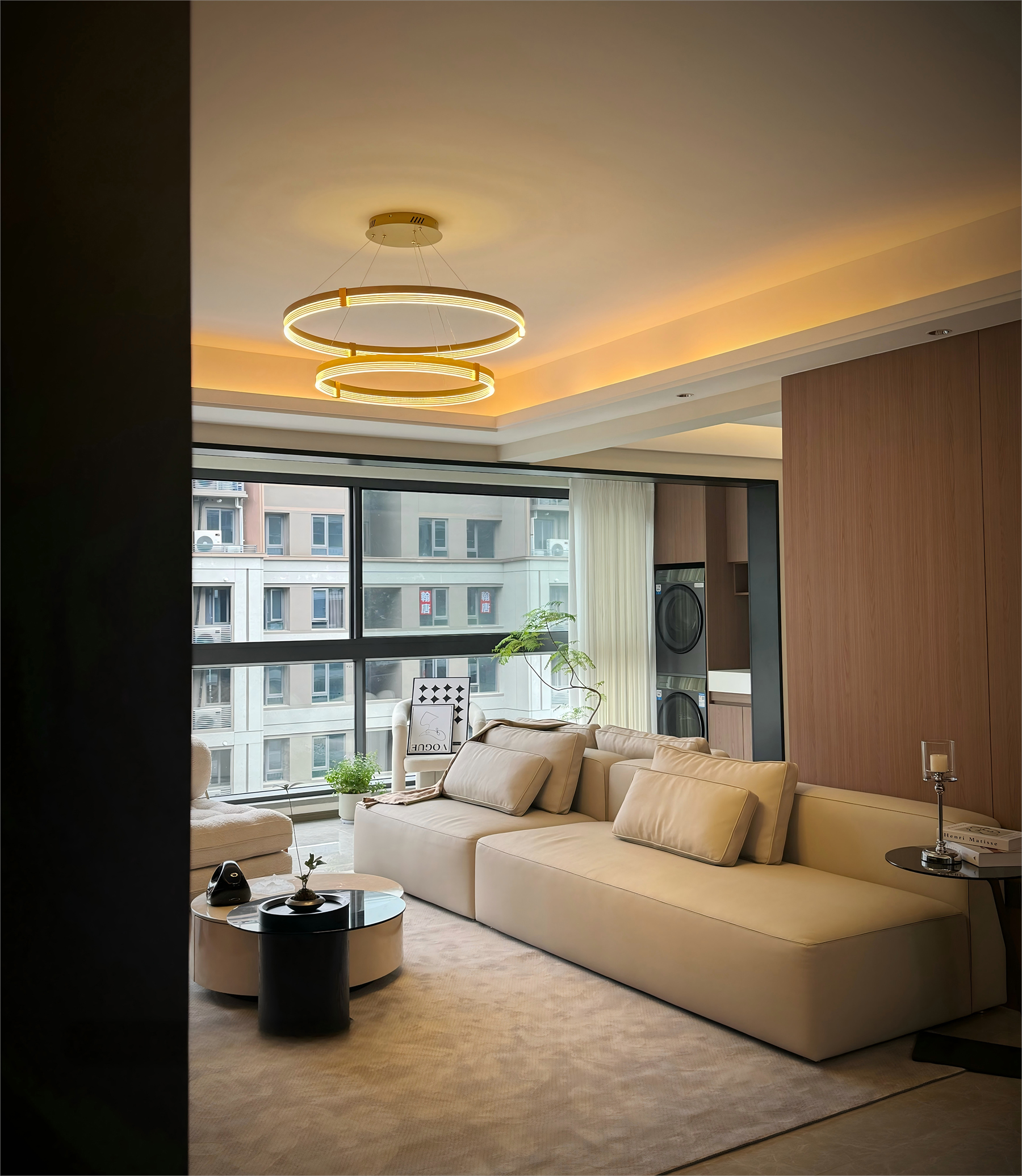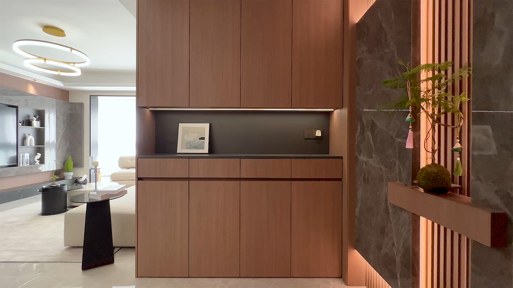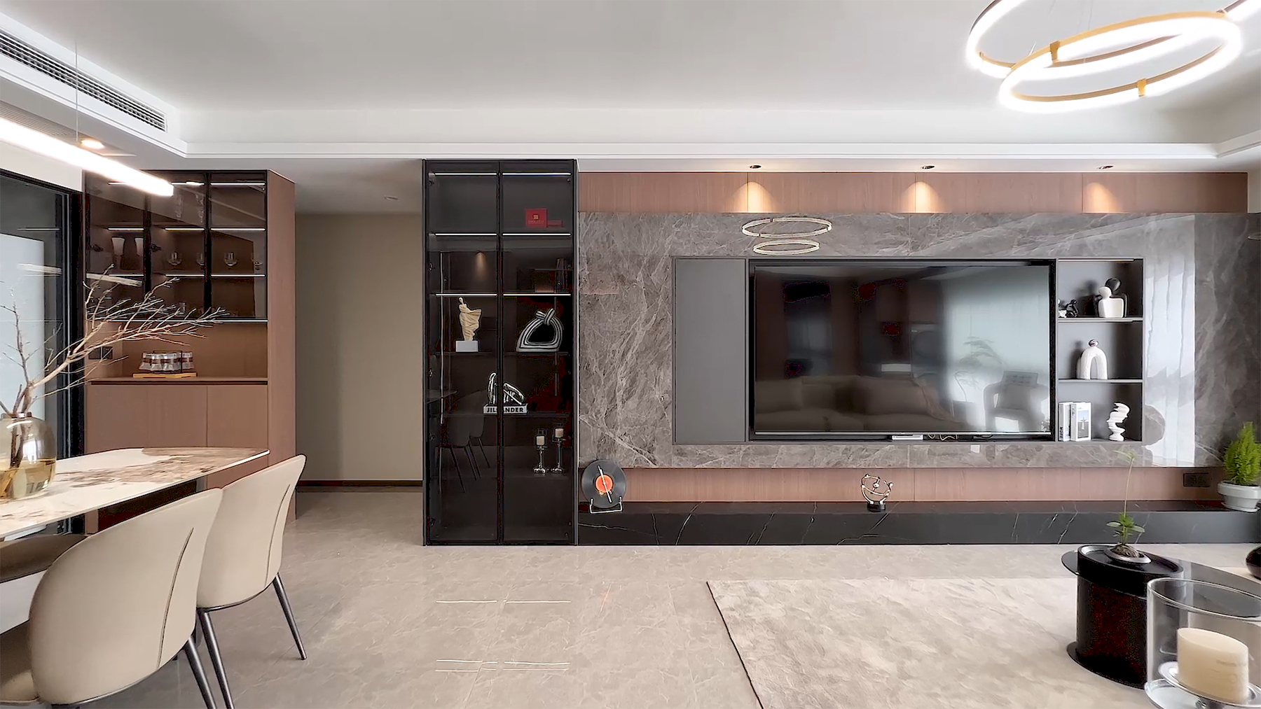 Minimalism here is not alienation but the ultimate expression of relaxed aesthetics. Clean lines and polished surfaces are softened with warmth, allowing every blank space to serve as a canvas for life stories. The home integrates elements of intimacy: a consciousness sofa with sculpted contours becomes a safe harbor for closeness, while the expansive horizontal hall houses an elegant desk that serves both as a rational workspace and a shared corner for reading, planning, and companionship.