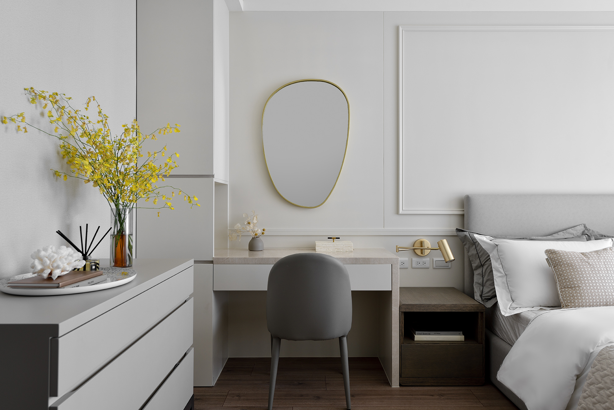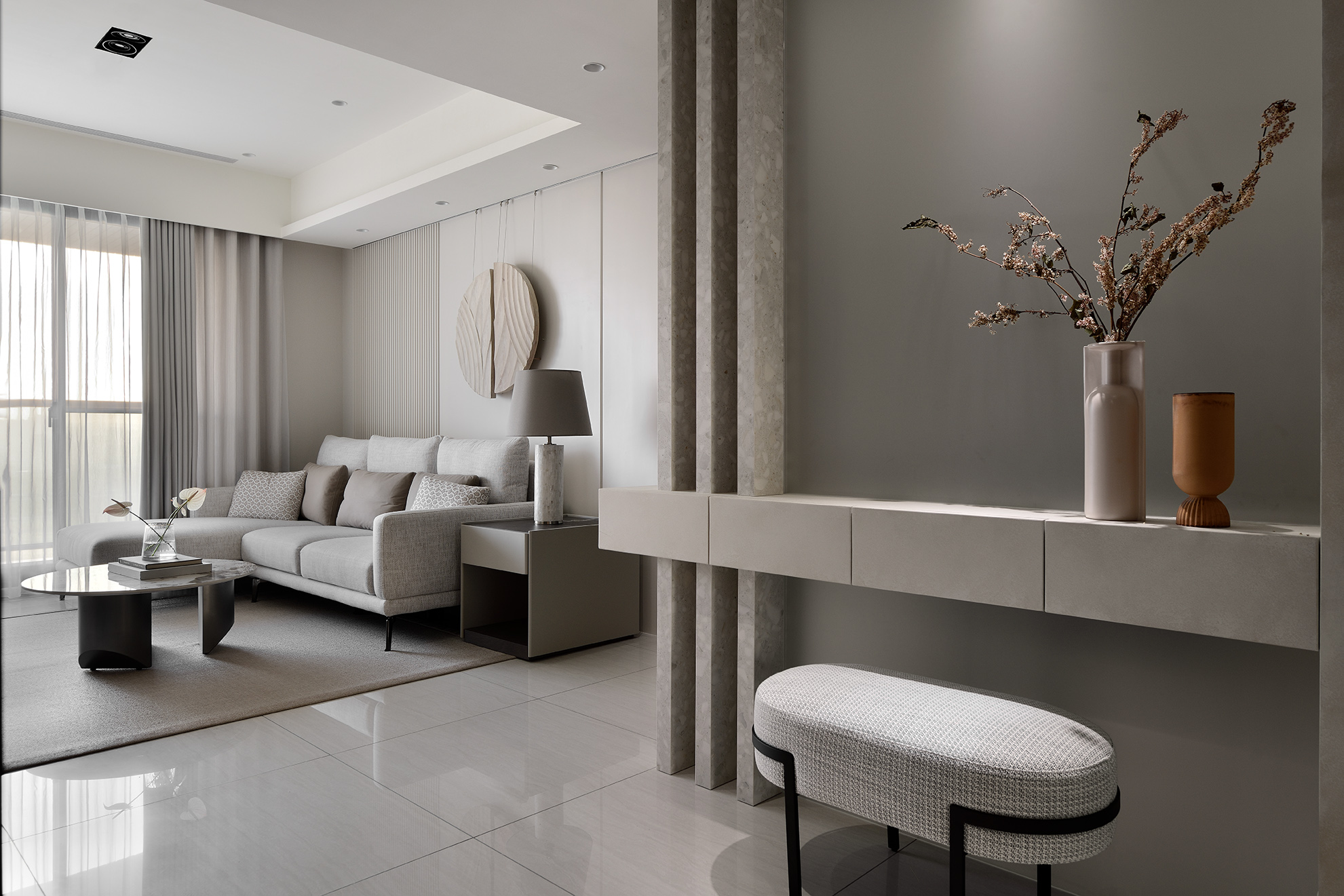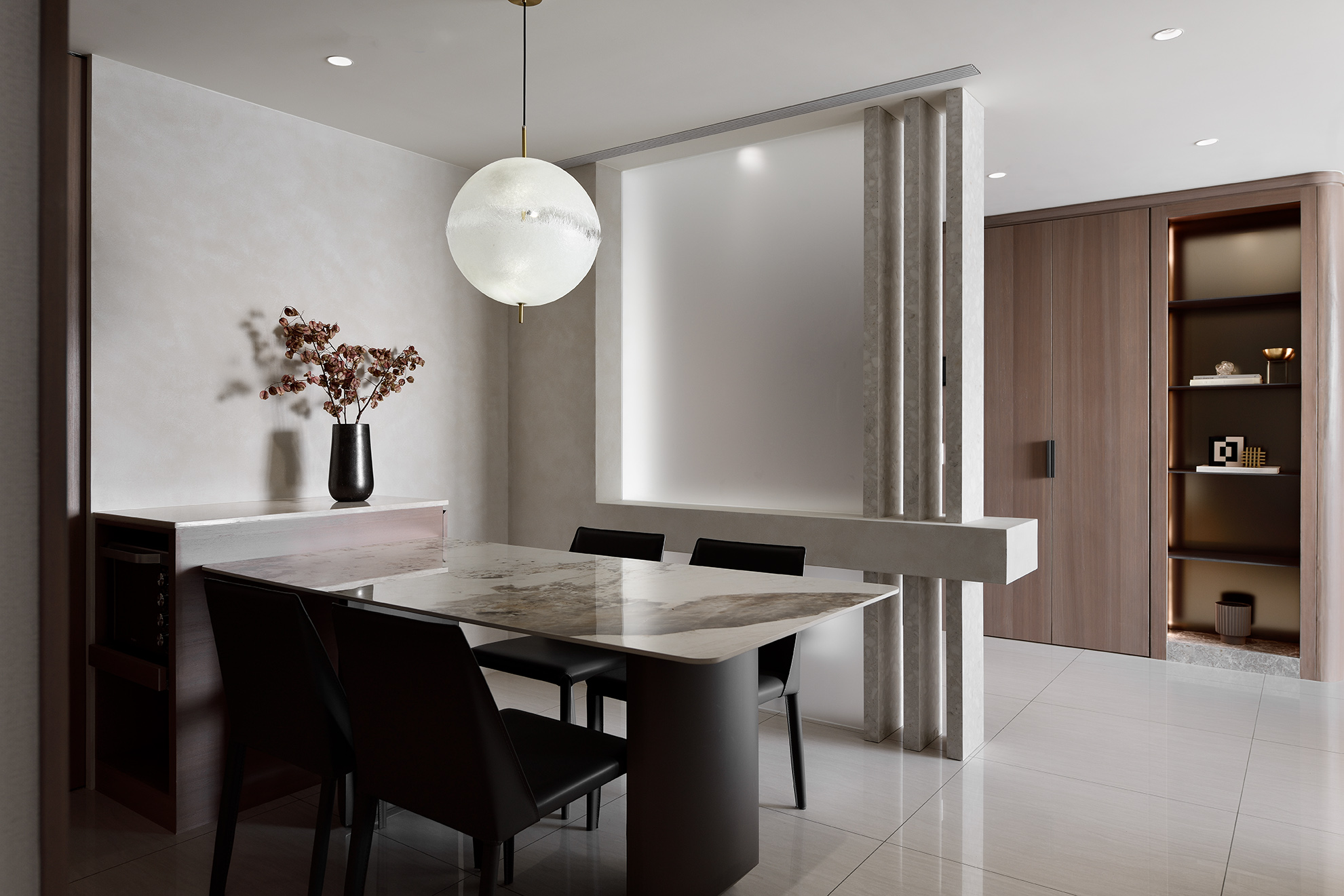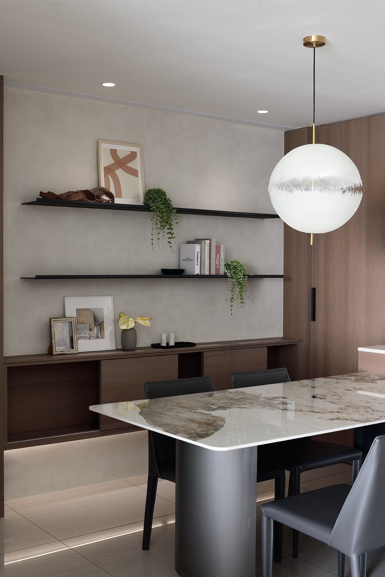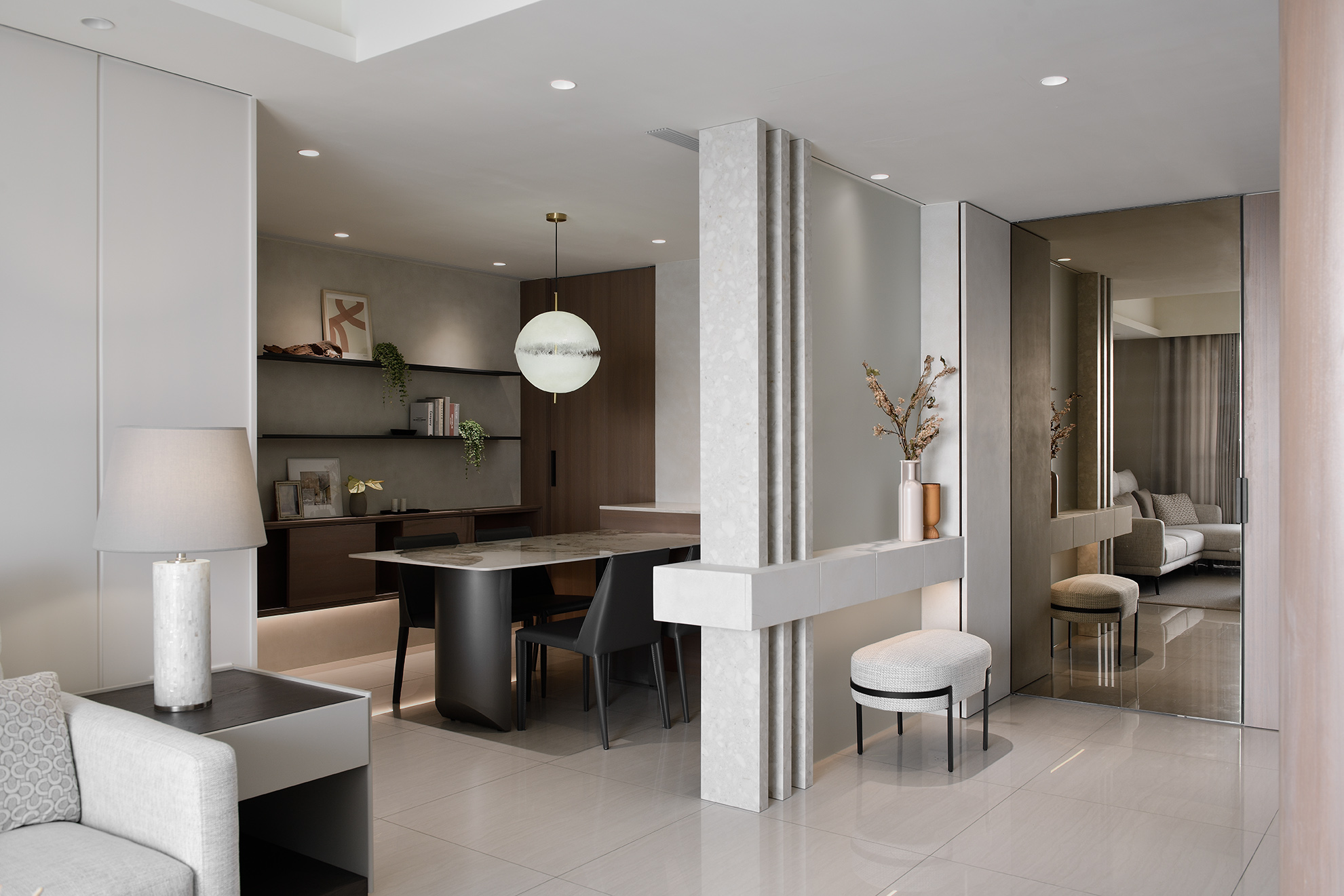 Inspired by the river outside and the poetic reflection of the moon, the residence radiates organic calm and modern sophistication. A seamless foyer integrates concealed golf and vacuum cleaner storage for easy access. On the other side, a mirrored shoes cabinet for dual purposes as a dance practice spot and departure check. The same wall featured two concealed pocket doors on both side, one for storage functionally, one as the door to access kitchen aesthetically.