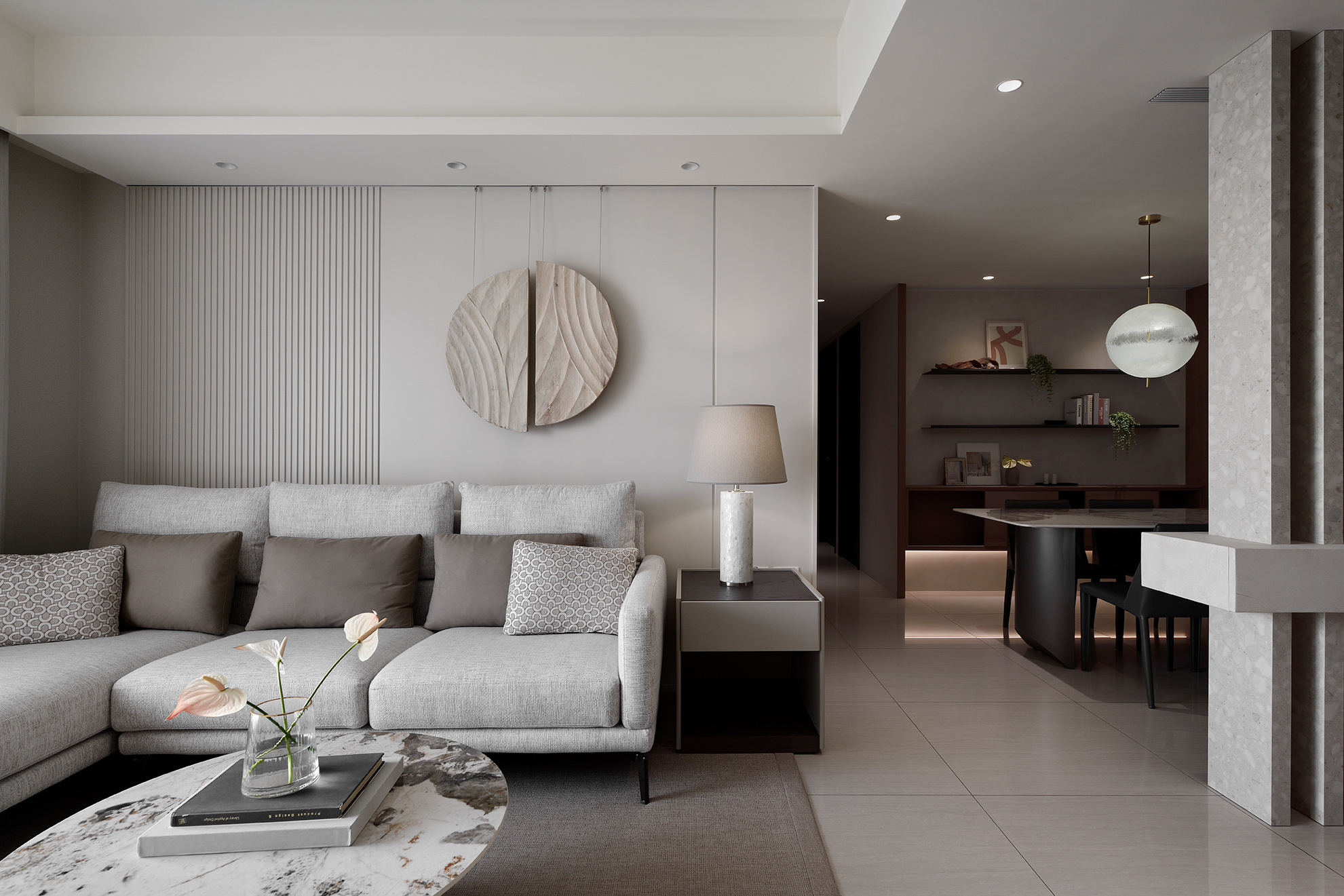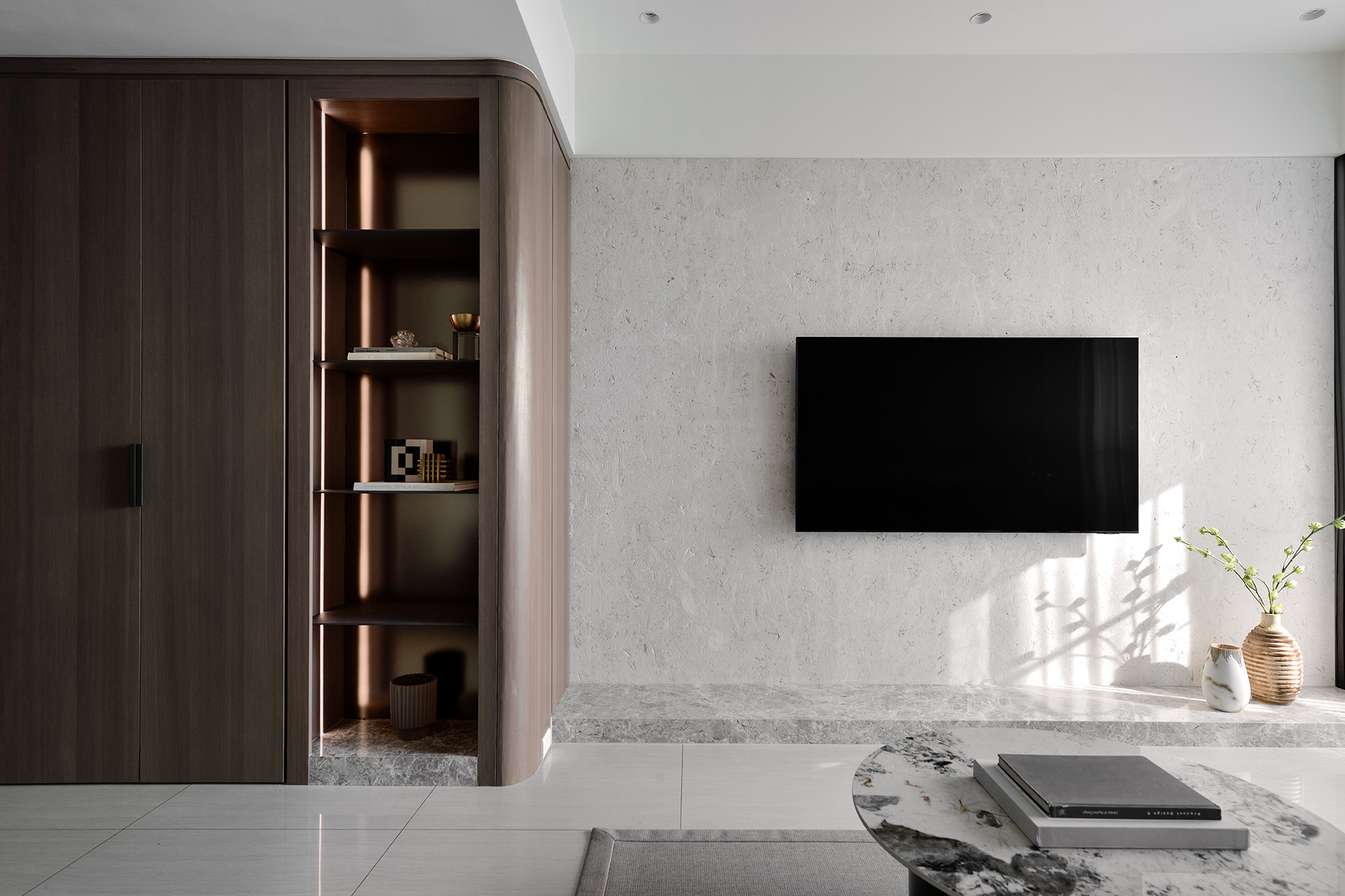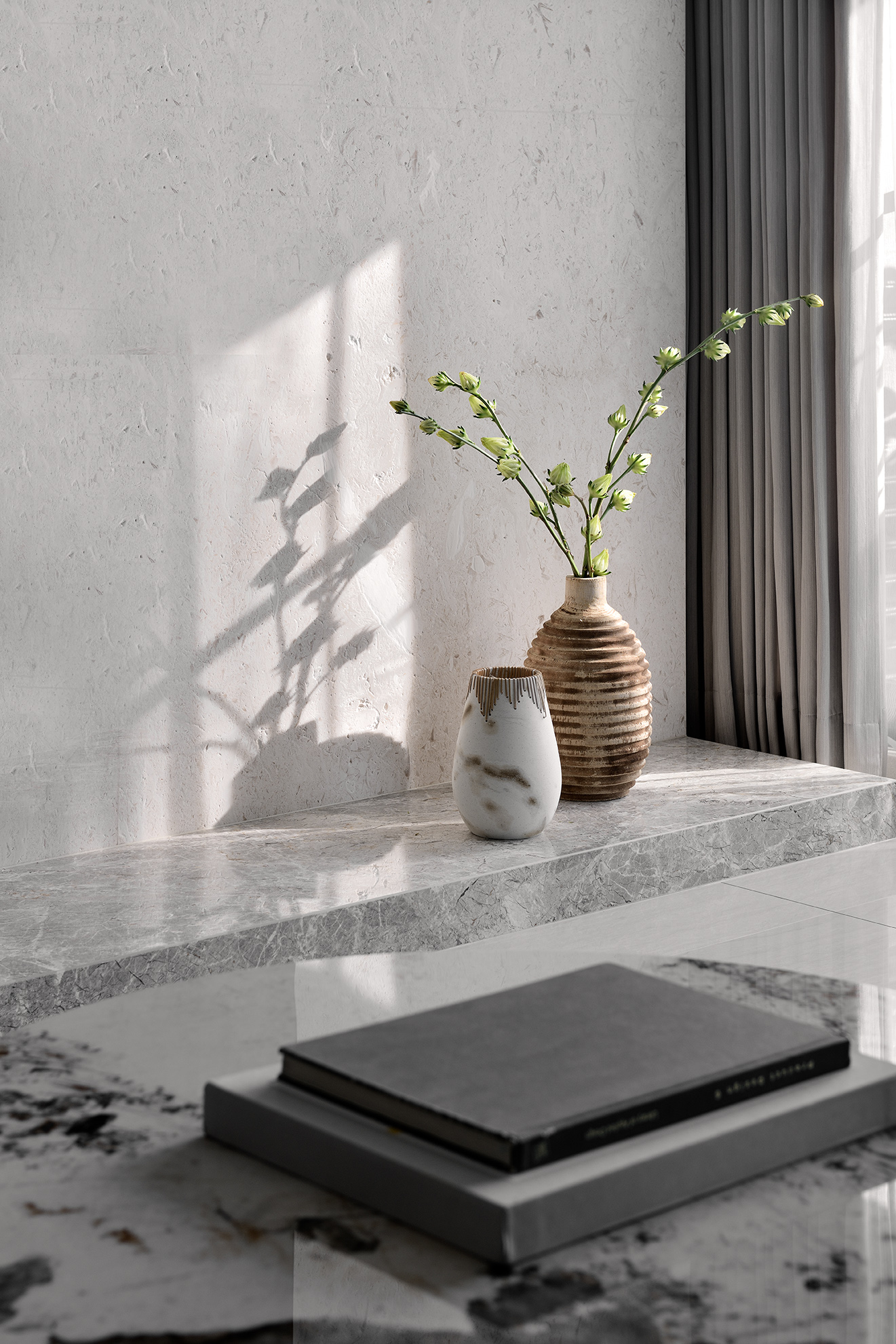 Limestone surfaces in the living space, embedded with shells and sand-like traces, connect with flowing hand-carved wooden art above the sofa and pearl shell table lamp , echoing river currents and lunar rhythms. These elements evoke flowing lines and organic patterns reminiscent of moonlight and river movement, gently enveloping the space in calm and purity.