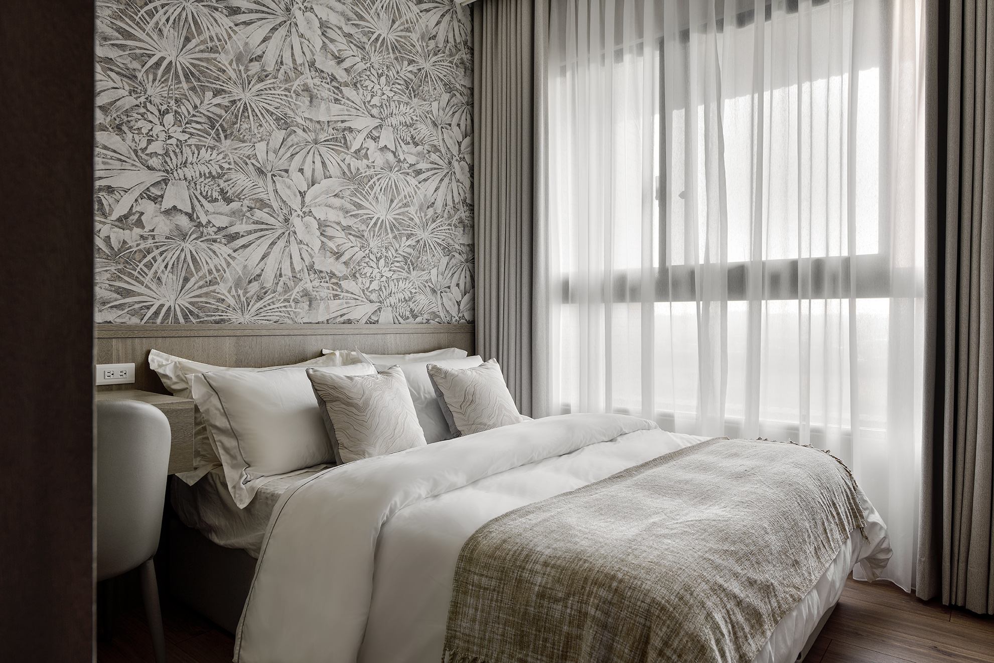 The concept extends into the bedroom, where lively wallpaper featuring leaves, animals and wood textures evoke the pulse of nature.