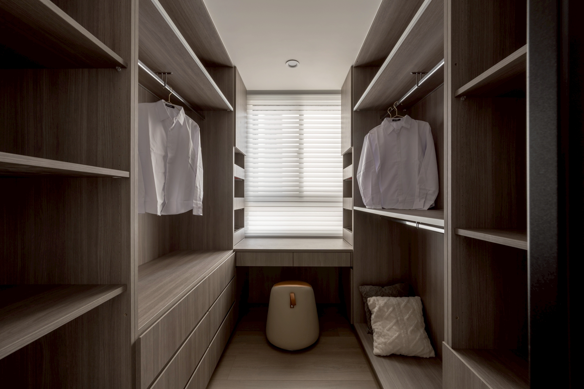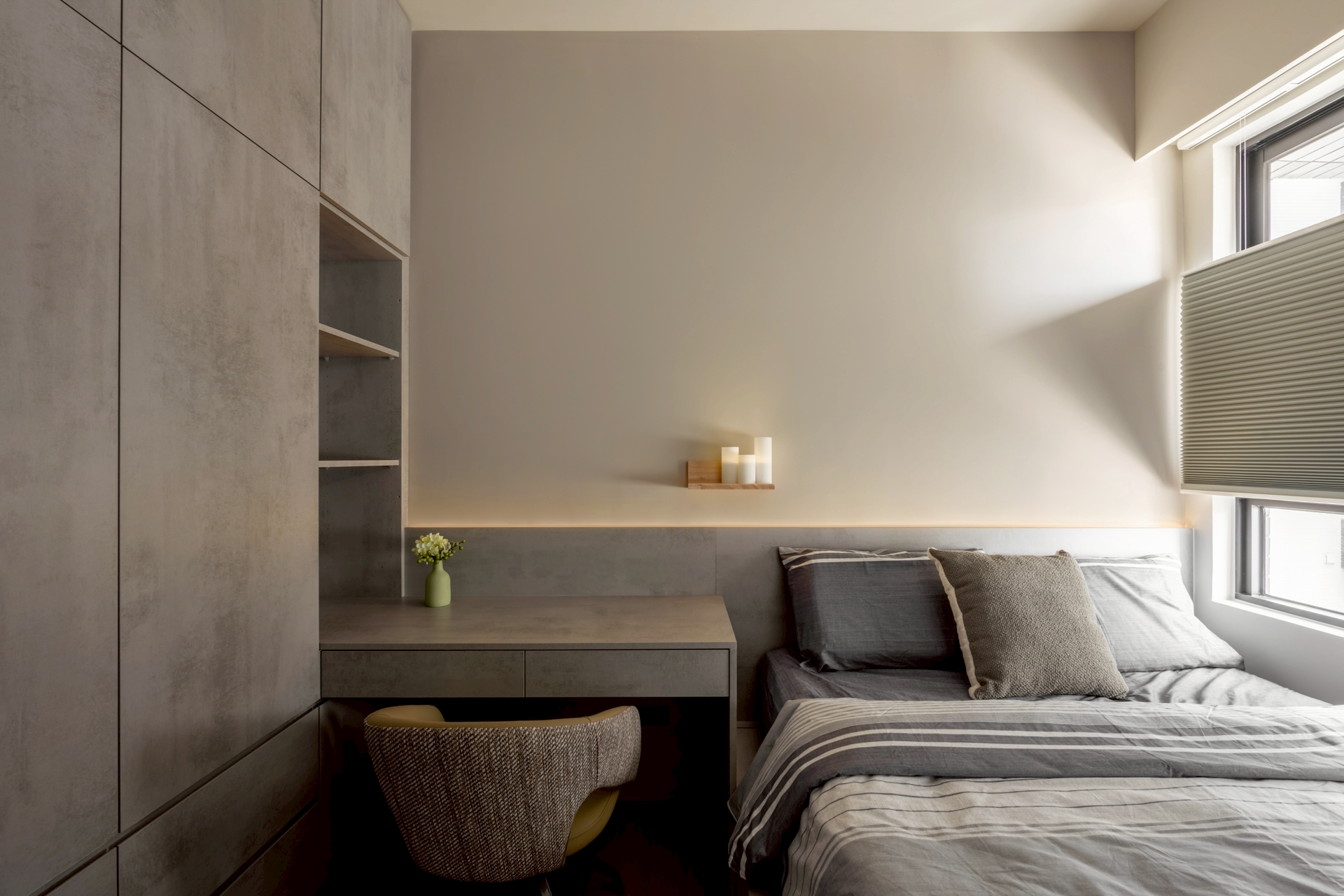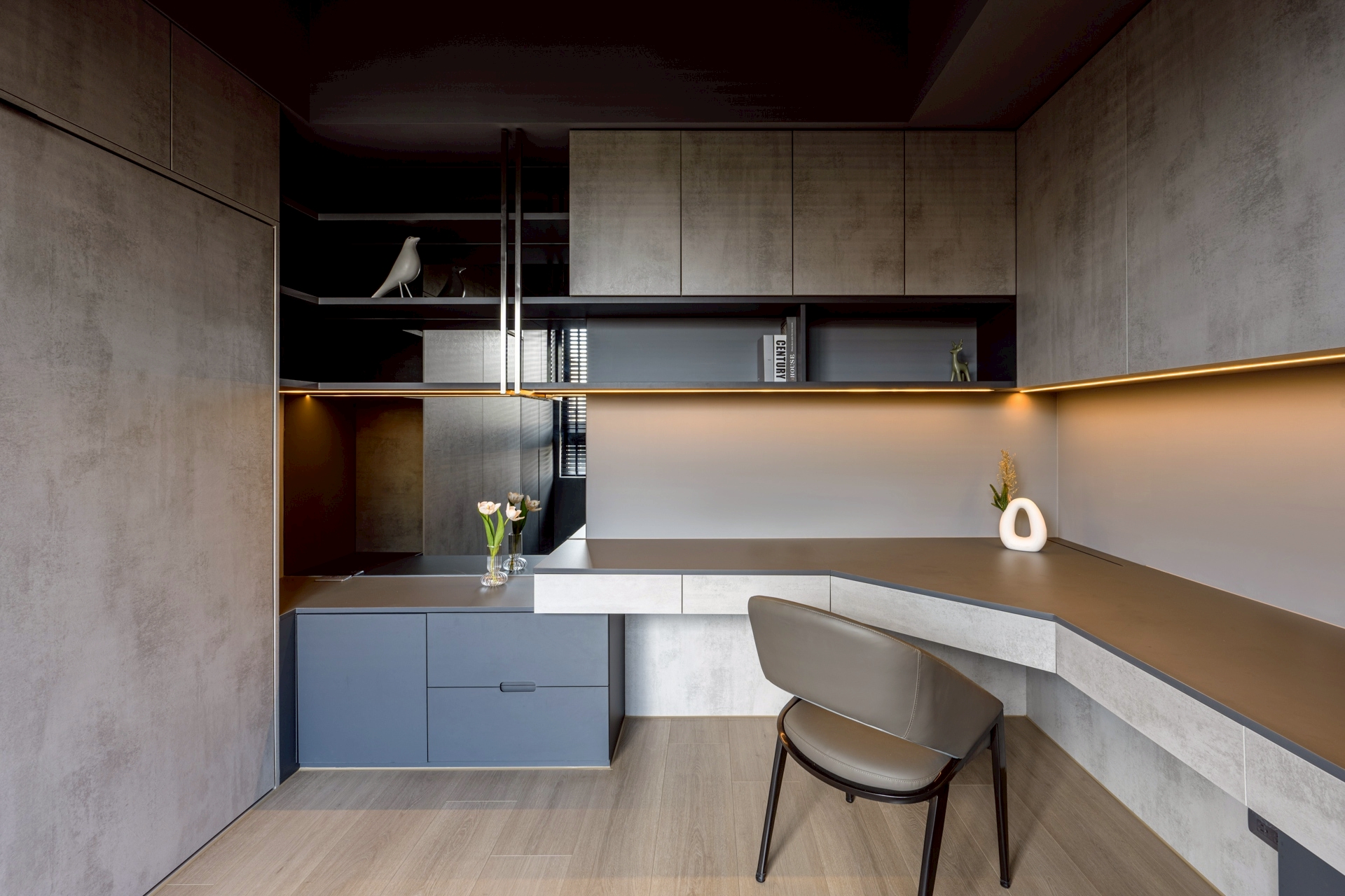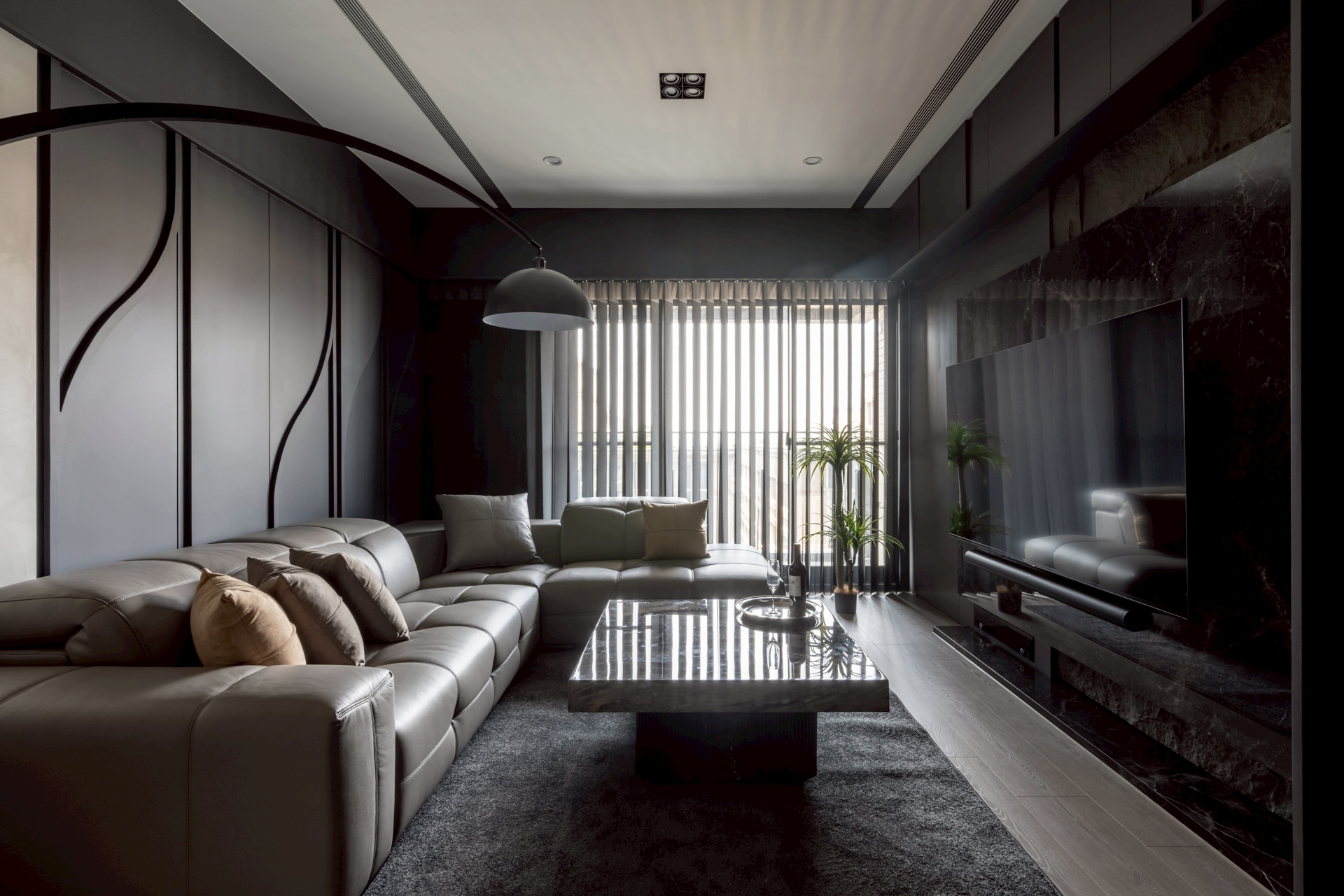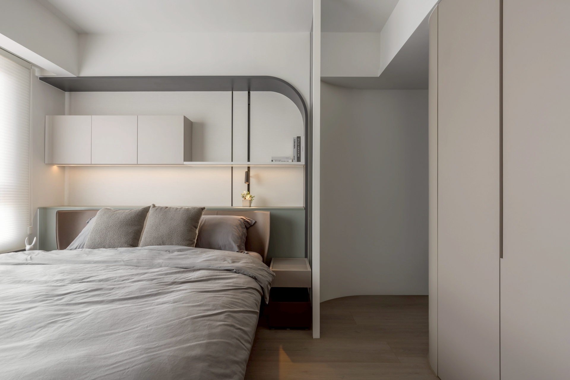 Leading into the living room, a striking black grille door elegantly connects to the bathroom, seamlessly harmonizing with the marble TV wall and the chic display cabinet. Nestled within this artistic entryway is an apple-shaped metal handle that intriguingly reinterprets the classic symbolism of the fairy tale's apple: rather than representing poison, it serves as a key to redemption, inviting one to return to a serene state of mind. The tree branch relief on the back wall of the sofa further enhances the atmosphere, evoking the tranquil embrace of a forest. Transitioning to the bedroom, you are greeted by thoughtfully designed lift-up cabinets situated above the bed, alongside transparent storage units that facilitate comprehensive organization while maintaining an airy feel.