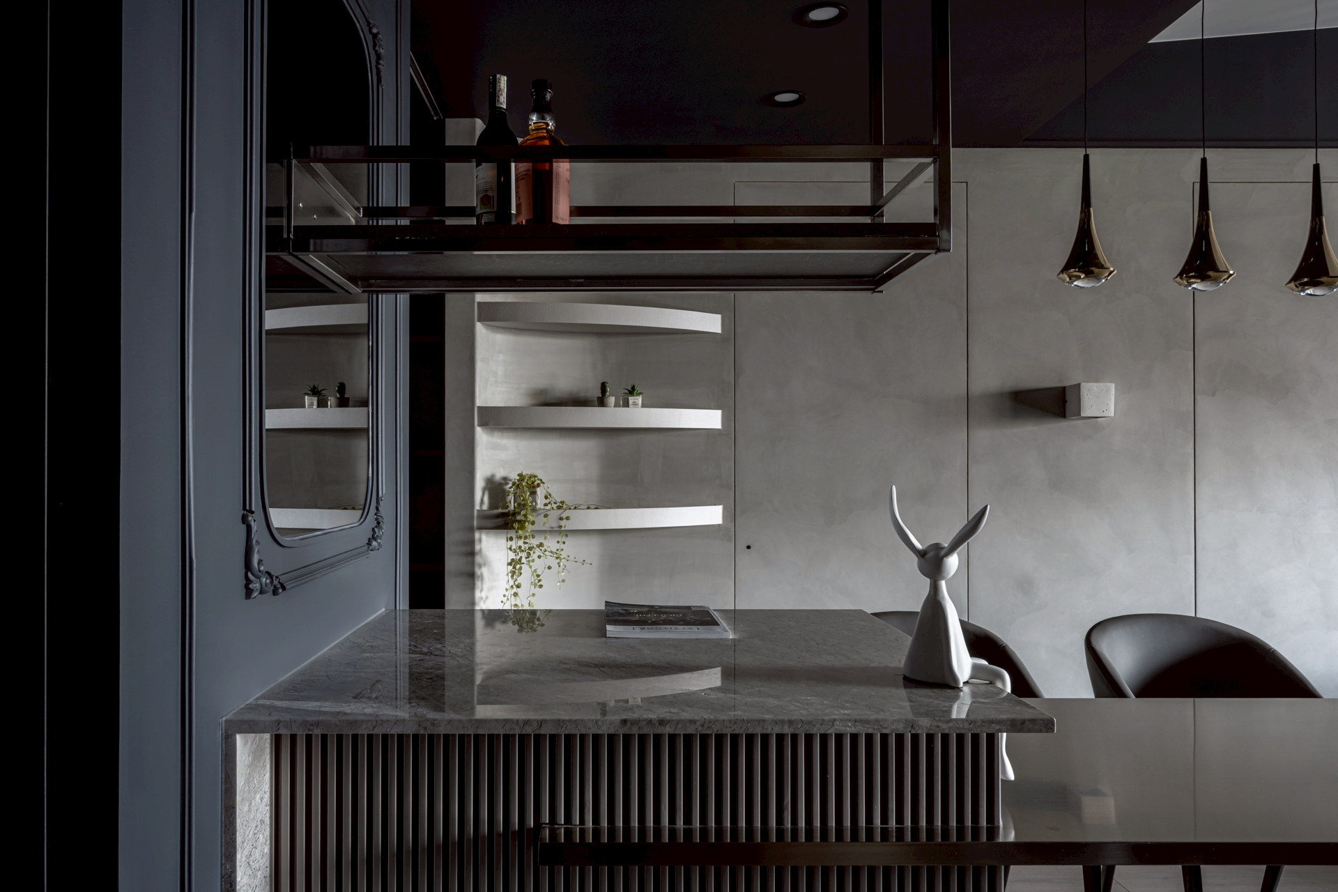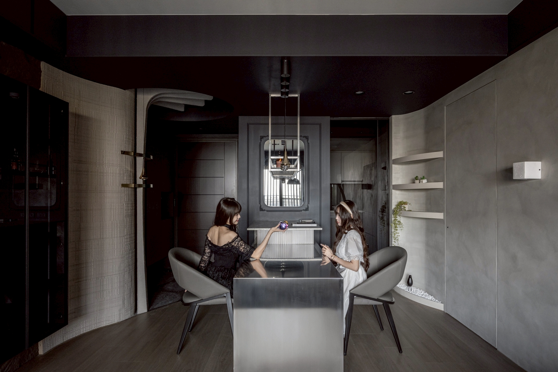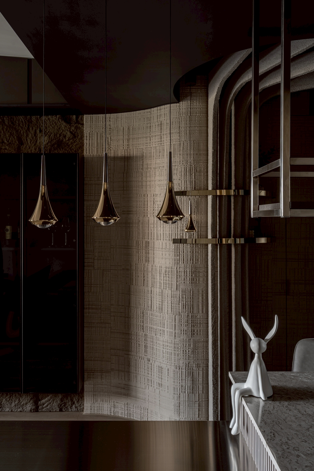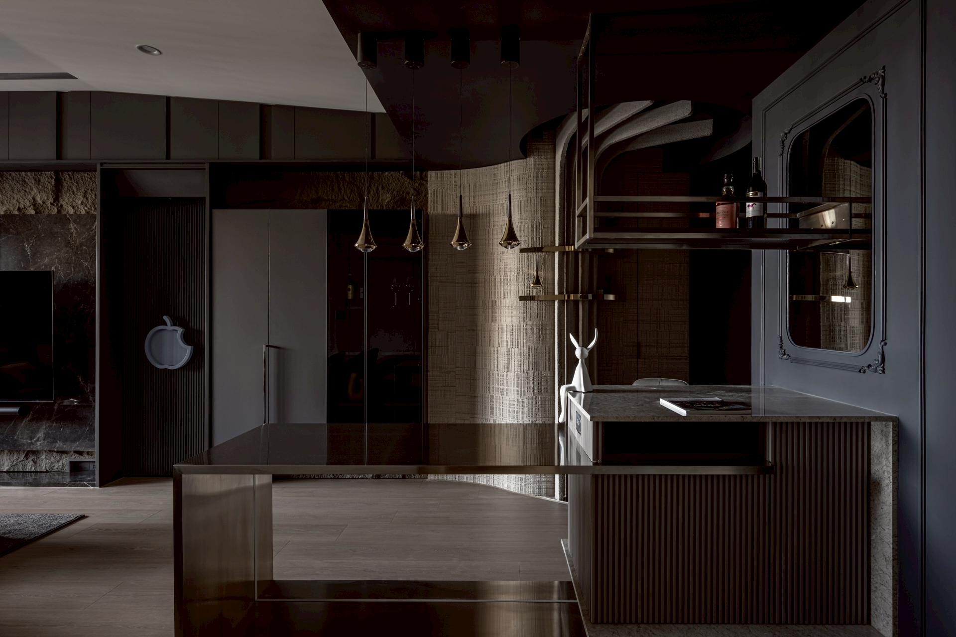 Upon entry, the black radial patterns on the door evoke the threshold between reality and illusion, immediately setting a tone of transformation. Underfoot, dark stone slabs symbolize the queen’s resolute steps into the outside world, while a curved wall textured like tree bark envelops the space in an enchanting, forest-like ambiance. Seamlessly integrated into this narrative, a concealed wardrobe and a sleek stainless-steel island—serving as both dining table and bar—define the heart of the dining and kitchen area.