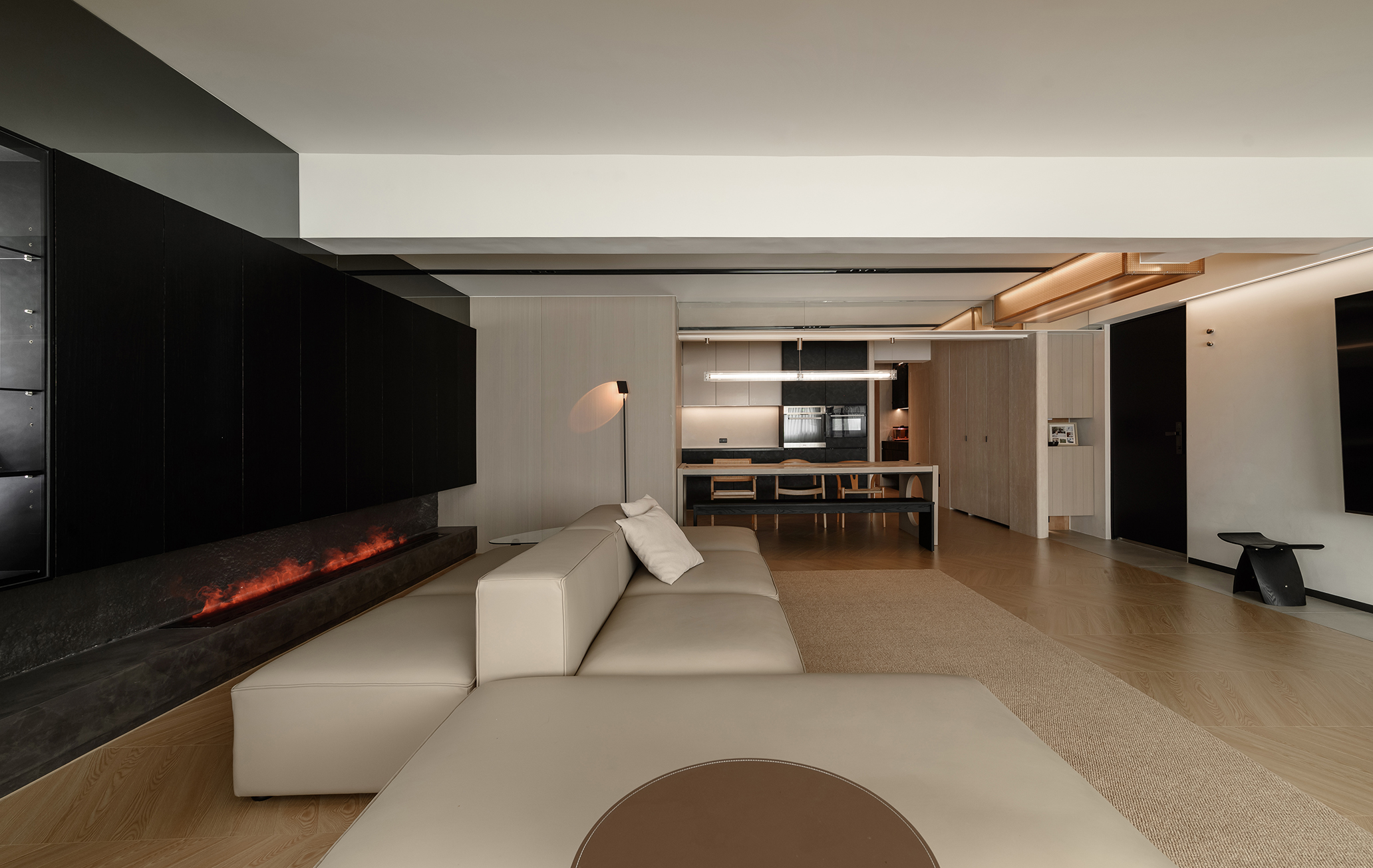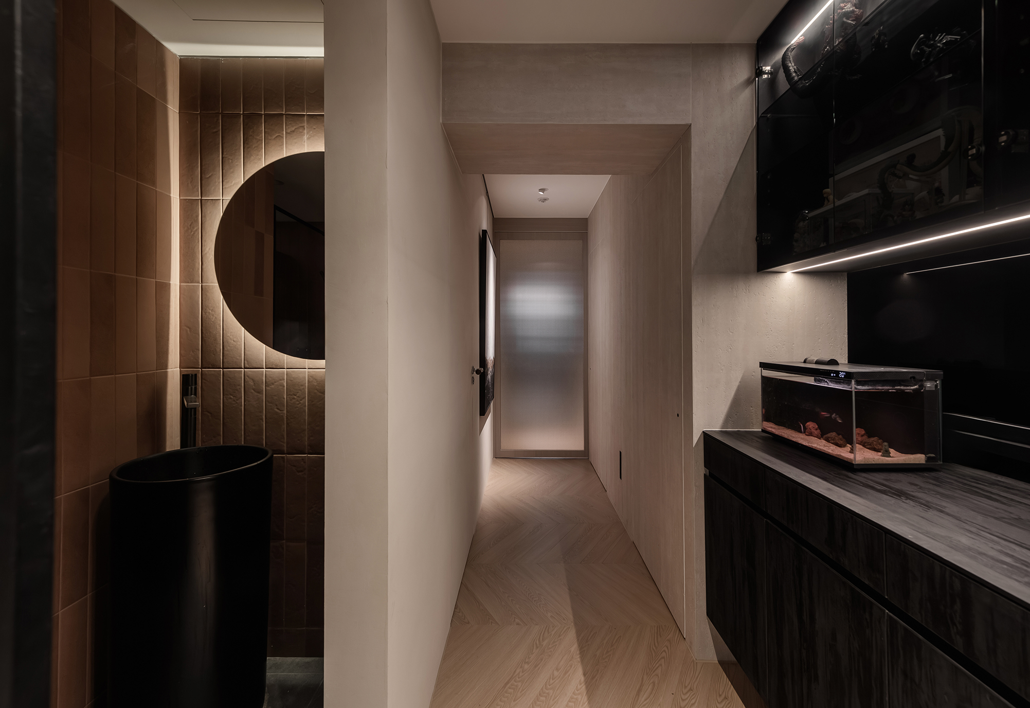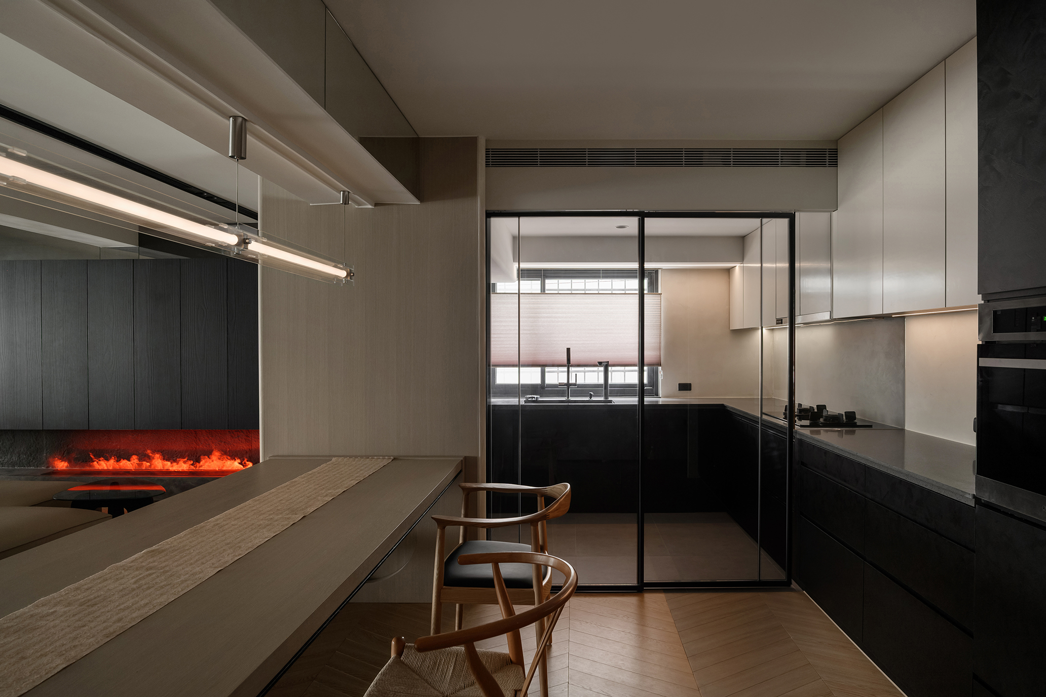 Given the limited ceiling height typical of older structures, mirrored finishes were applied to the living room cabinetry and beams to extend visual depth and alleviate the sense of compression. A dark color palette was employed to create visual balance and accentuate spatial layering, refining the long, narrow proportions of the living and dining areas. The former guest room was removed and converted into an open kitchen, subtly defined by cabinetry and glass sliding doors that merge the kitchen and dining zones into one fluid continuum. A linear pendant light beneath the beam both delineates function and visually lightens its presence. Beyond functional improvement, the design introduces light as a gentle thread that ties the family’s daily life together, transforming the interior into a tranquil, cohesive home filled with warmth, stability, and quiet reassurance.