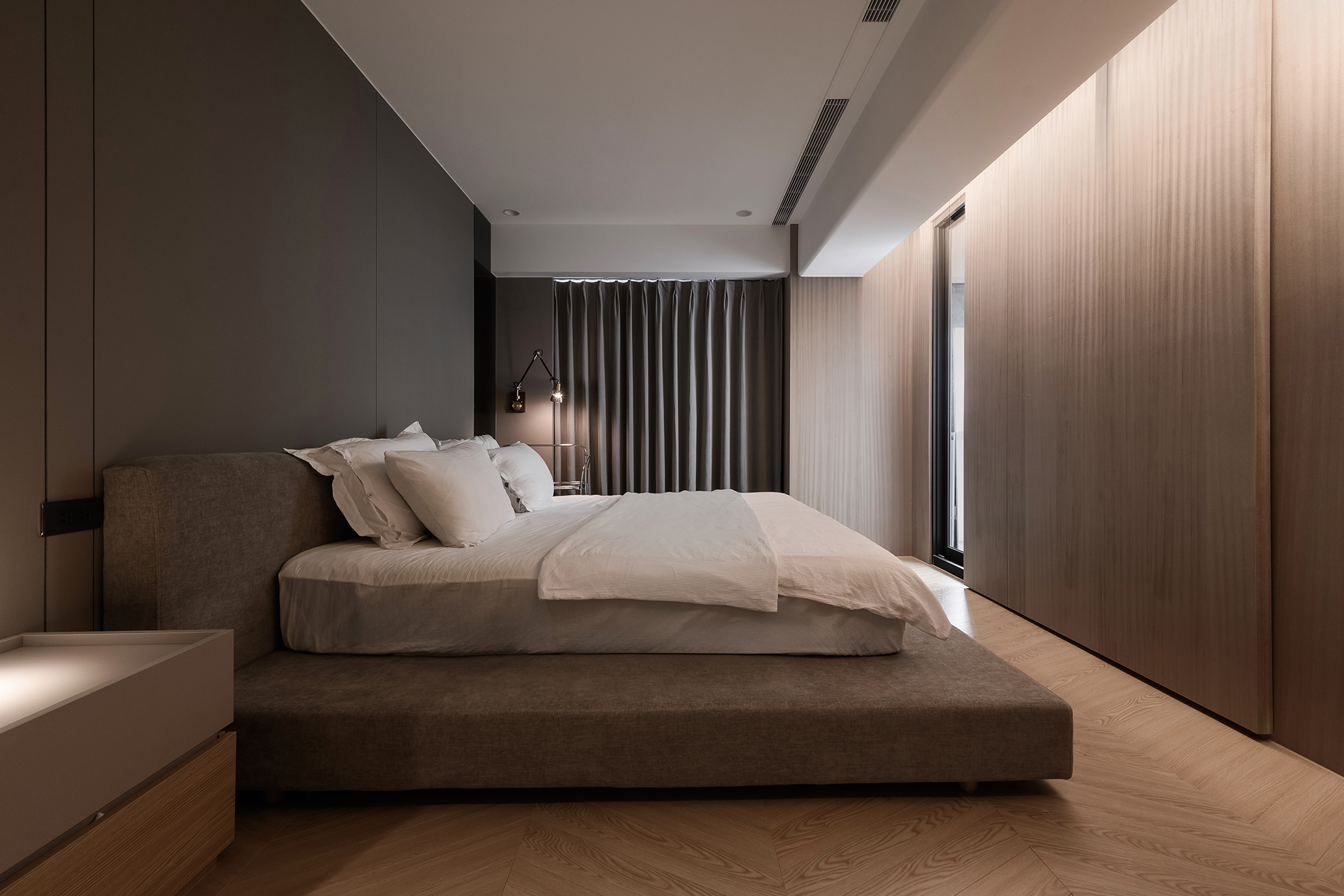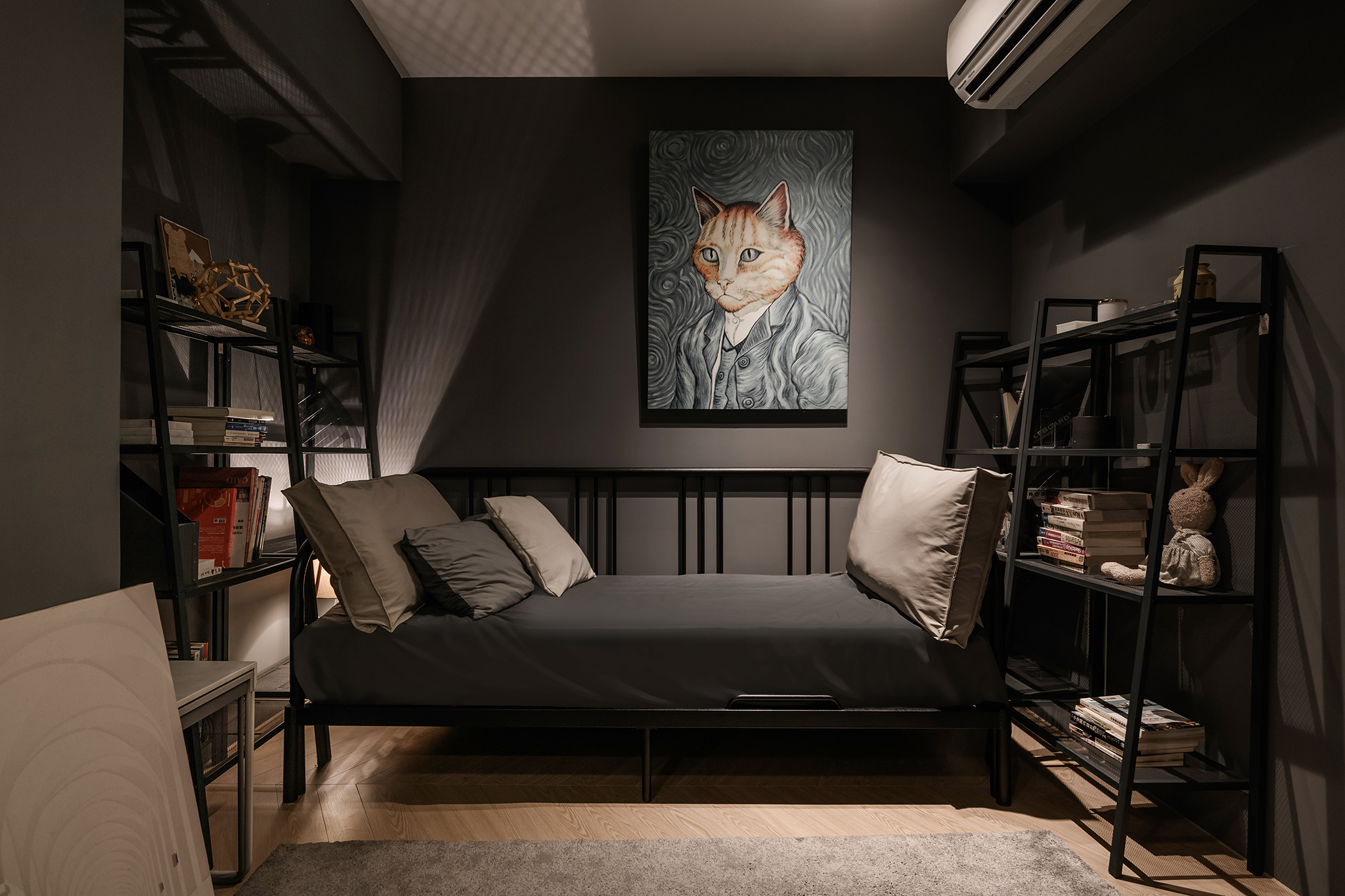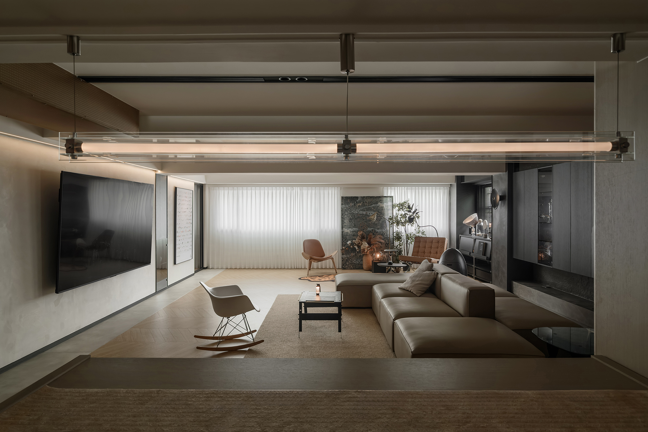 Given the limited ceiling height typical of older structures, mirrored finishes were applied to the living room cabinetry and beams to extend visual depth and alleviate the sense of compression. A dark color palette was employed to create visual balance and accentuate spatial layering, refining the long, narrow proportions of the living and dining areas. The former guest room was removed and converted into an open kitchen, subtly defined by cabinetry and glass sliding doors that merge the kitchen and dining zones into one fluid continuum. A linear pendant light beneath the beam both delineates function and visually lightens its presence. Beyond functional improvement, the design introduces light as a gentle thread that ties the family’s daily life together, transforming the interior into a tranquil, cohesive home filled with warmth, stability, and quiet reassurance.