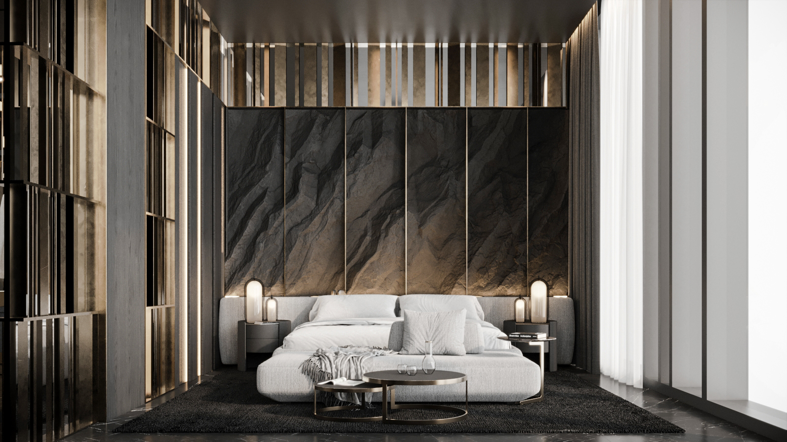 The private zone includes a master block with a bedroom, a dressing room, a bathroom, a SPA area, a gym and several guest bedrooms.