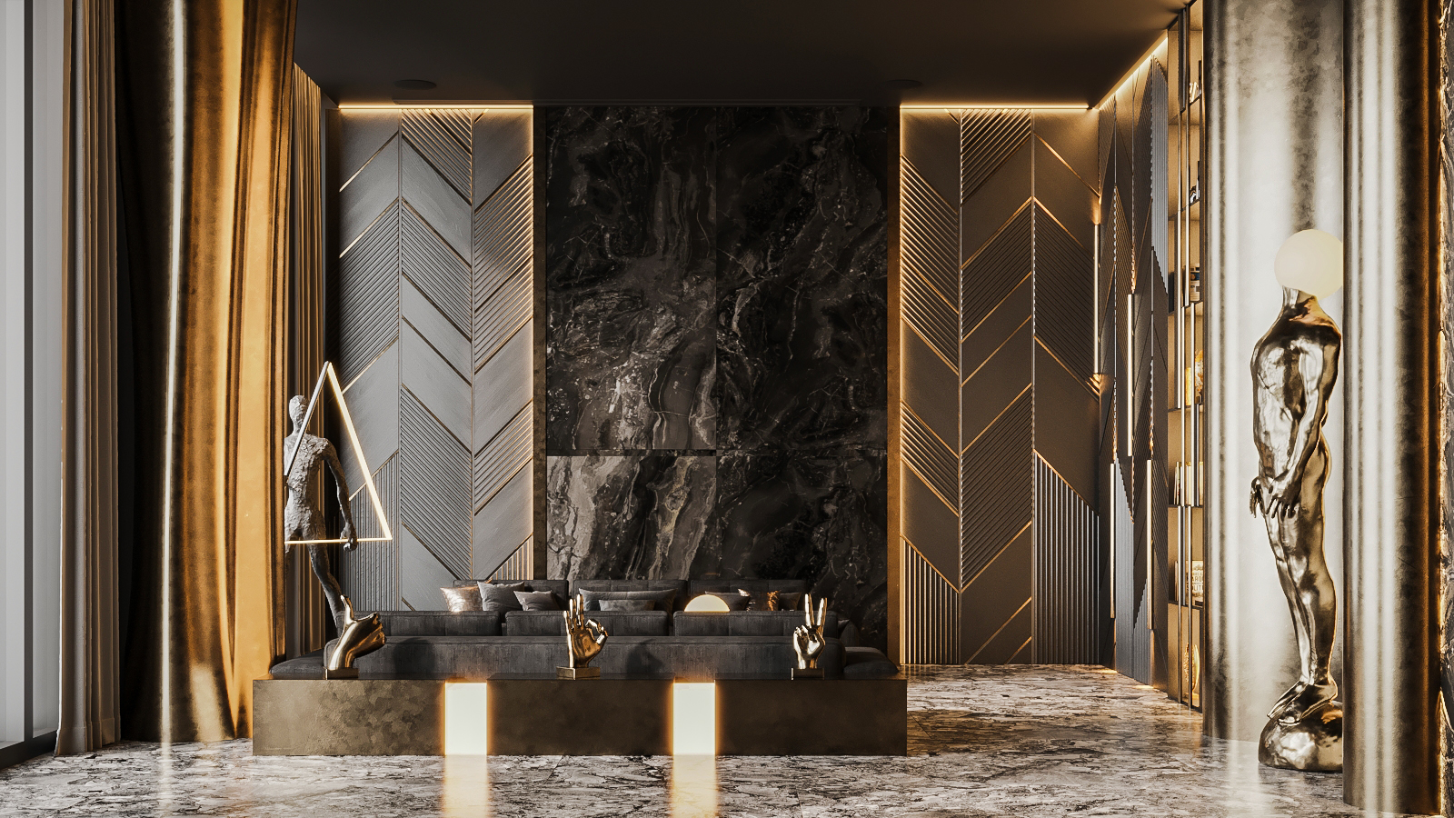 The public zone consists of a living room, a kitchen-dining room, a recreation area and a club-cinema. This zone has several interesting interior ideas such as a Japanese red maple tree and a 5,000 lt aquarium in the recreation area or designer furniture made of bent metal in the club and dining area.