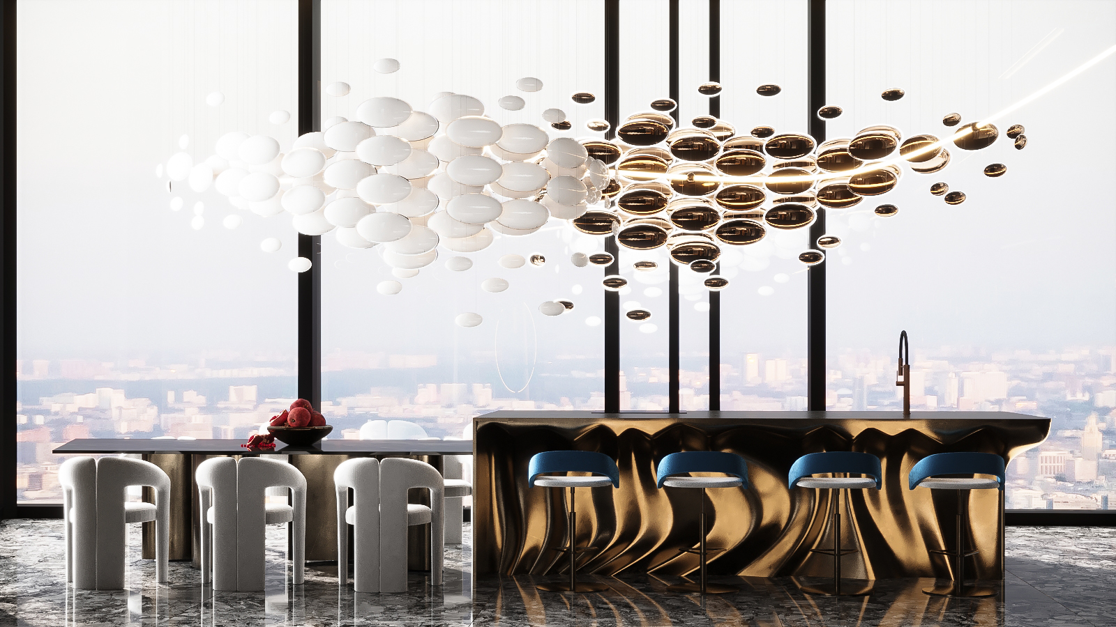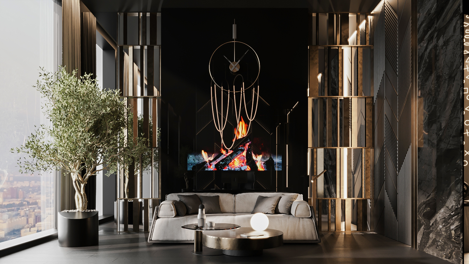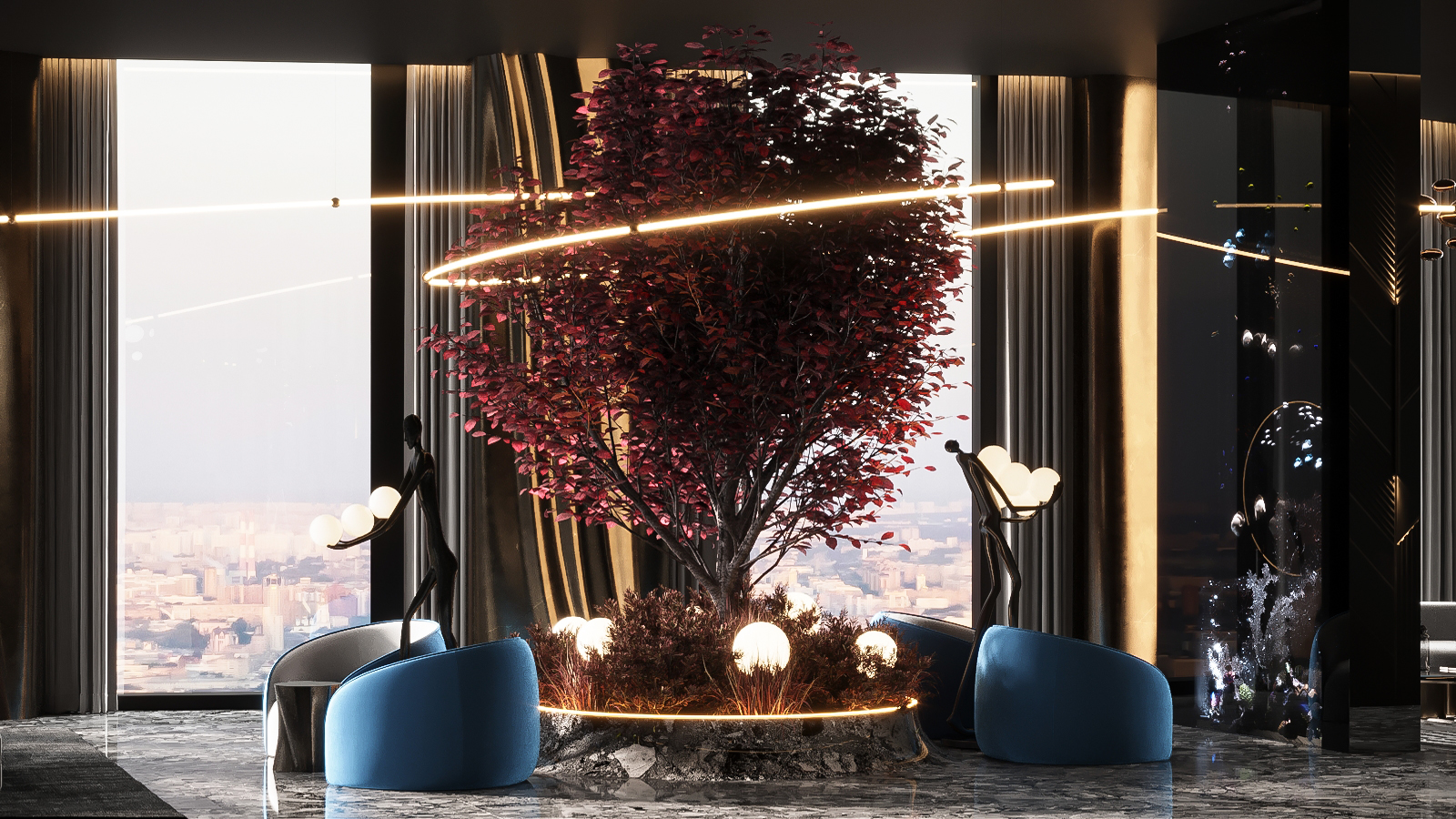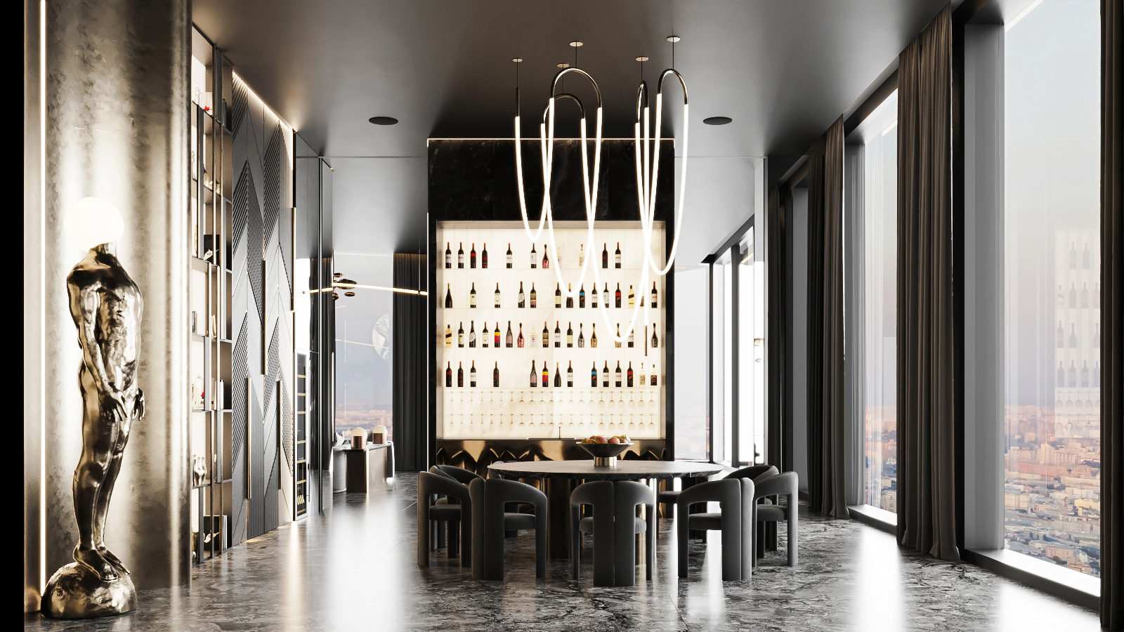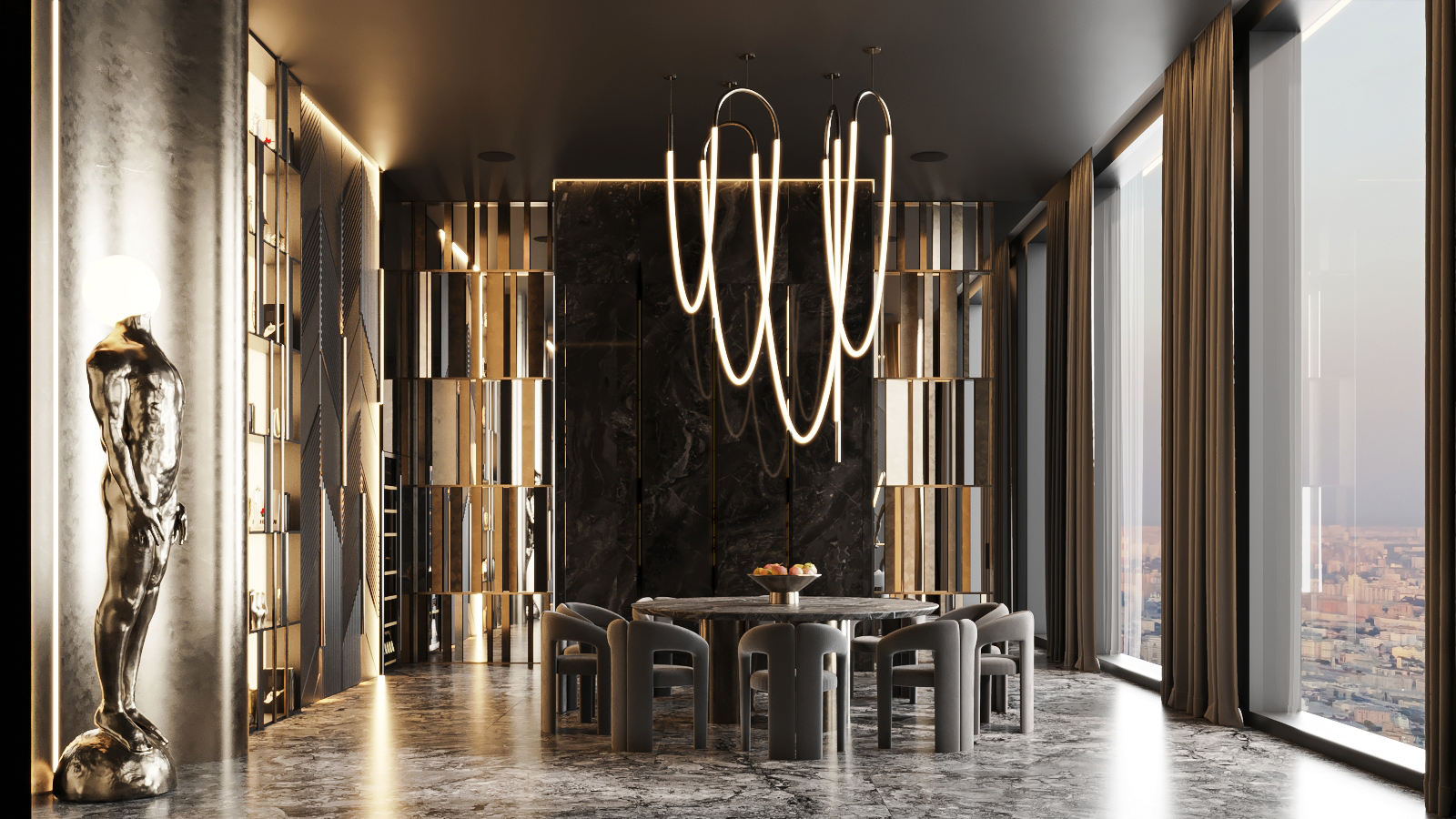 This stunning penthouse is located on the top floor of one of the towers in the Moscow Business Center. The task was to form 2 separate zones - public and private.
