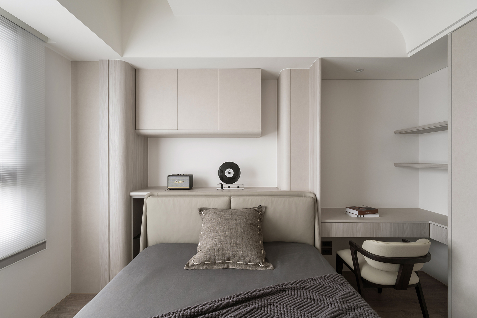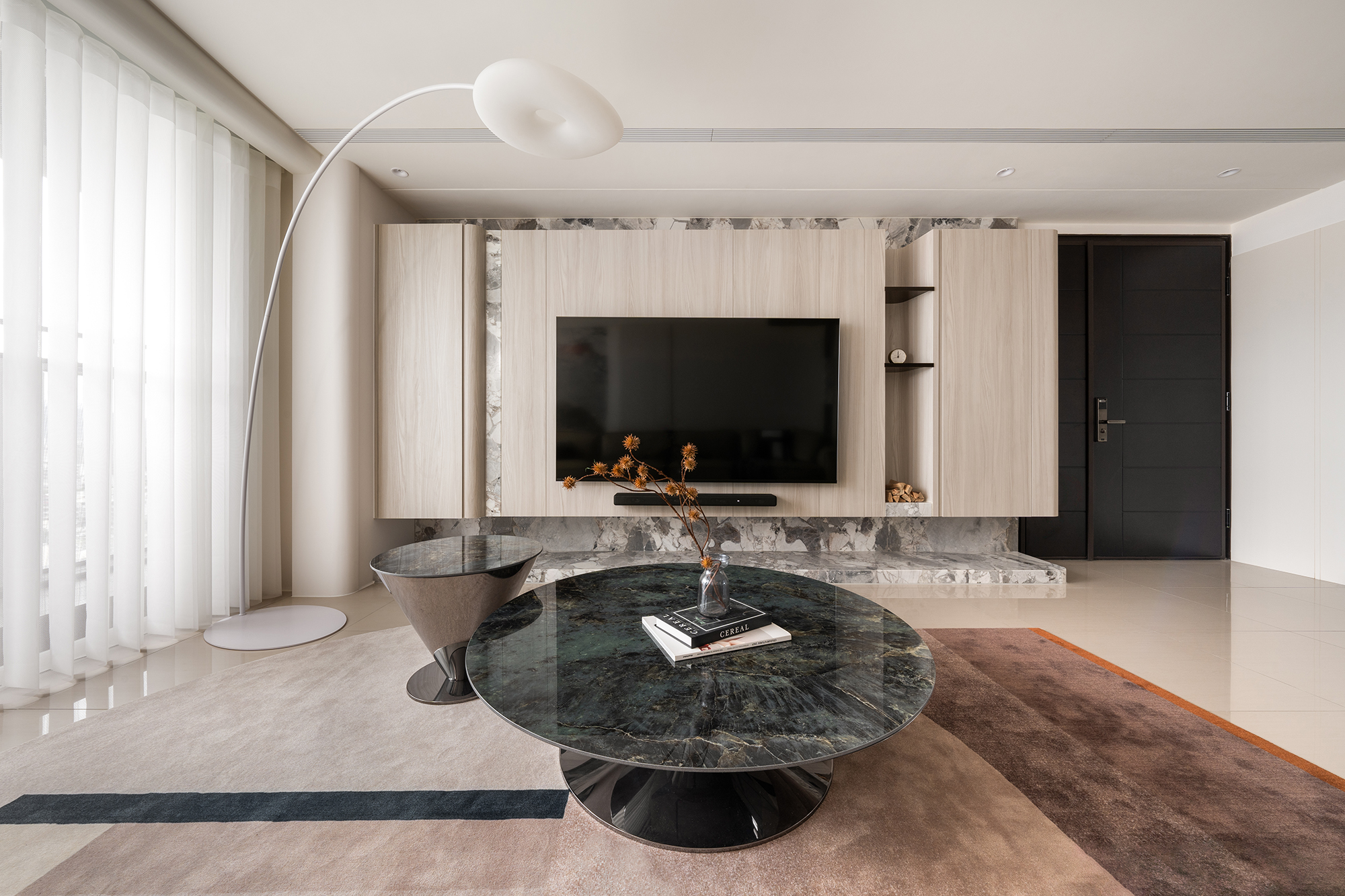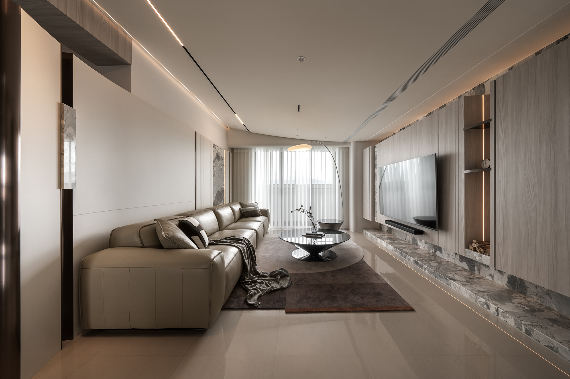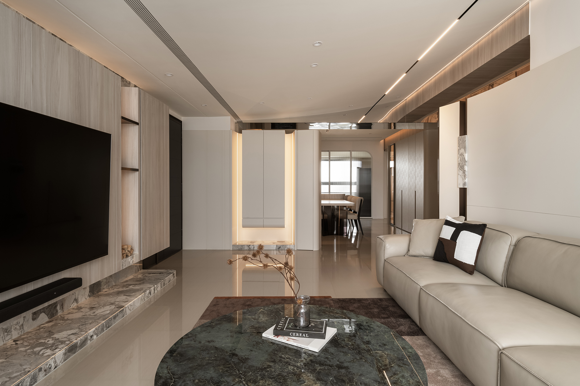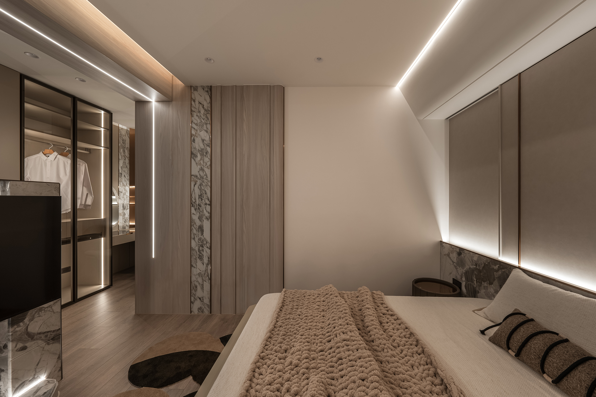 The private area elegantly extends the design language of the public zone, seamlessly blending natural stone and rich wood finishes with graceful curved ceilings and ambient indirect lighting. This combination creates a serene and inviting atmosphere ideal for relaxation. In the bedroom, a striking half-height TV wall serves as a focal point, thoughtfully defining the space while facilitating an effortless flow. This design choice enhances the open ambiance, inviting a sense of comfort and ease. The dedicated dressing room features exquisite transparent glass cabinet doors paired with a chic vanity, artfully balancing aesthetic beauty with functional storage.
