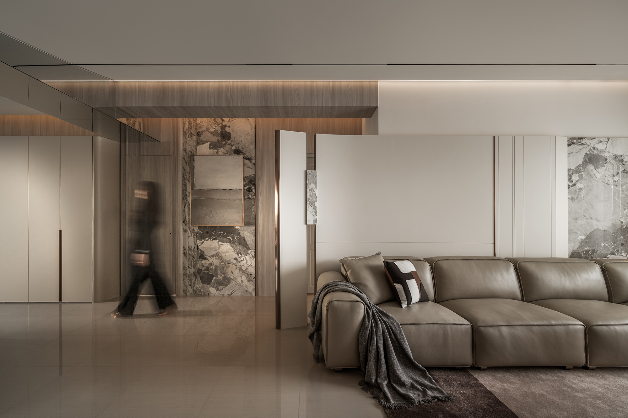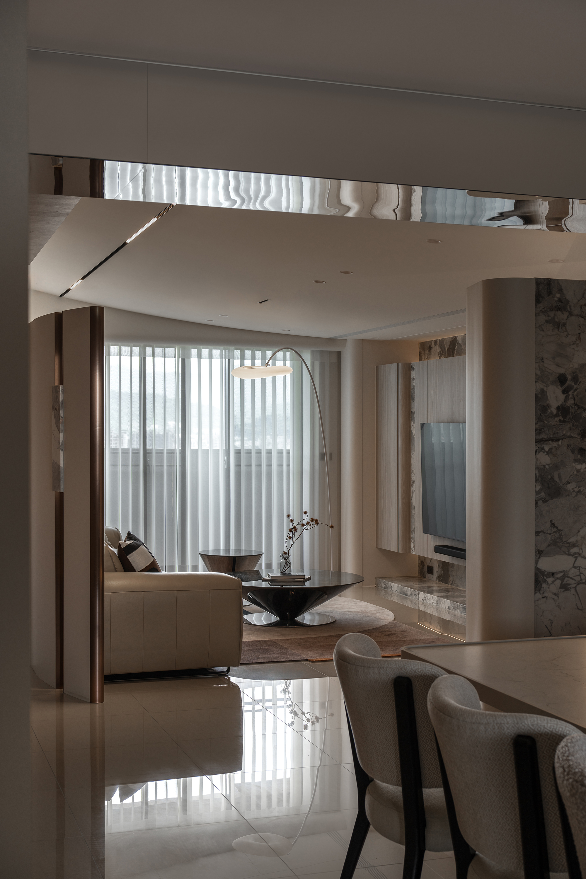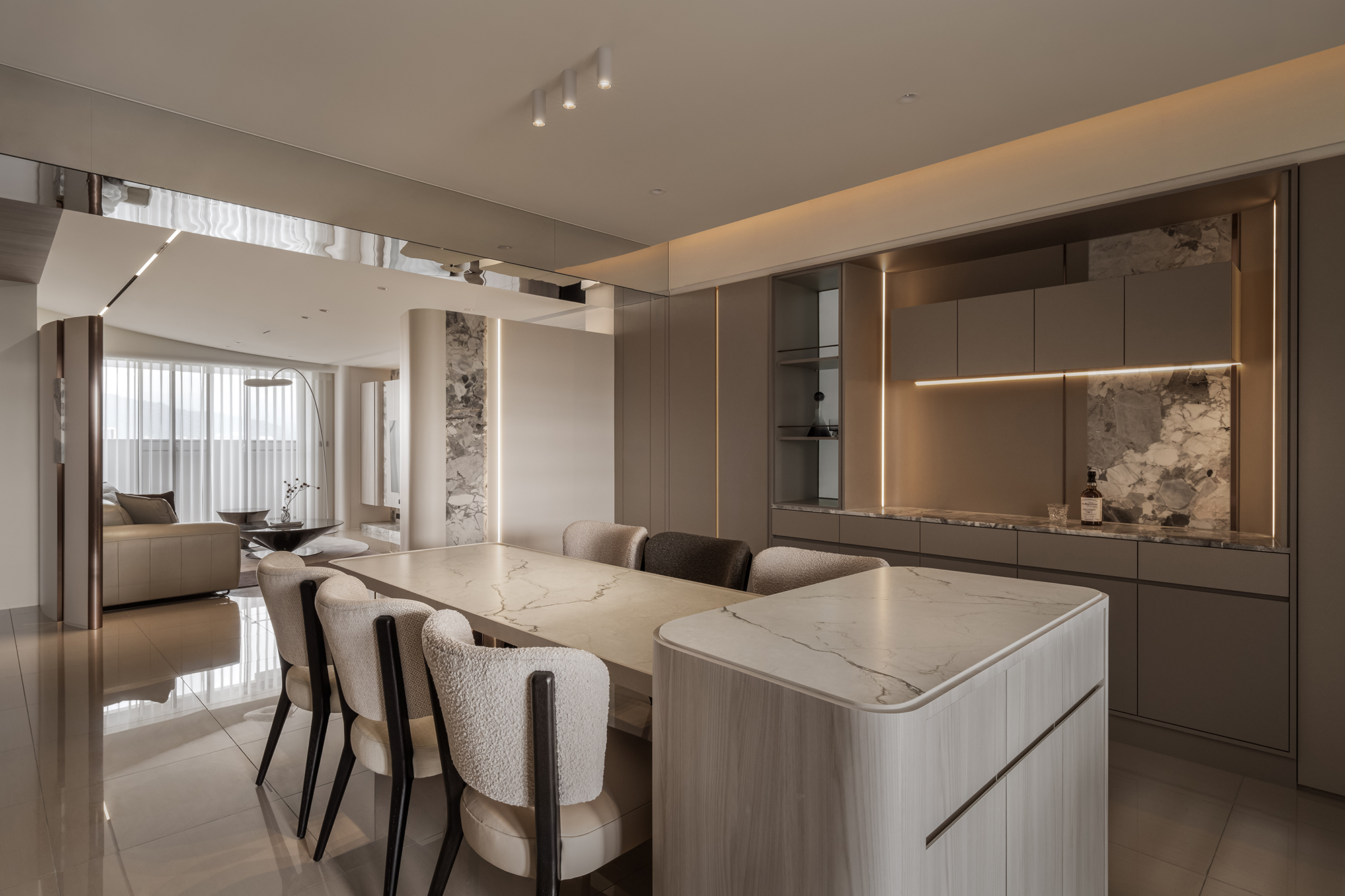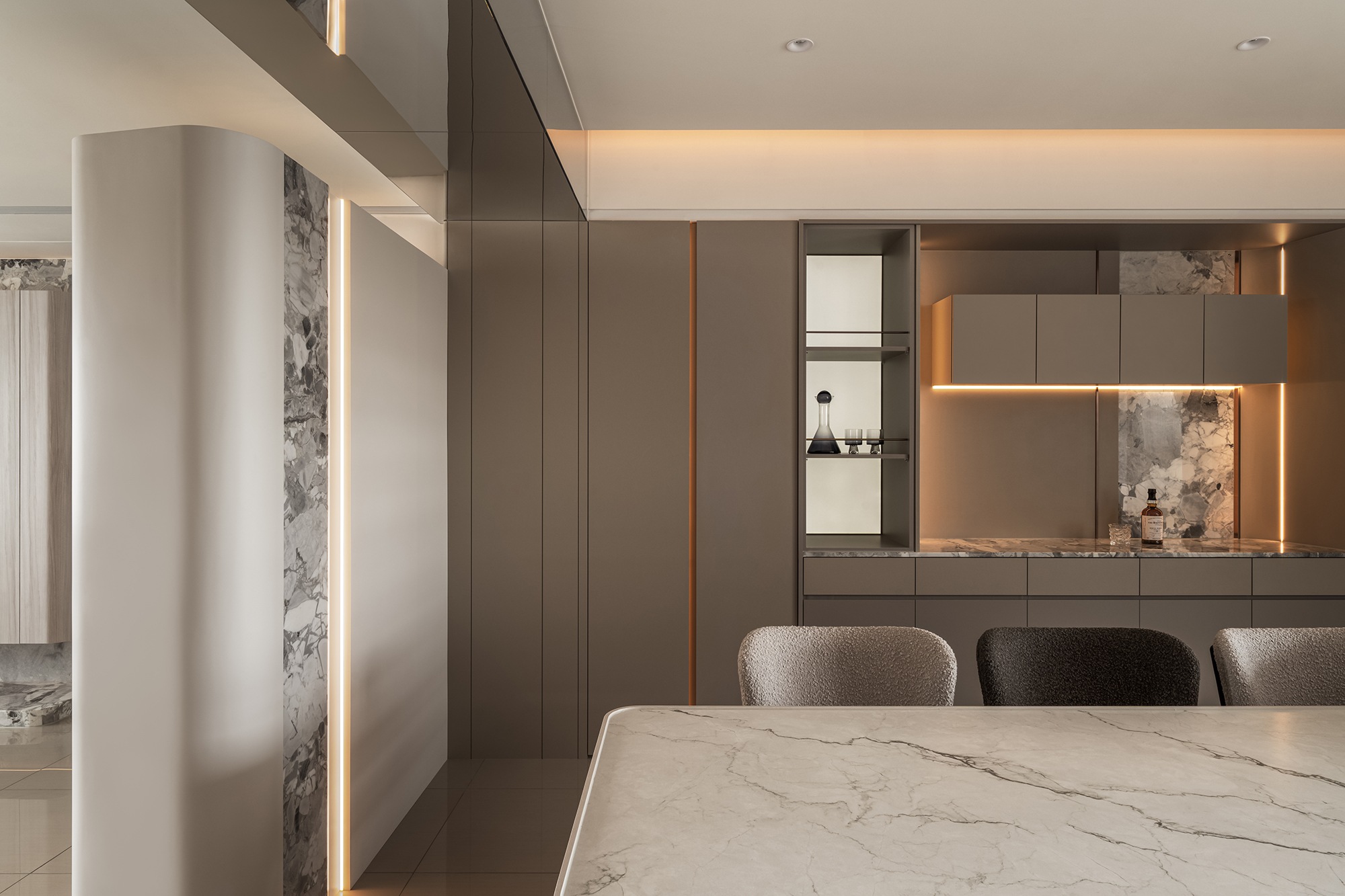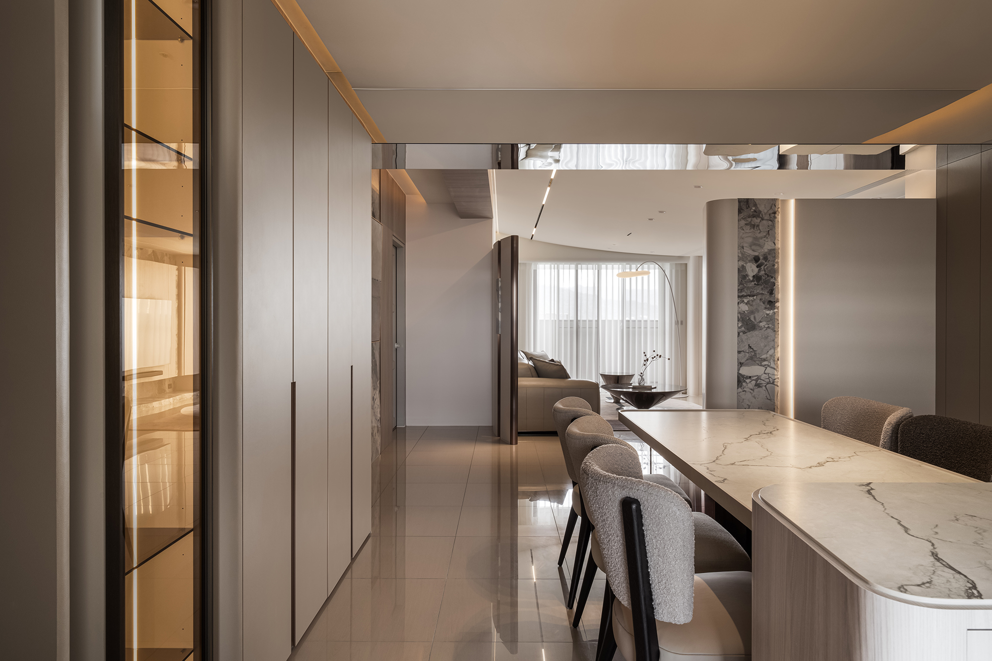 The open-plan public area harmoniously blends the living room and dining area, characterized by a sophisticated palette of gray-white stone textures and light wood tones. This thoughtful combination creates an inviting sense of transparency and continuity throughout the space. The striking feature wall in the living room elevates the visual scale, drawing the eye upward and enriching the overall aesthetic, while discreetly integrated storage units on either side ensure that everything remains organized and clutter-free. Enhancing the elegance of the room, titanium-coated shelves coupled with indirect lighting serve to accentuate carefully curated objects, infusing the atmosphere with a refined sophistication.
