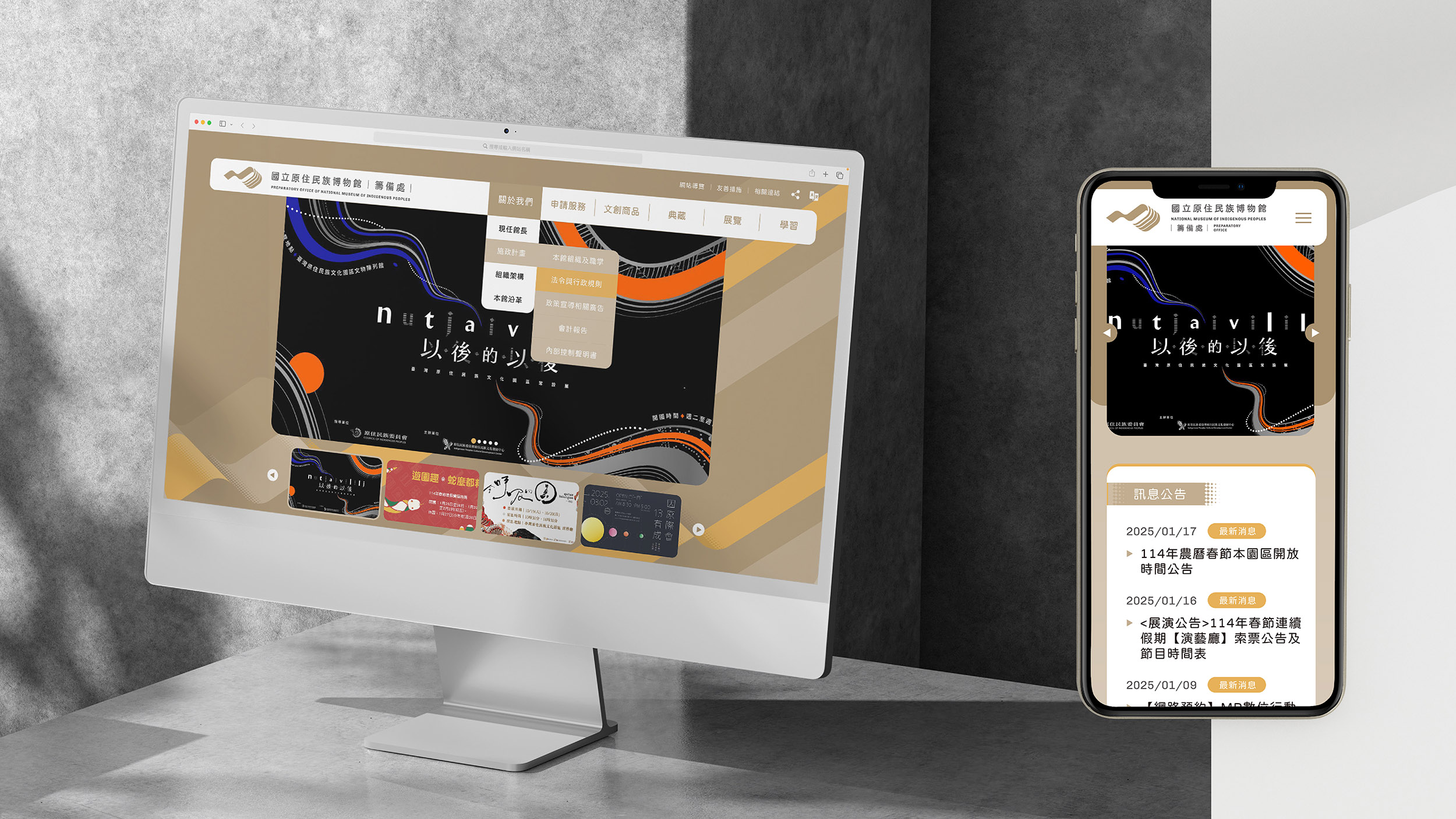 Within the structure of the logo, four strands signify four cultural groups: Taiwan’s Indigenous peoples, the Plains communities, the greater Austronesian family, and other Indigenous nations across the globe. Their interwoven lines represent dialogue and collaboration, visualizing the museum’s role as a platform for intercultural exchange and solidarity.