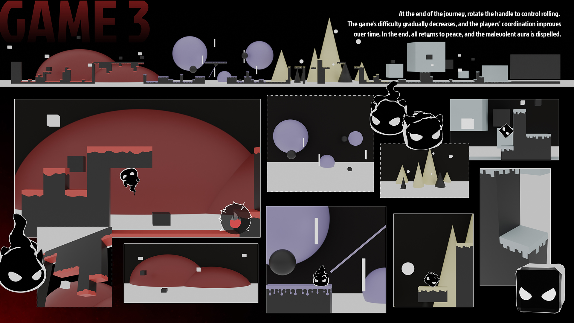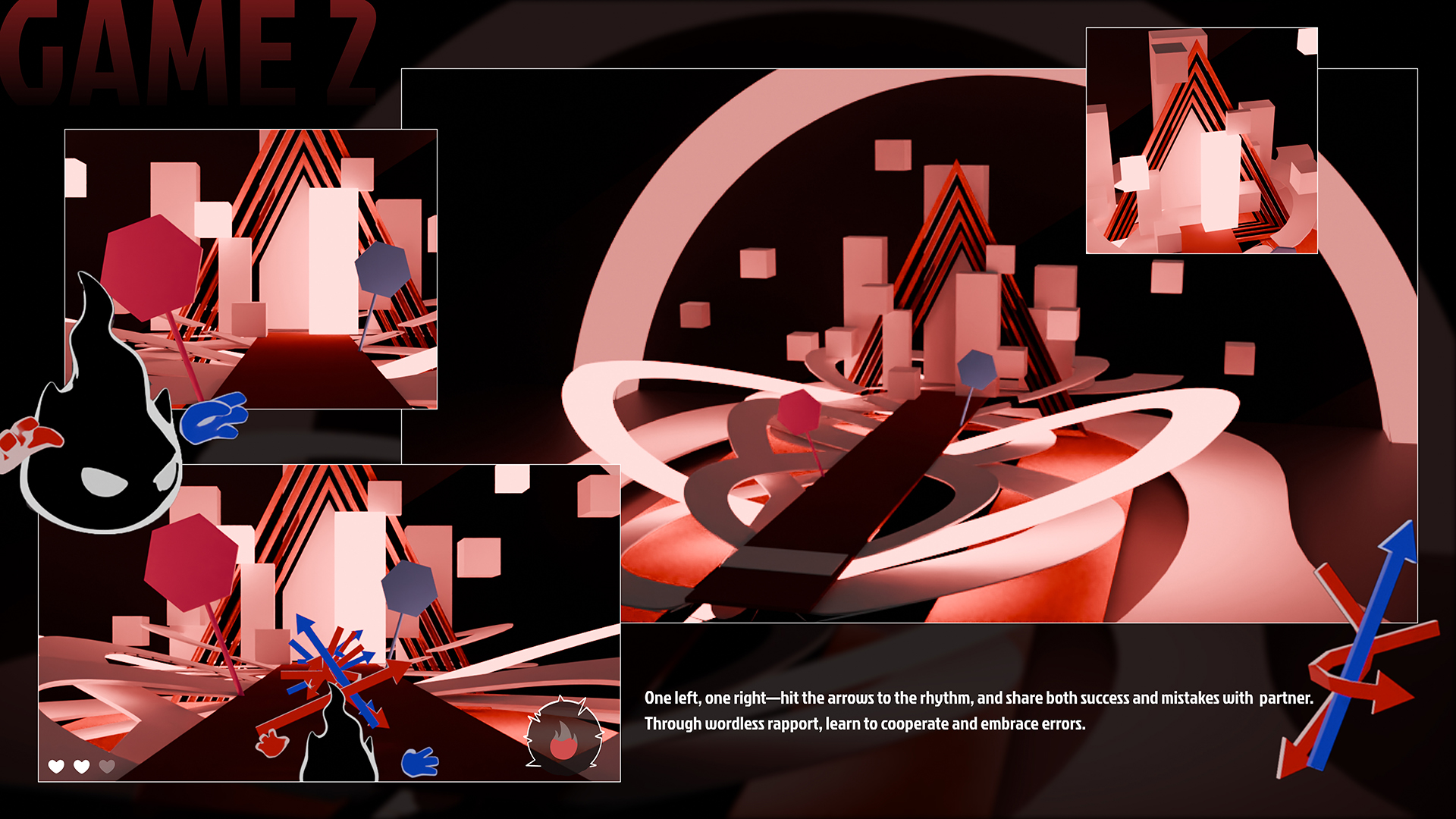 The game itself is a two-player cooperative experience that integrates motion tracking and emotional feedback across three sub-games. The game contains three sub-sections: a cooperative bullet-hell shooter with asymmetrical controls, a rhythm-based challenge demanding synchronized reactions, and a 3D coordination test where players align diagonals of the character. Rising Liqi intensifies red light, noise, and airbag pressure, while the character’s gradual cubic transformation symbolizes the mastering of hostility.