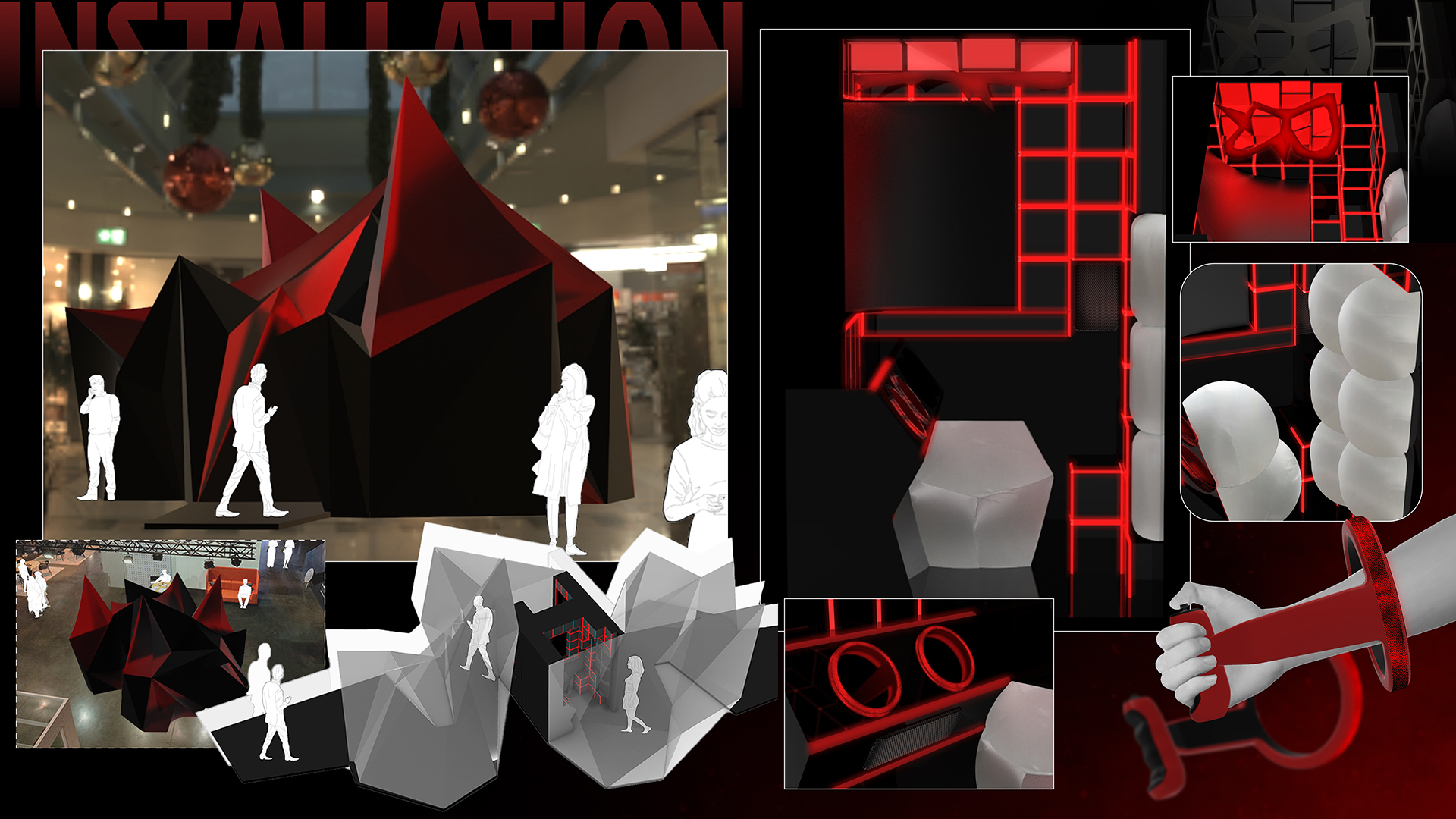 The installation reflects the spirit of Liqi through form and environment. Its sharp, irregular exterior evokes hostility, while entering, the interior forces players into uncomfortable, cave-like passageways that prime them for tension. The game chamber, inspired by the claustrophobic intimacy of telephone boxes, uses red light, noise, and inflatable airbags to respond dynamically to in-game Liqi levels, exerting both psychological and physical pressure.