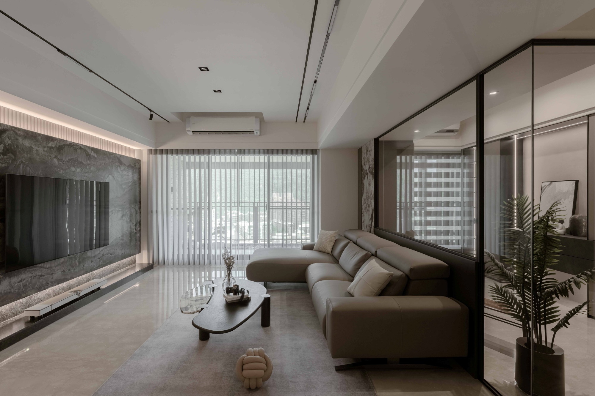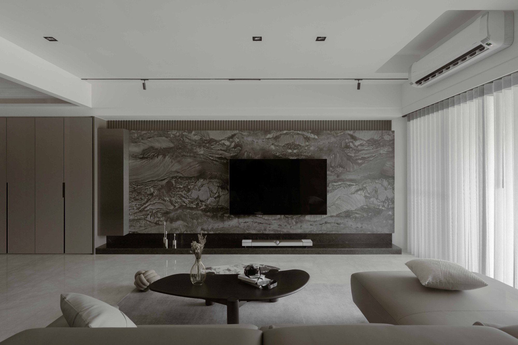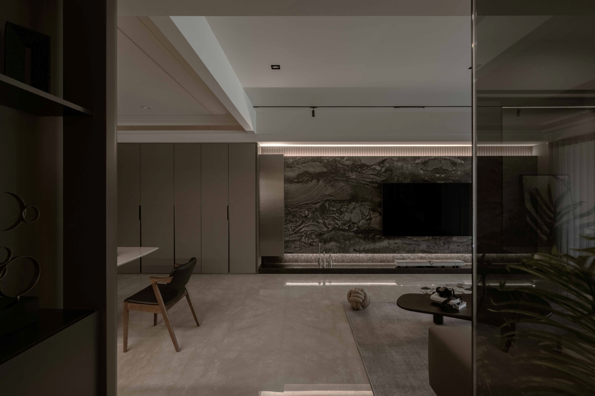 In the public sphere, a main focal scene is supported by multiple secondary elements, building depth and layering into the composition. To counter the heaviness of deep tones, the design embraces detachment and asymmetrical balance. Soft light strips gently guide the eye, allowing the volumes to gain breathing room as they unfold in space.
