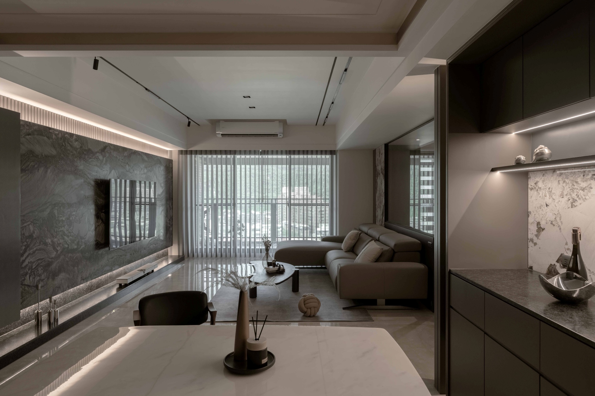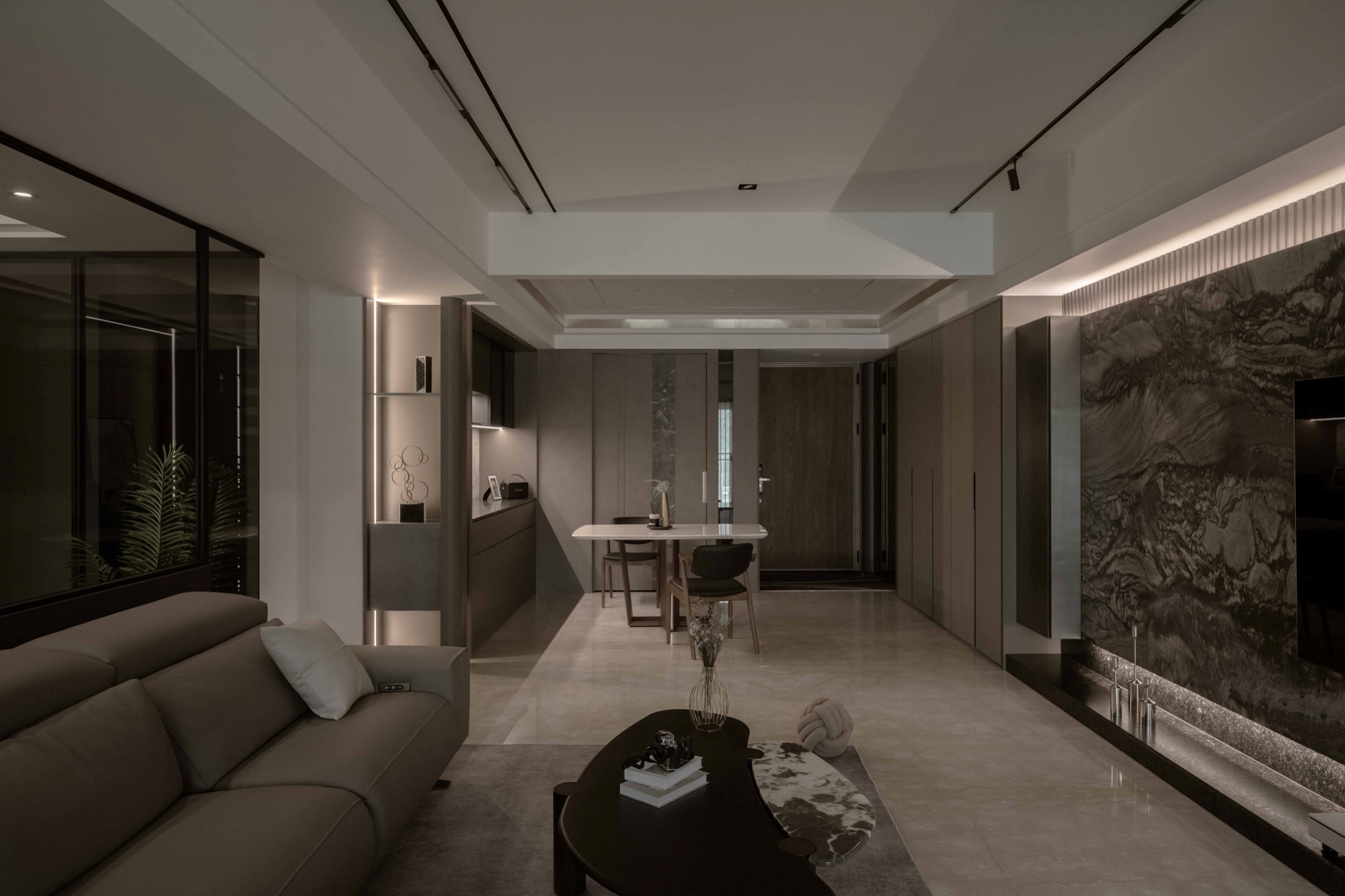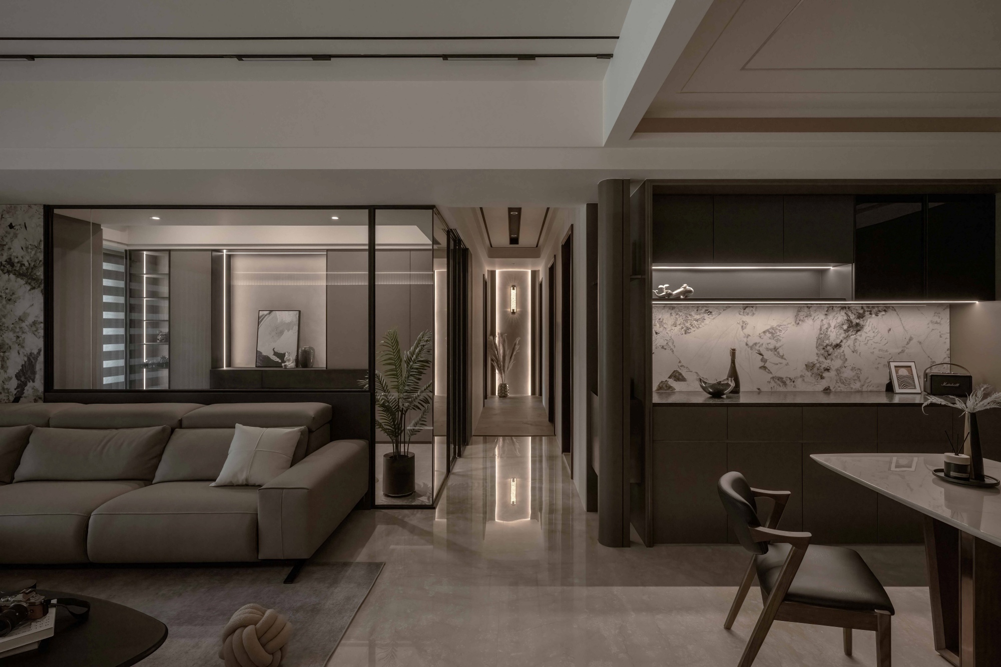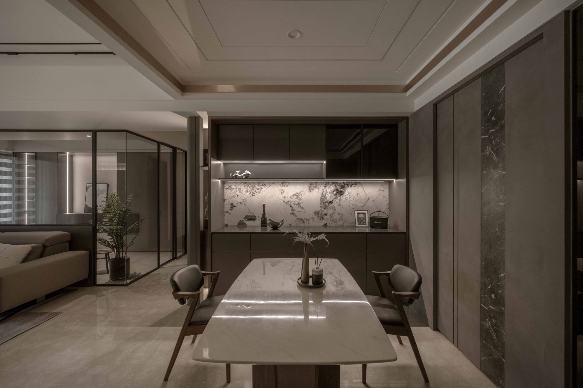 Featuring the same color scheme for a seamless flow, the shoe bench at the entrance is both stylish and practical. The natural light filtering through gray glass imparts a subtle sense of lightness in motion. With veining that flows like the graceful spread of ink, the marble TV wall becomes a captivating focal point. Its presence is softened by the understated contrast of leather textures. Through asymmetrical composition and a rich mix of materials, the facade stands out, its layers creating a sense of movement within stillness, while quietly enriching the atmosphere. The sofa backdrop and the wainscot alongside the dining sideboard extend the stone finishes, creating a harmonious dialogue between materials. With its curves and carved-out details, the dining cabinet allows light to pass through, letting brightness and shadow weave a delicate dance. Freed from the rigidity of sharp angles, the space is elevated by the subtle sophistication of metallic accents.