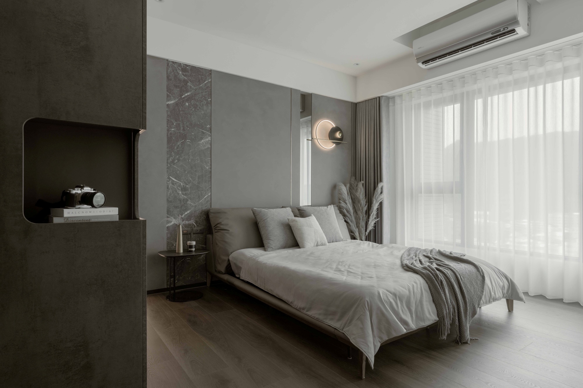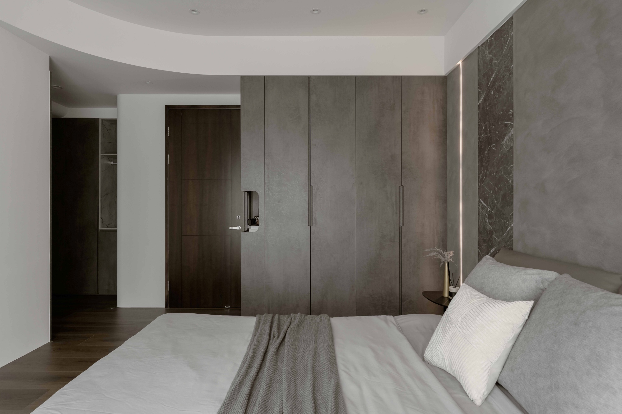 Marked by a gentle change in flooring, the corridor leading to the private sphere forms an understated threshold, guiding one inward. A feature wall with a graceful curve eases the visual tension, leading the gaze inward with a composed sense of ritual. The master bedroom continues the neutral gray palette, with a flowing arc in the ceiling that adds a touch of softness. The hand-brushed wall behind the bed introduces warmth, as pure hues and lighting let body and mind gently unwind.