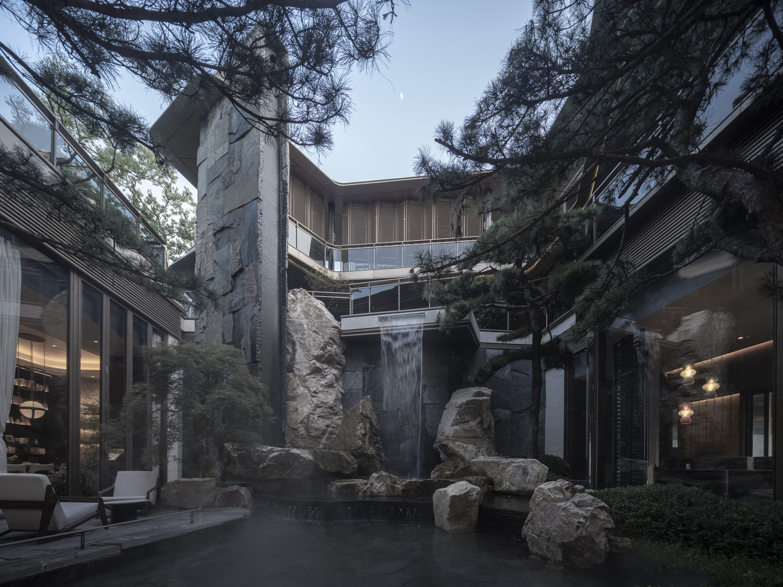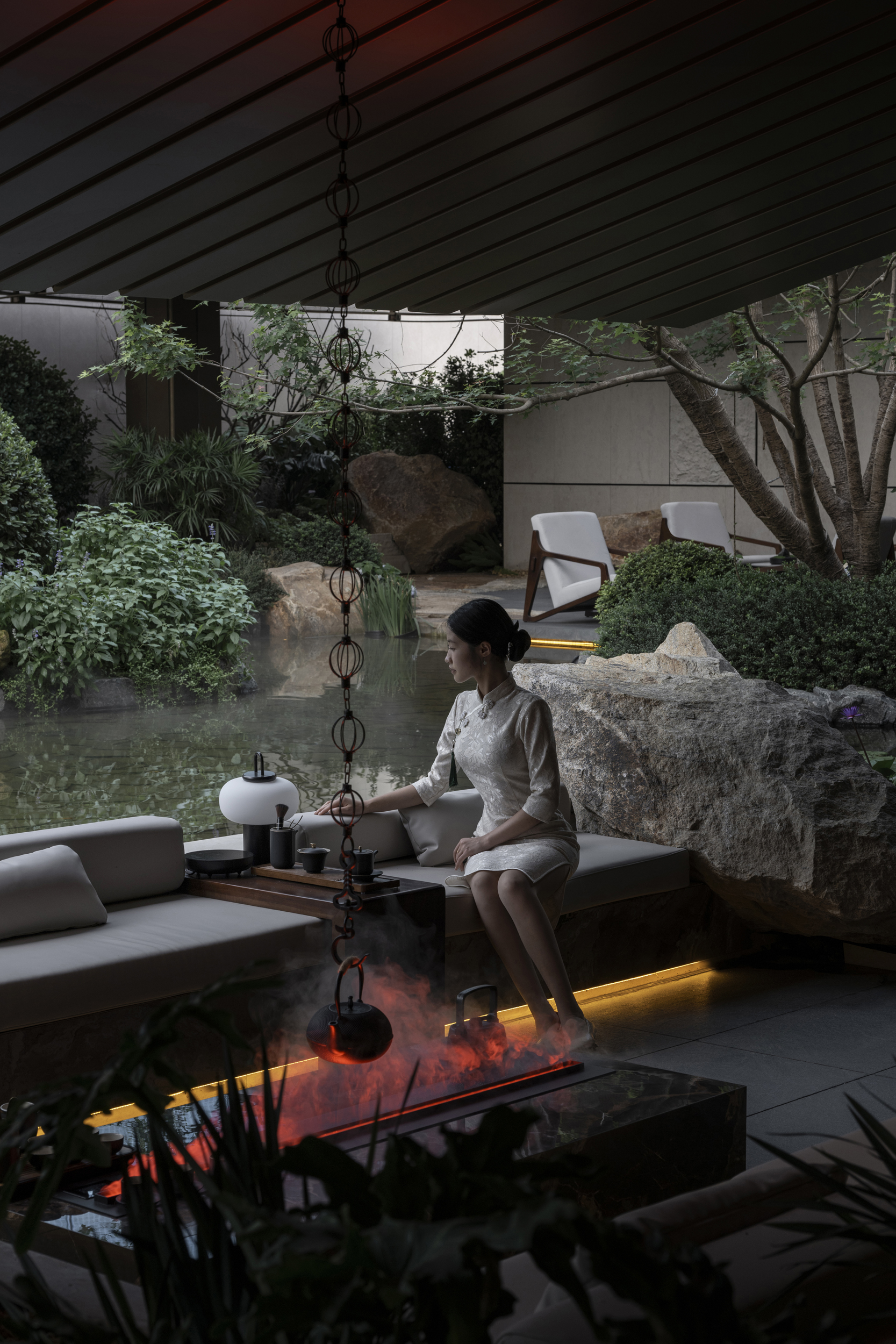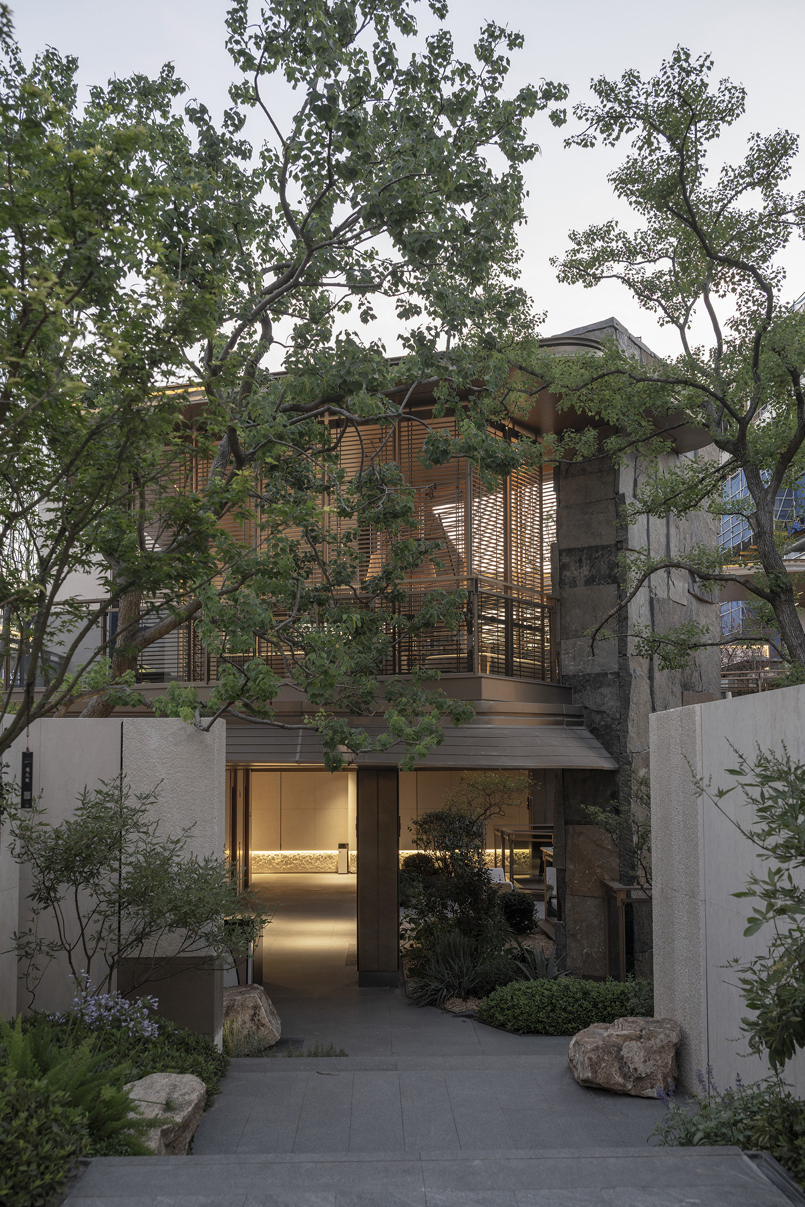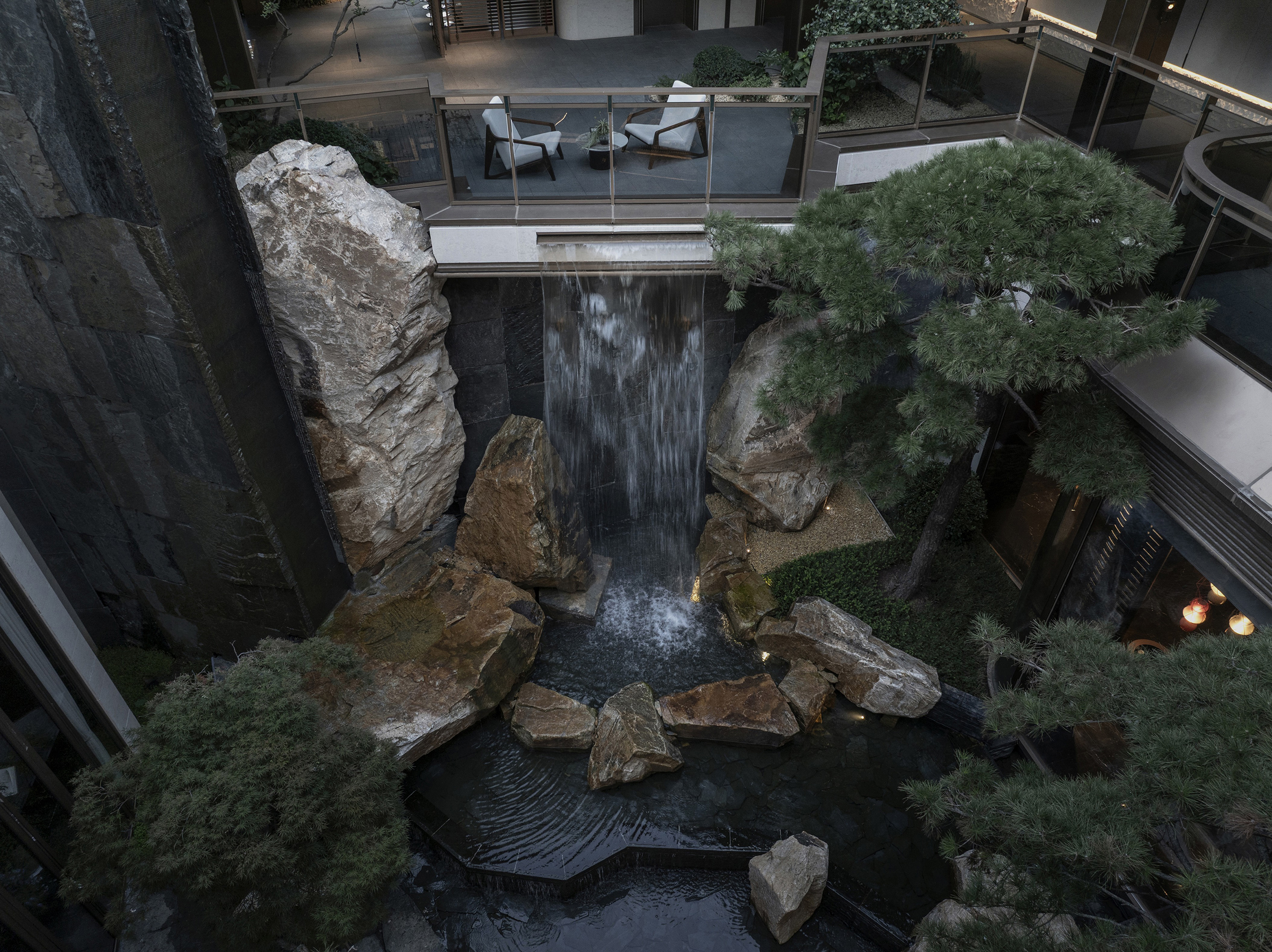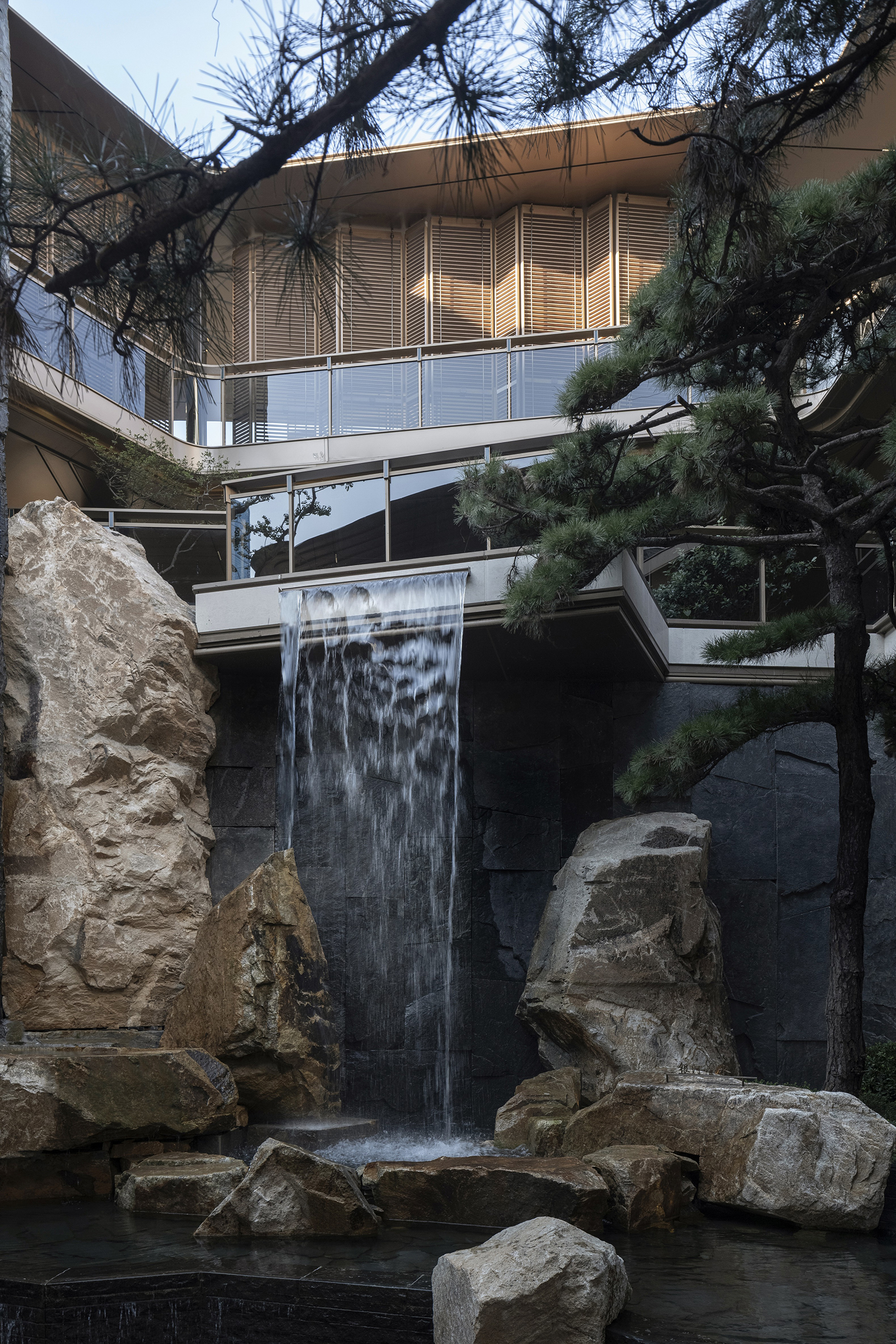 Aesthetically, the project conveys refined, understated elegance from overall ambiance to detailed textures. The entrance features a symmetrical arrangement of buildings and landscape walls, a 128-meter landscape façade, a 43-meter-wide main gate, and a "Pine King" black pine atop rock formations, creating a ceremonial entry imbued with order and nobility. Inspired by the Song Dynasty painting Travelers Among Mountains and Streams, the core sunken courtyard includes a three-tiered vertical landscape garden and a 14-meter "flying cascade" waterfall, with cascades and multi-level viewing platforms recreating the ethereal experience of a "pavilion amid suspended mountains." A landscape corridor beneath the eaves revives the "Four Elegances"—incense, flower arrangement, tea, and calligraphy—imbuing the space with cultural depth and experiential quality.