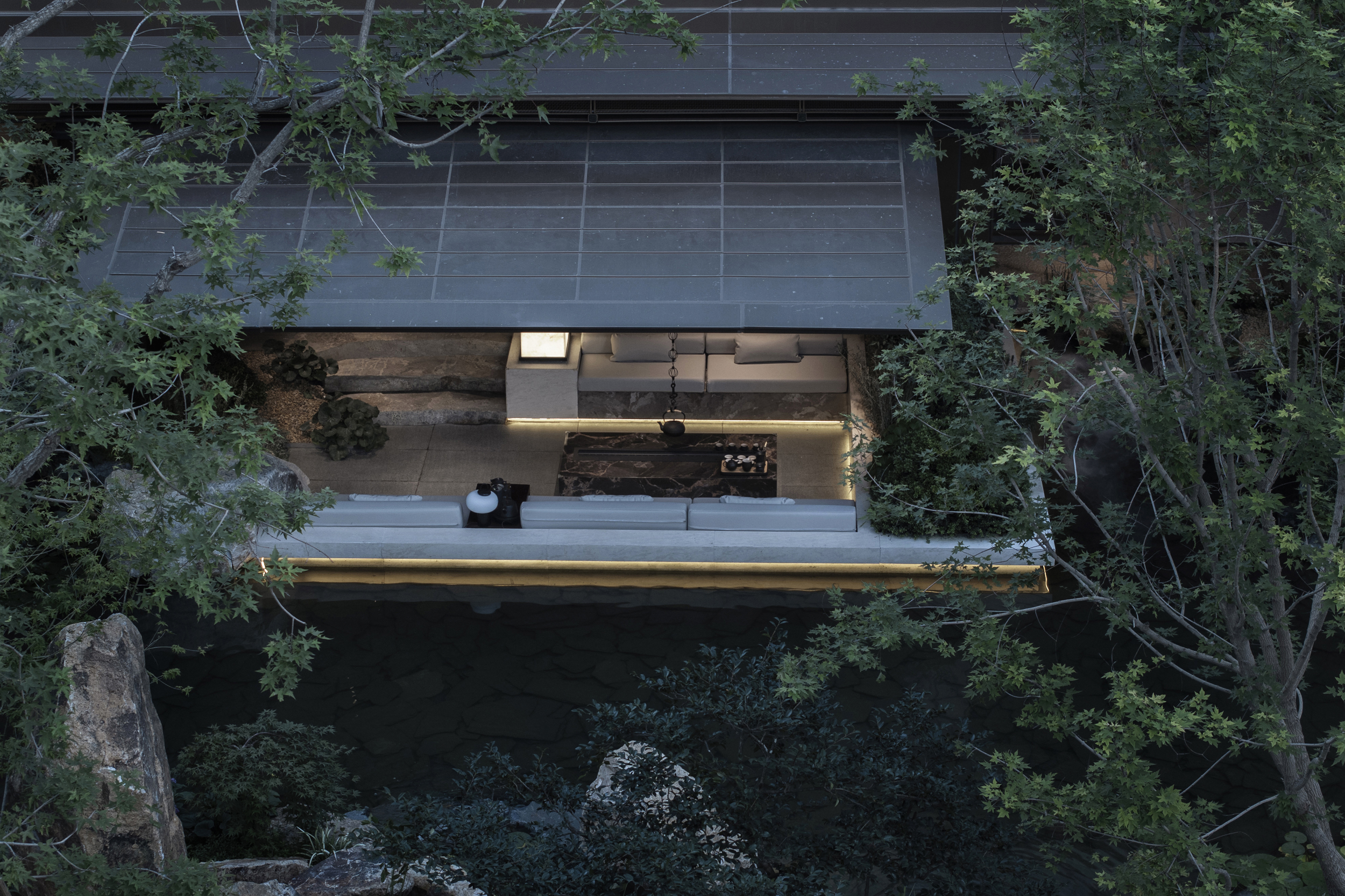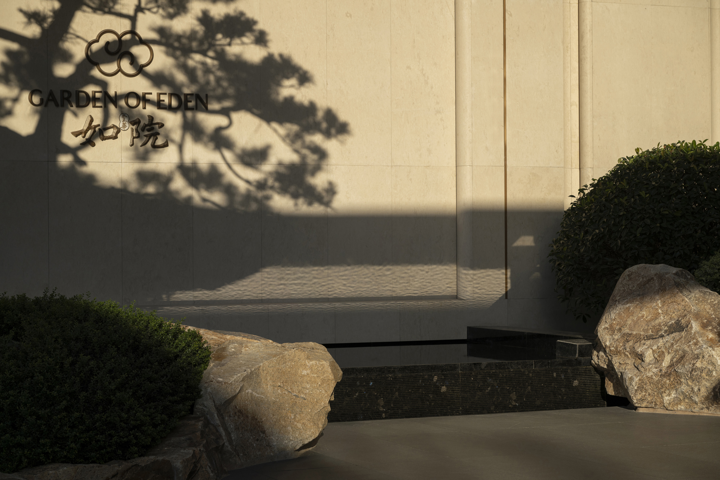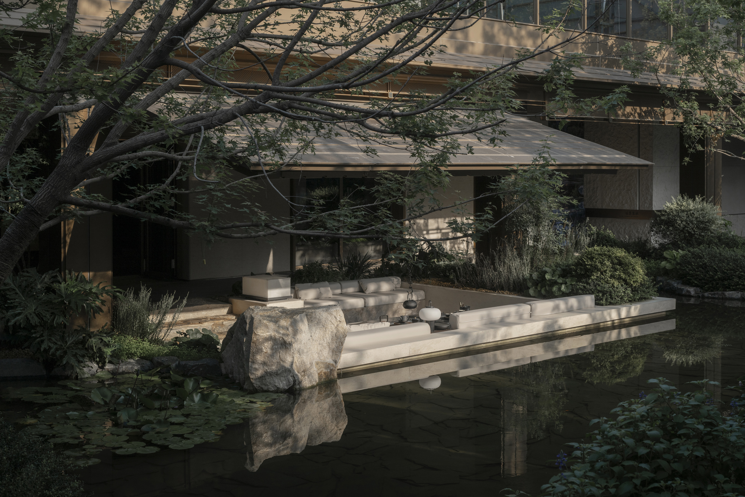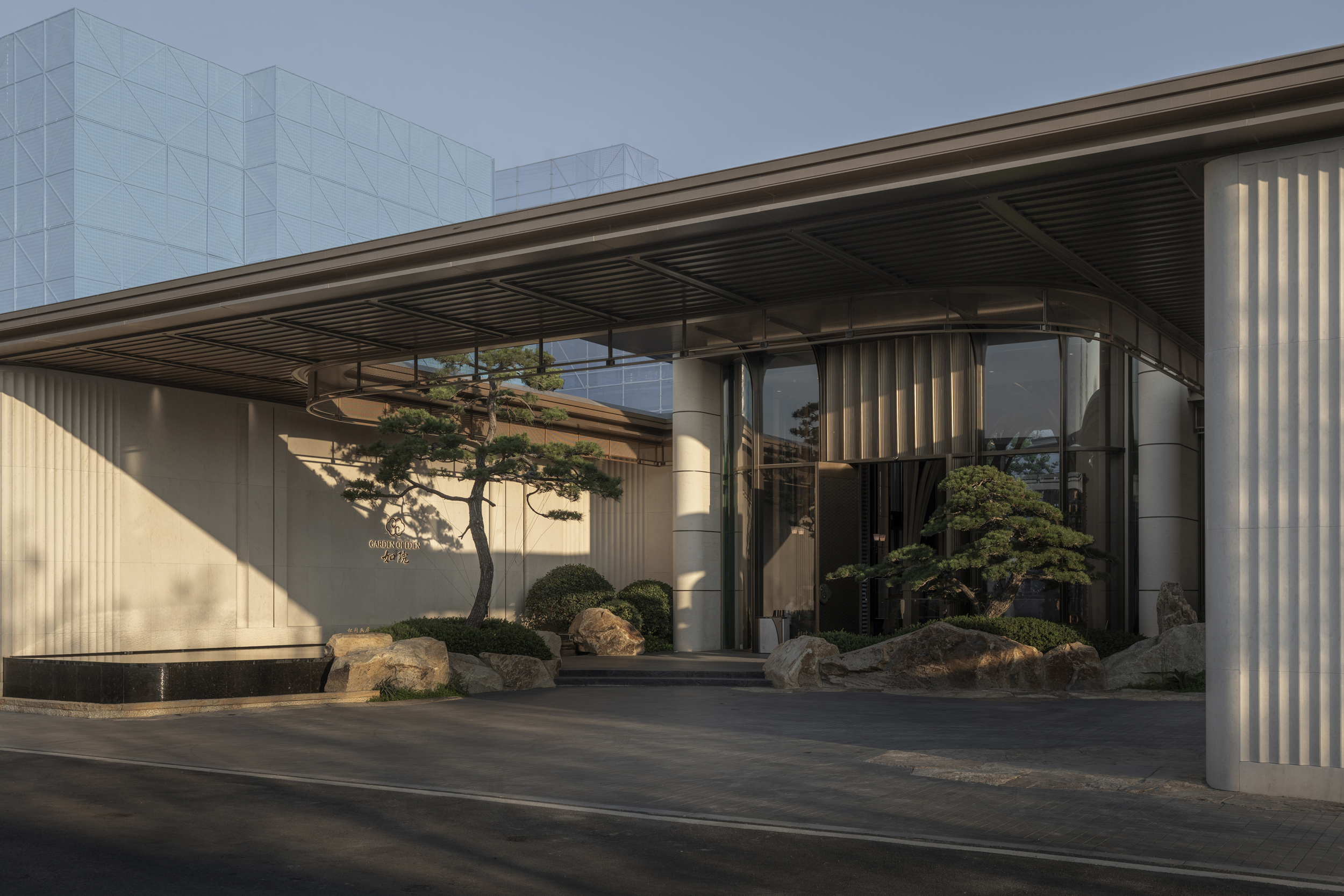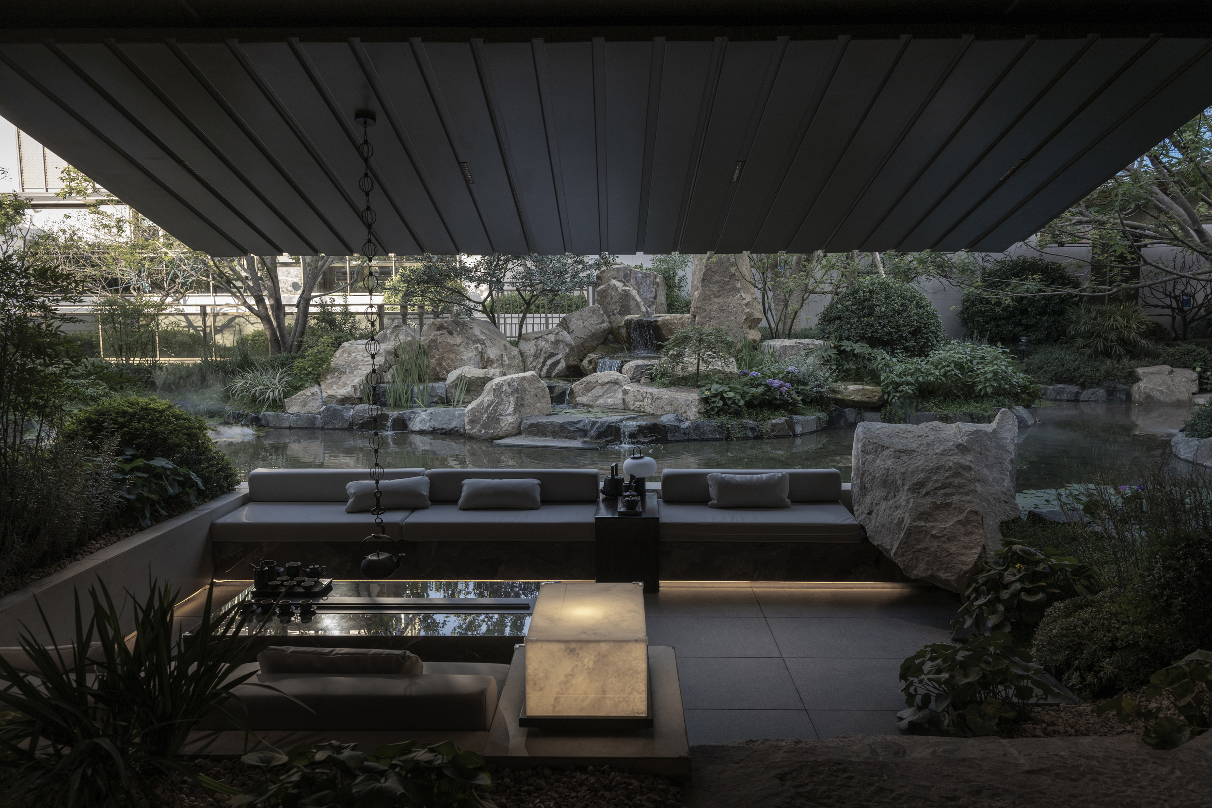 Aesthetically, the project conveys refined, understated elegance from overall ambiance to detailed textures. The entrance features a symmetrical arrangement of buildings and landscape walls, a 128-meter landscape façade, a 43-meter-wide main gate, and a "Pine King" black pine atop rock formations, creating a ceremonial entry imbued with order and nobility. Inspired by the Song Dynasty painting Travelers Among Mountains and Streams, the core sunken courtyard includes a three-tiered vertical landscape garden and a 14-meter "flying cascade" waterfall, with cascades and multi-level viewing platforms recreating the ethereal experience of a "pavilion amid suspended mountains." A landscape corridor beneath the eaves revives the "Four Elegances"—incense, flower arrangement, tea, and calligraphy—imbuing the space with cultural depth and experiential quality.
