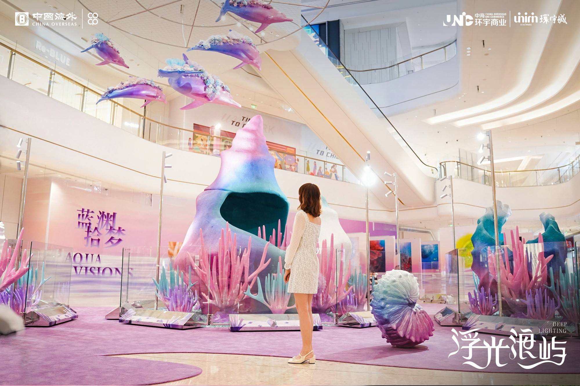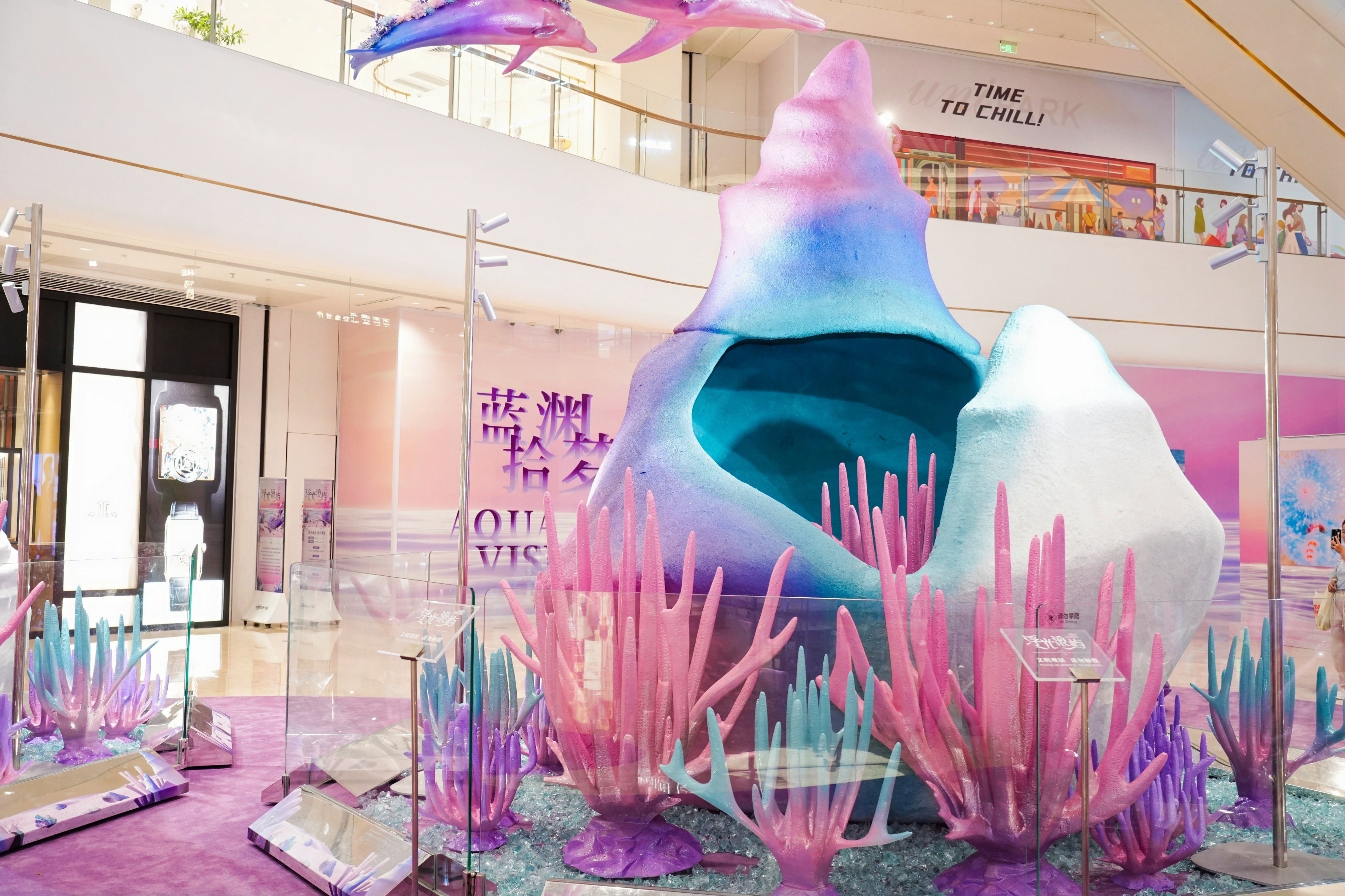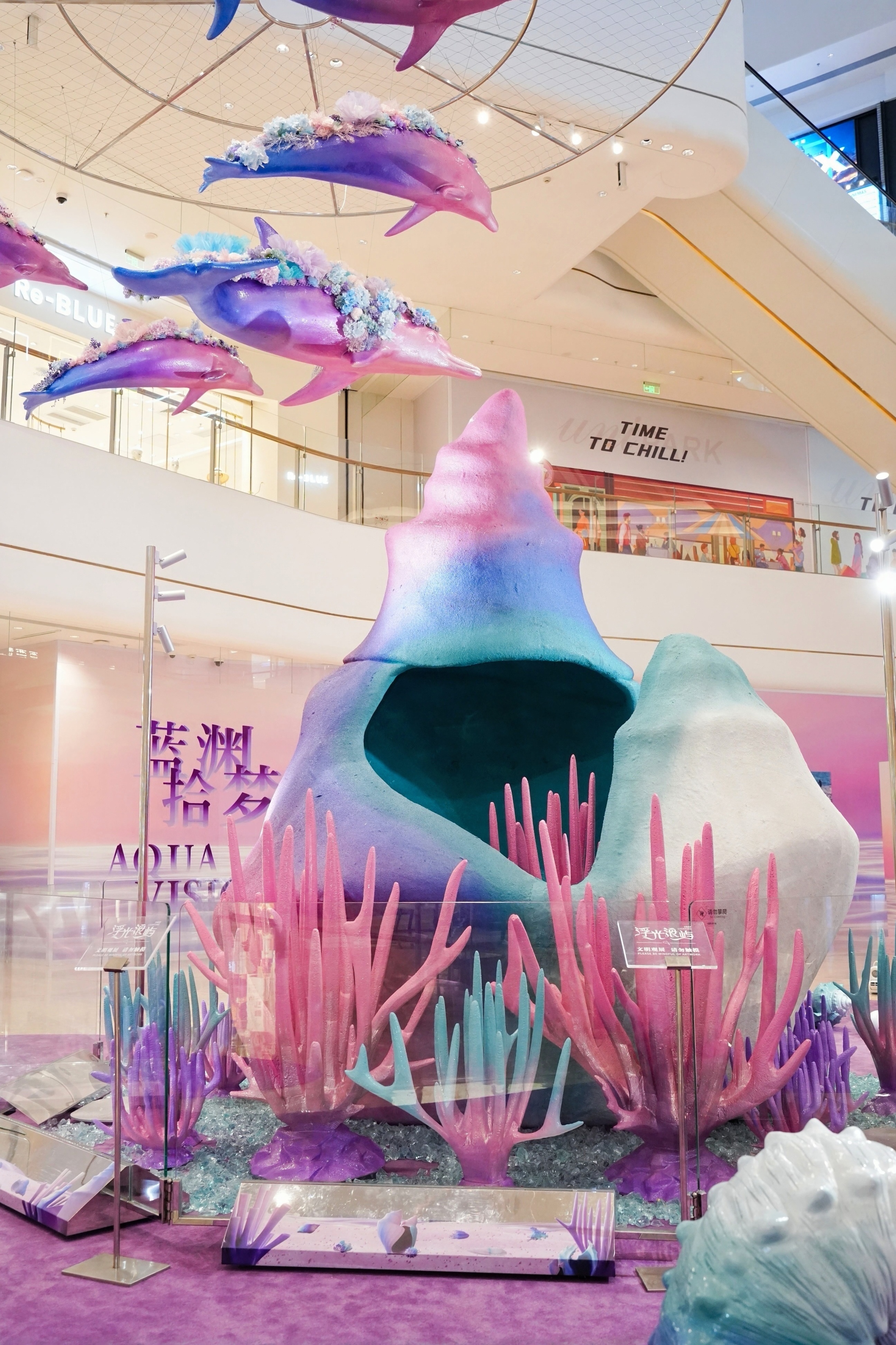 The project draws inspiration from the play of light and shadow in the depths of the ocean, the rhythmic motion of tides, and the morphological characteristics of marine creatures. The installation of giant conches and suspended dolphins serves as the visual focus, enhancing the immersive experience and making a lasting impression. Blue and purple as the main colors, complemented by an ingenious blend of lighting design, projection technology, and transparent or reflective materials, recreate the atmosphere of the tranquil deep-ocean environment.